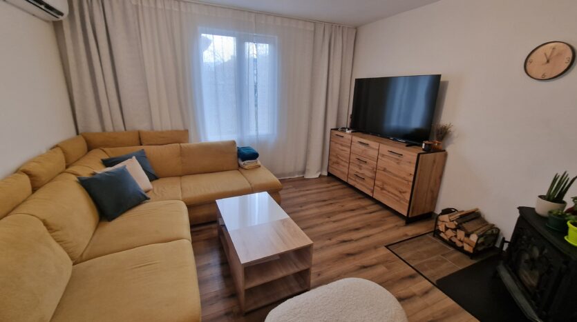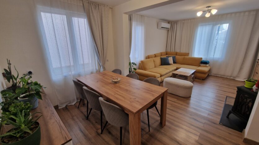 – Living room with dining area and a large corner sofa bed, coffee table and log fireplace