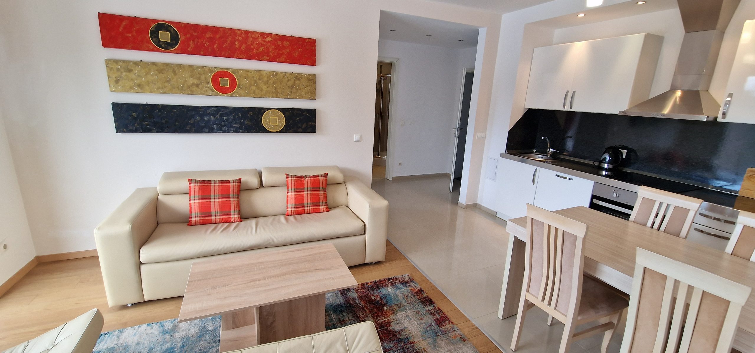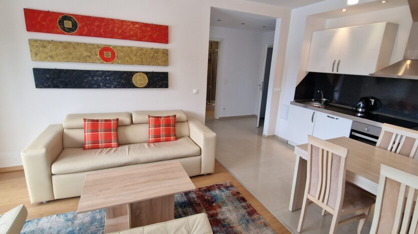 This elegant furnished apartment consists of an entrance hallway, living/dinning room with an equipped kitchenette with an oven, ceramic hob, extractor, dishwasher, refrigerator and a dinning table with chairs. The lounge area is cozy furnished with a sofa, two armchairs, coffee table and a TV. There are two balconies with beautiful views of Pirin and Rila mountains and the forest park. The main bedroom is beautifully furnished with a double bed, bedside tables, a dressing table and a wardrobe. The second bedroom has two single beds, bedside tables, a dressing table and a wardrobe. The bathroom is equipped with a sink, toilet and a shower cubicle and bath.