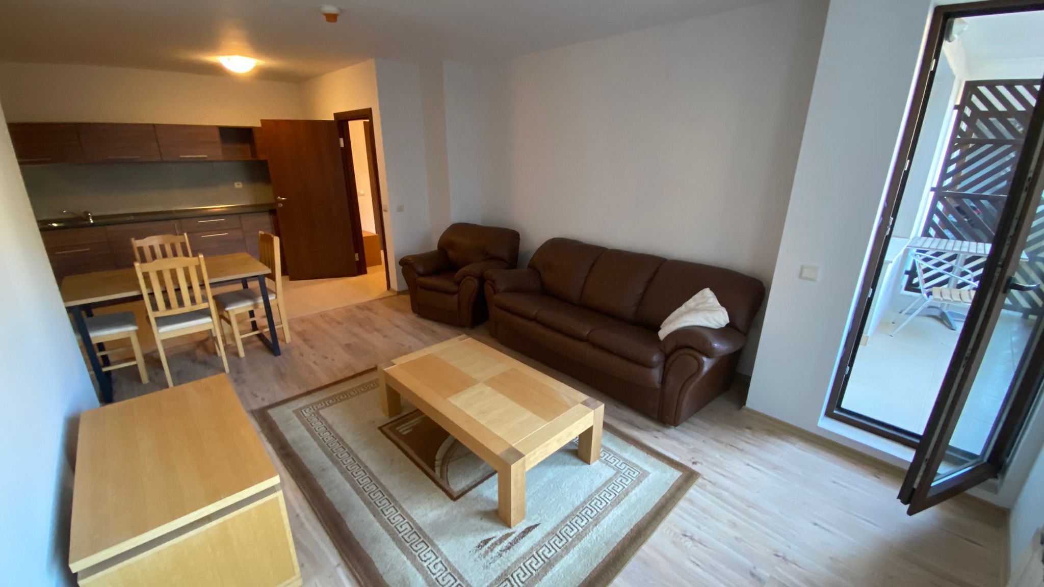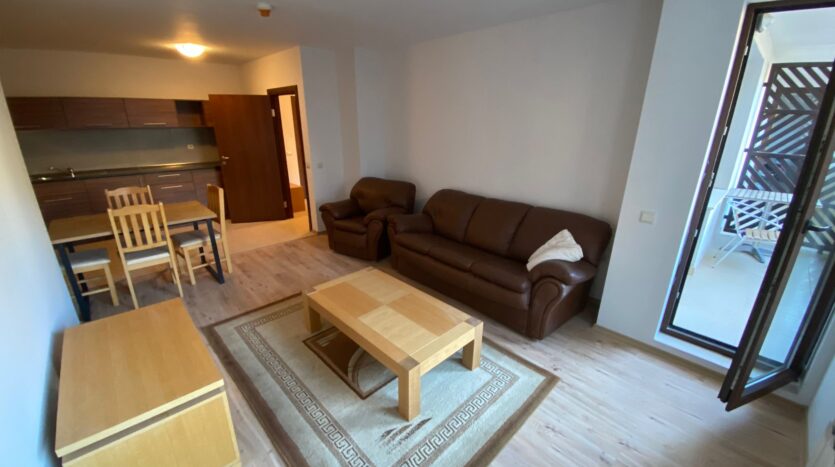 The apartment consists of an entrance hallway, a living room with a kitchen equipped with a ceramic hob, extractor, refrigerator and a dining table with chairs. The lounge area is cozy furnished with a leather furniture set with a coffee table. The main bedroom is beautifully furnished with solid wood furniture set consists of a double bed, bedside tables, chest of drawers and a big wardrobe. There is a small storage room in this bedroom. The second bedroom is furnished with a double bed, bedside tables and a wardrobe. The living room and the second bedroom have access to the South-East facing balcony with nice views of Pirin mountains and surrounding nature. The bathroom is equipped with a shower cabin, sink, toilet and a hot water boiler.