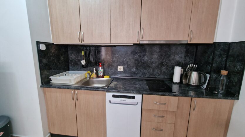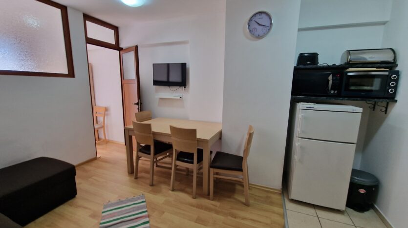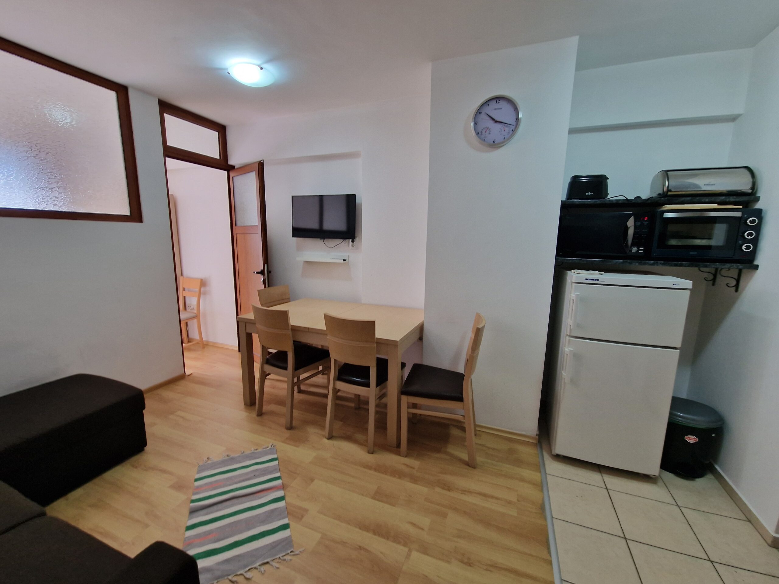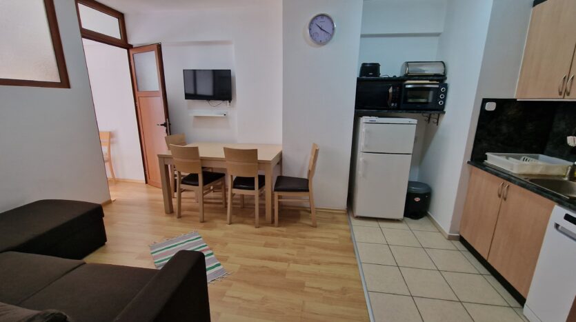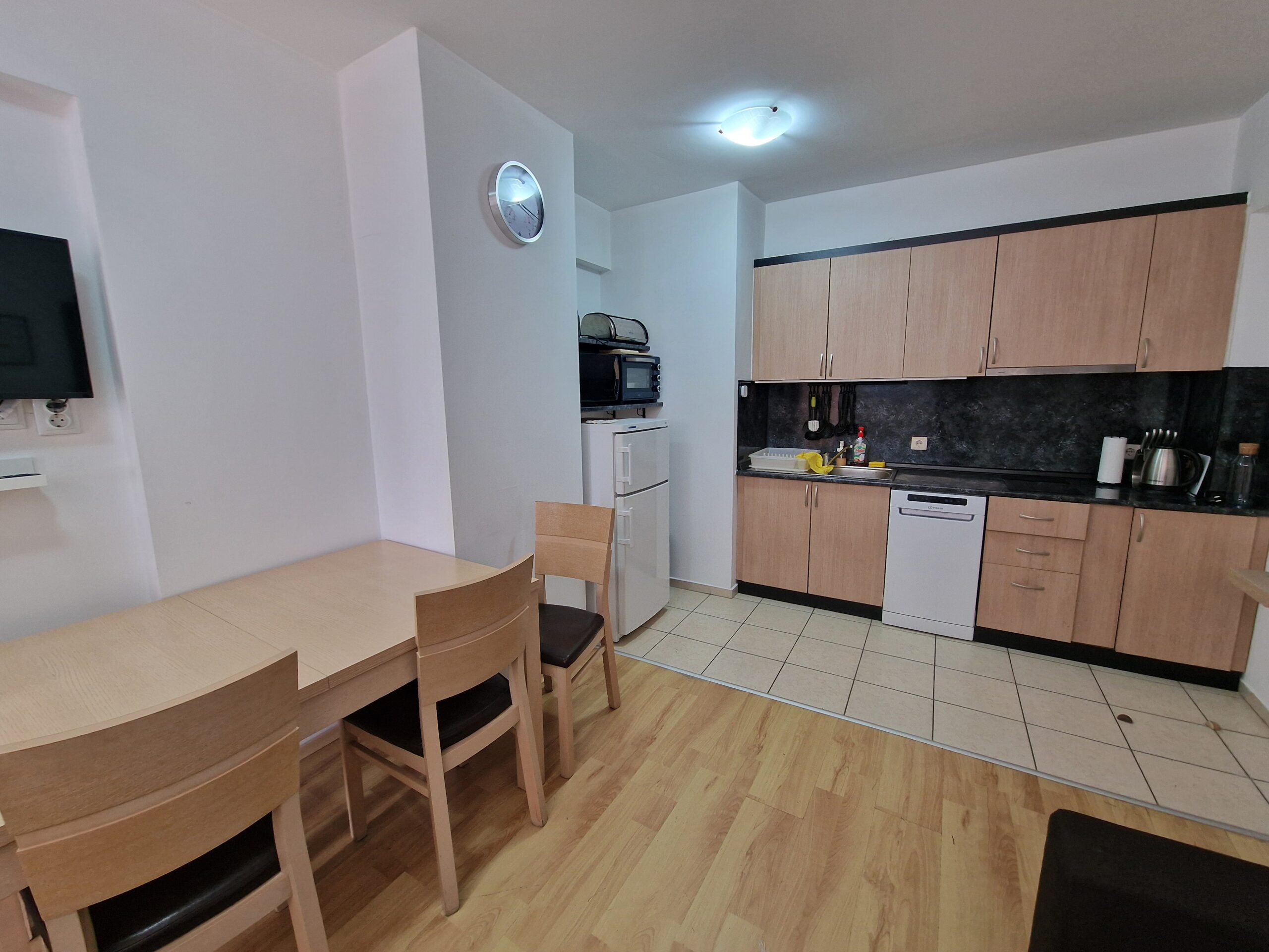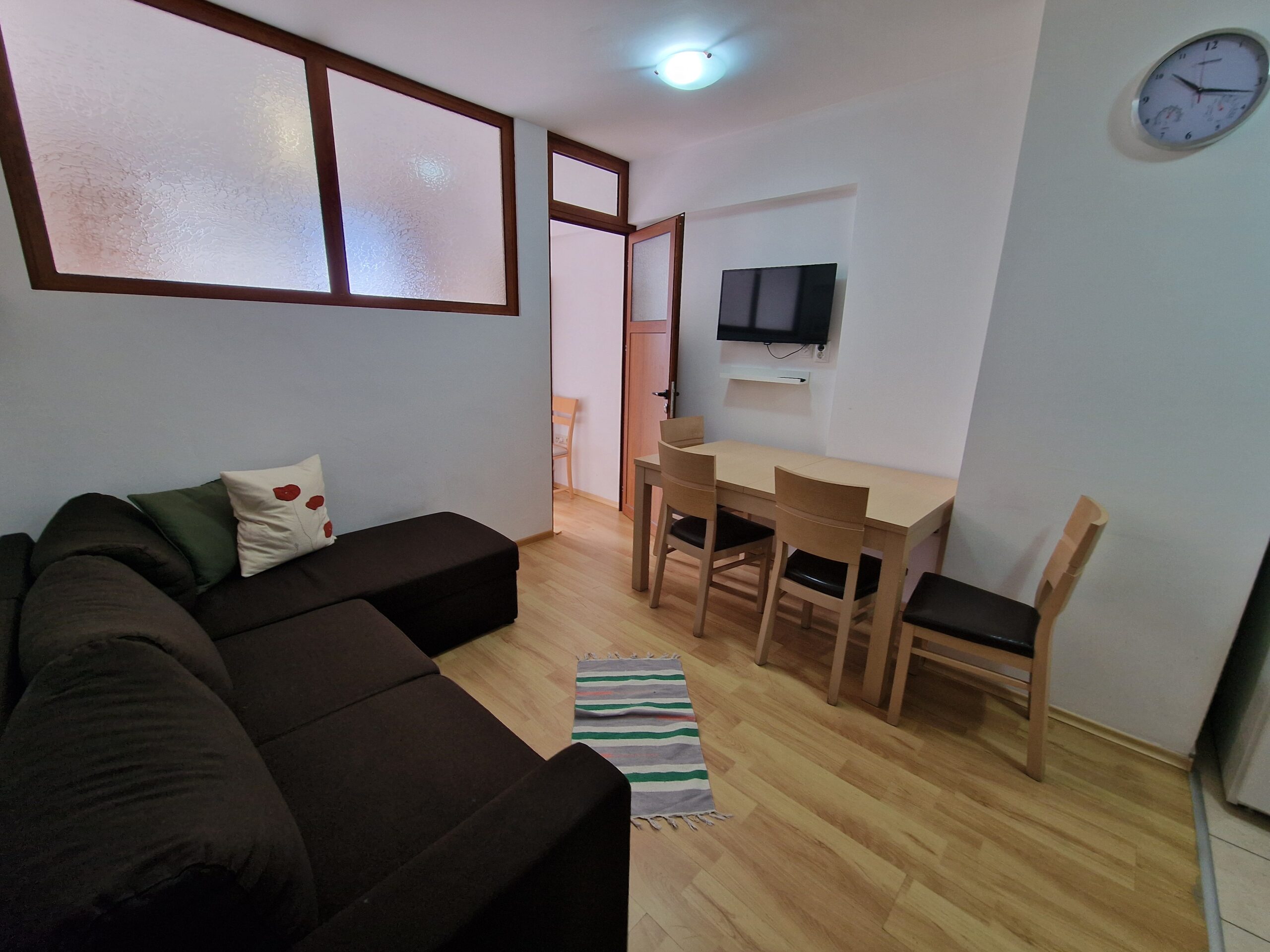 The apartment consists of an entrance hallway, an living/dining room with a kitchenette equipped with an oven, ceramic hob, extractor, microwave, dishwasher and refrigerator, a dining table with chairs, a comfortable sofa bed with a TV.