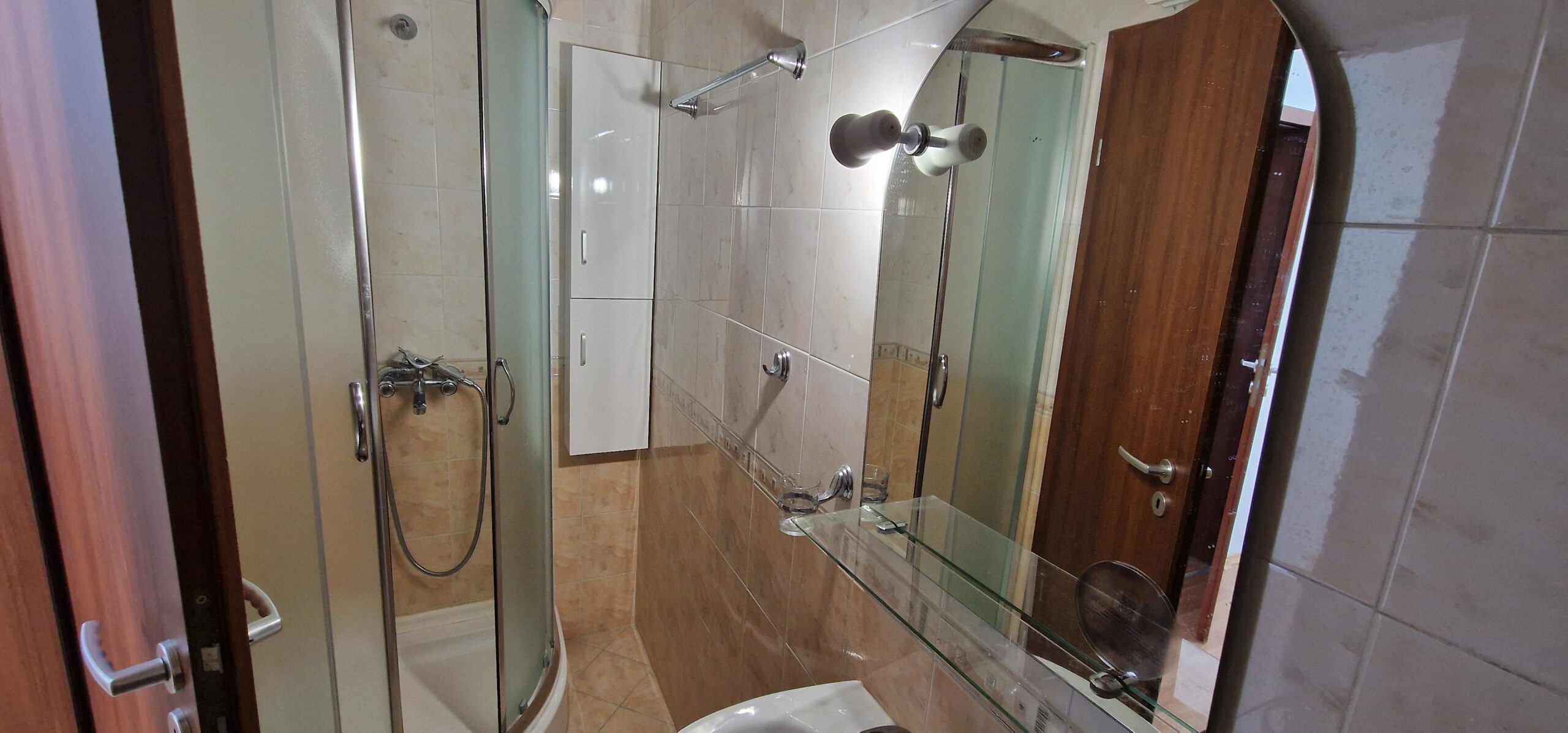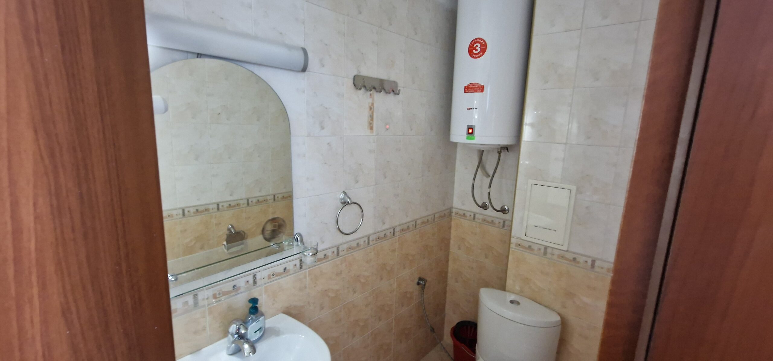 The bathroom is equipped with a sink, toilet, a shower cabin and a hot water boiler.