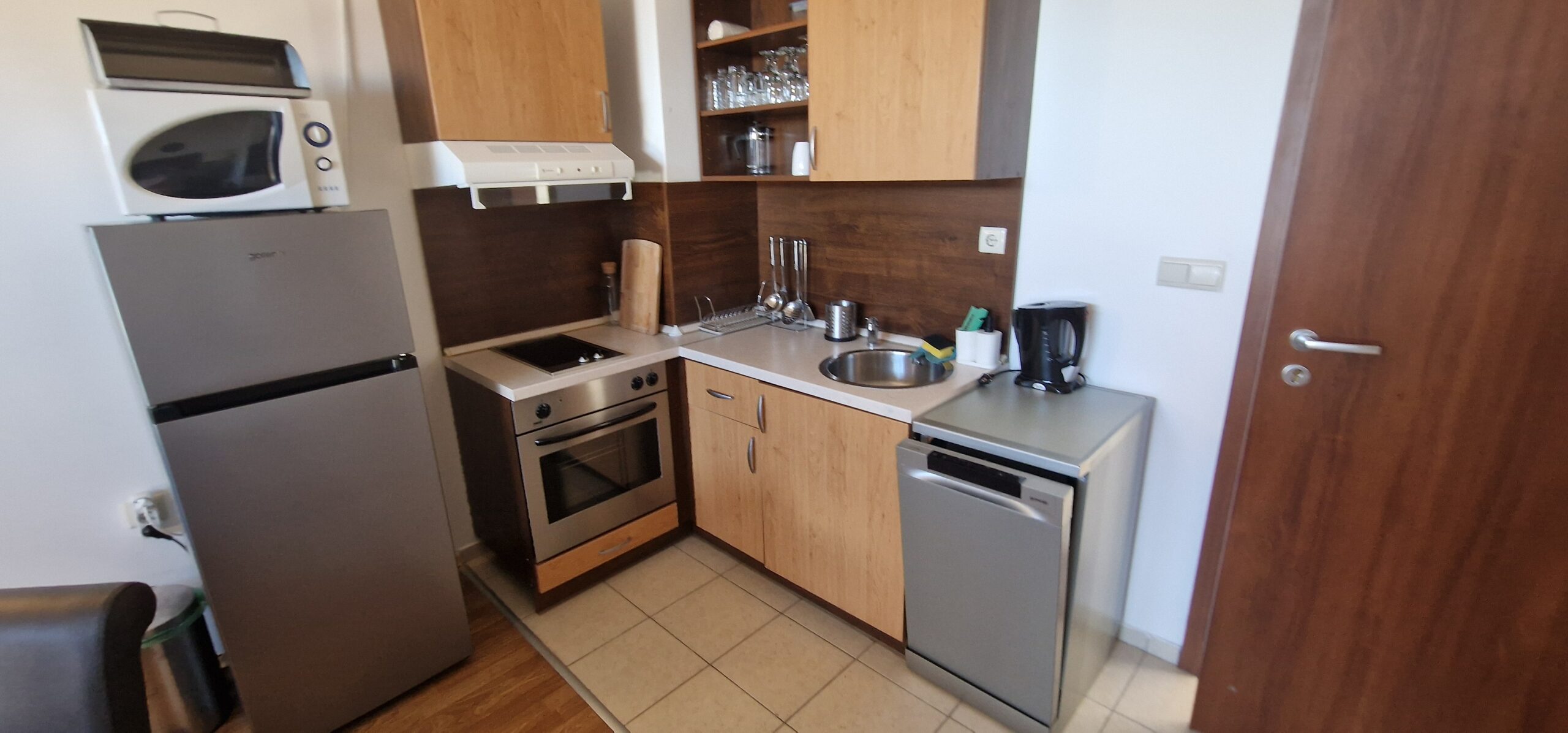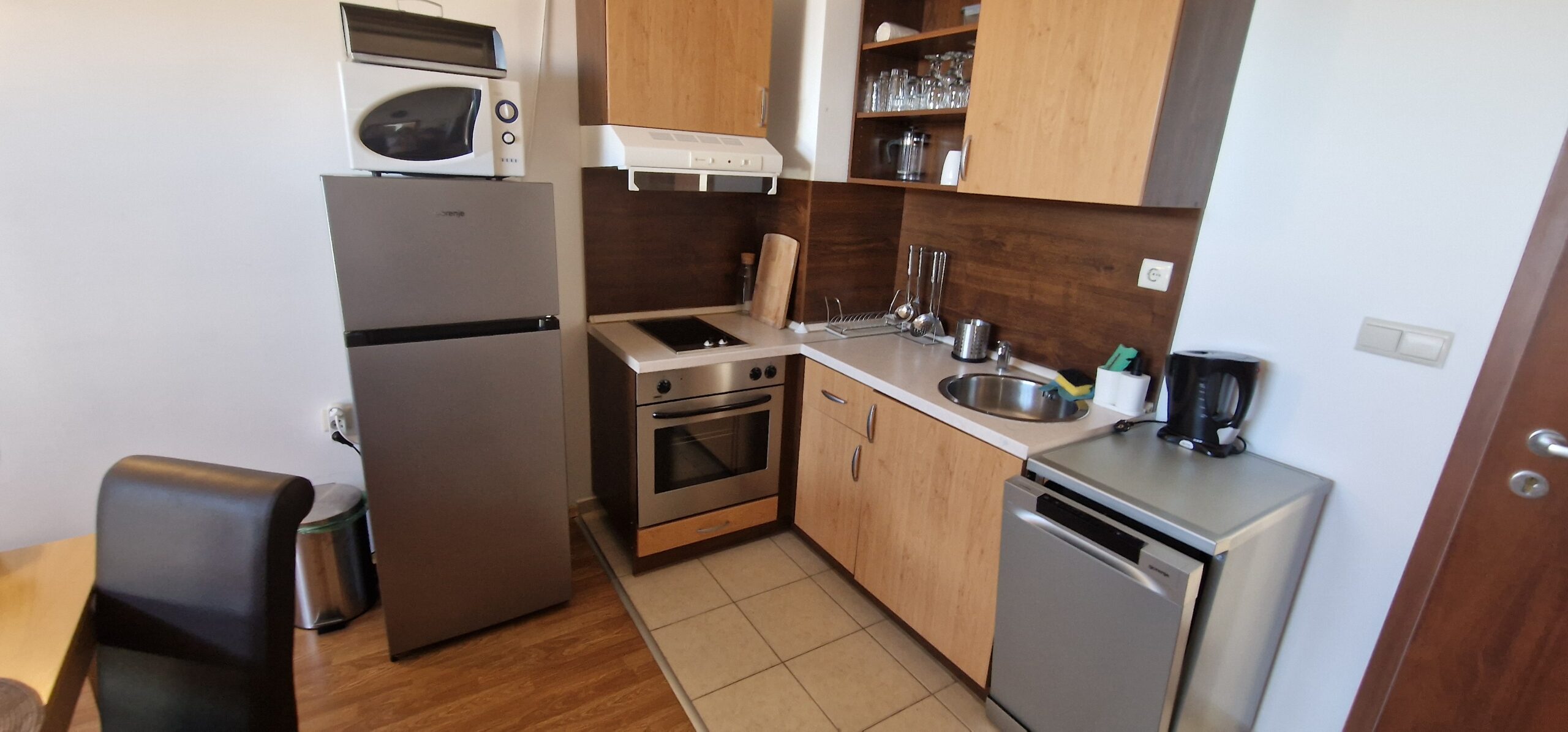 The apartment consists of an open plan living/dining room with a kitchenette equipped with an oven, ceramic hob, extractor, dishwasher and refrigerator, a dining table with chairs, a comfortable corner sofa bed with a coffee table and a TV unit with TV.