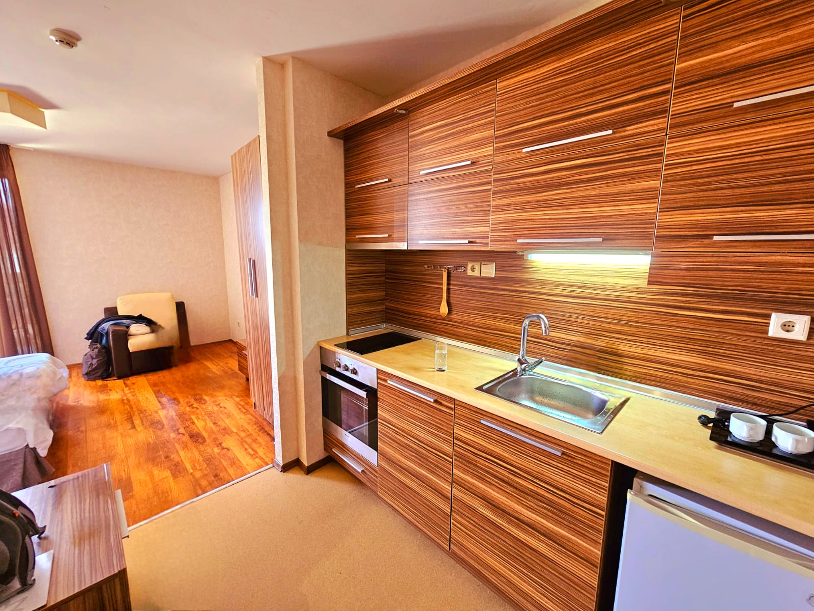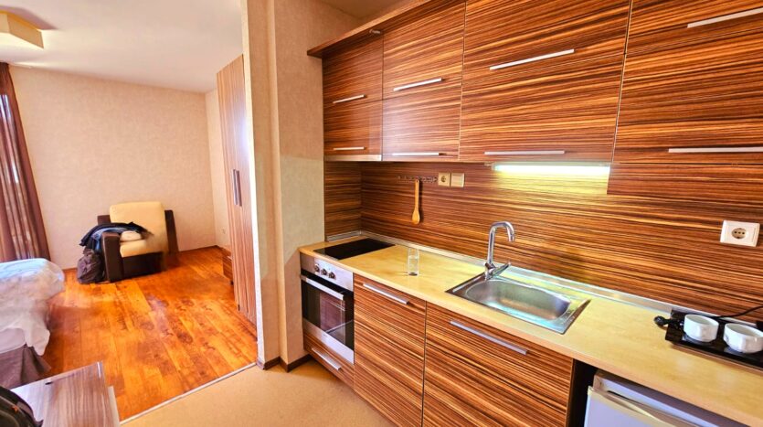This apartment consists of an entrance hallway with a kitchenette equipped with an oven, ceramic hob, extractor and a refrigerator, an open plan living/bedroom furnished with two single beds, bedside tables, wardrobe, an armchair and a TV. There is an access to a good sized balcony with a nice views of Pirin mountains and the surrounding complexes . The bathroom is equipped with a bathtub, sink and a toilet.