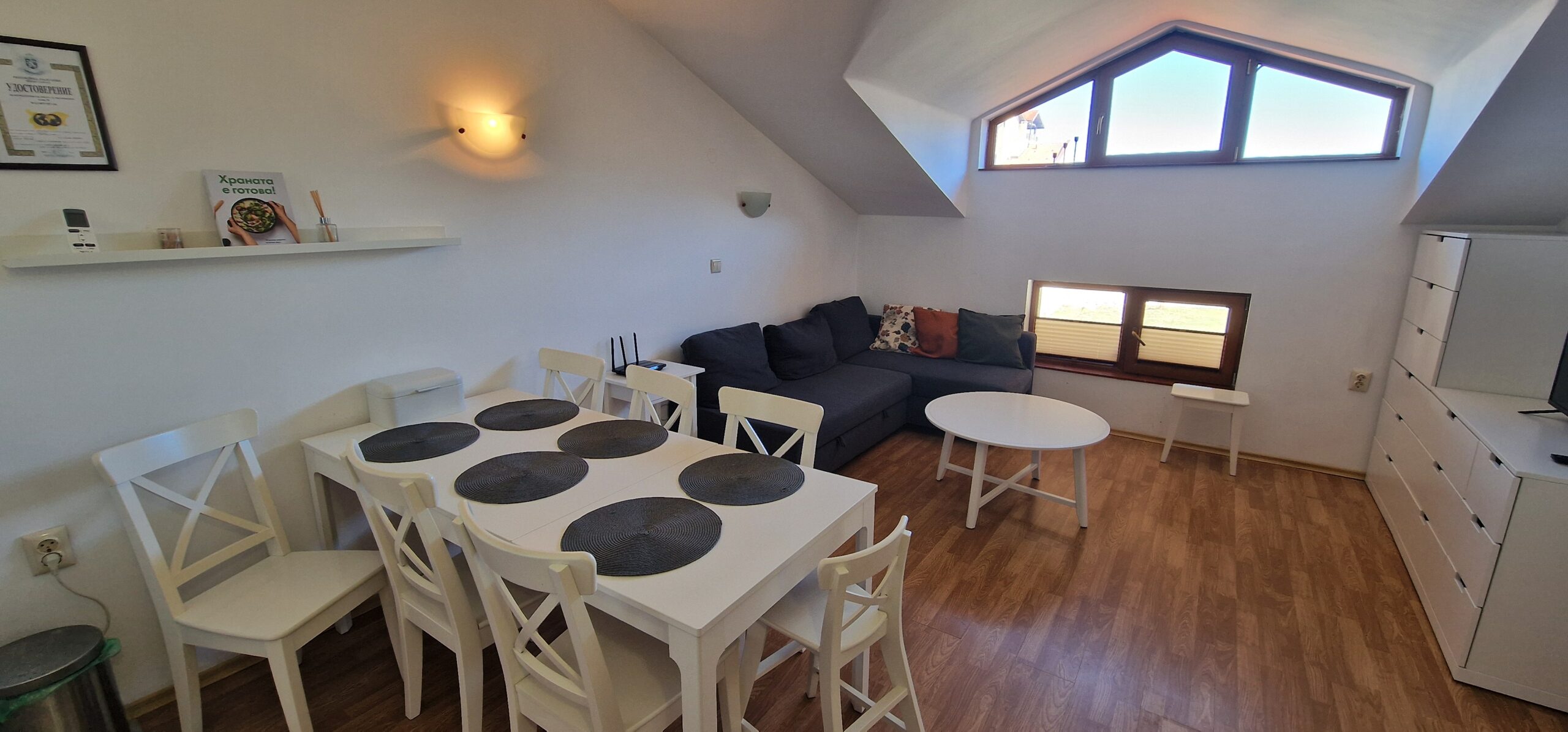 The apartment consists of an open plan living/dining room with a kitchenette equipped with ceramic hob, extractor, dishwasher and refrigerator, a dining table with chairs, a comfortable corner sofa bed with a coffee table and a TV unit with TV.