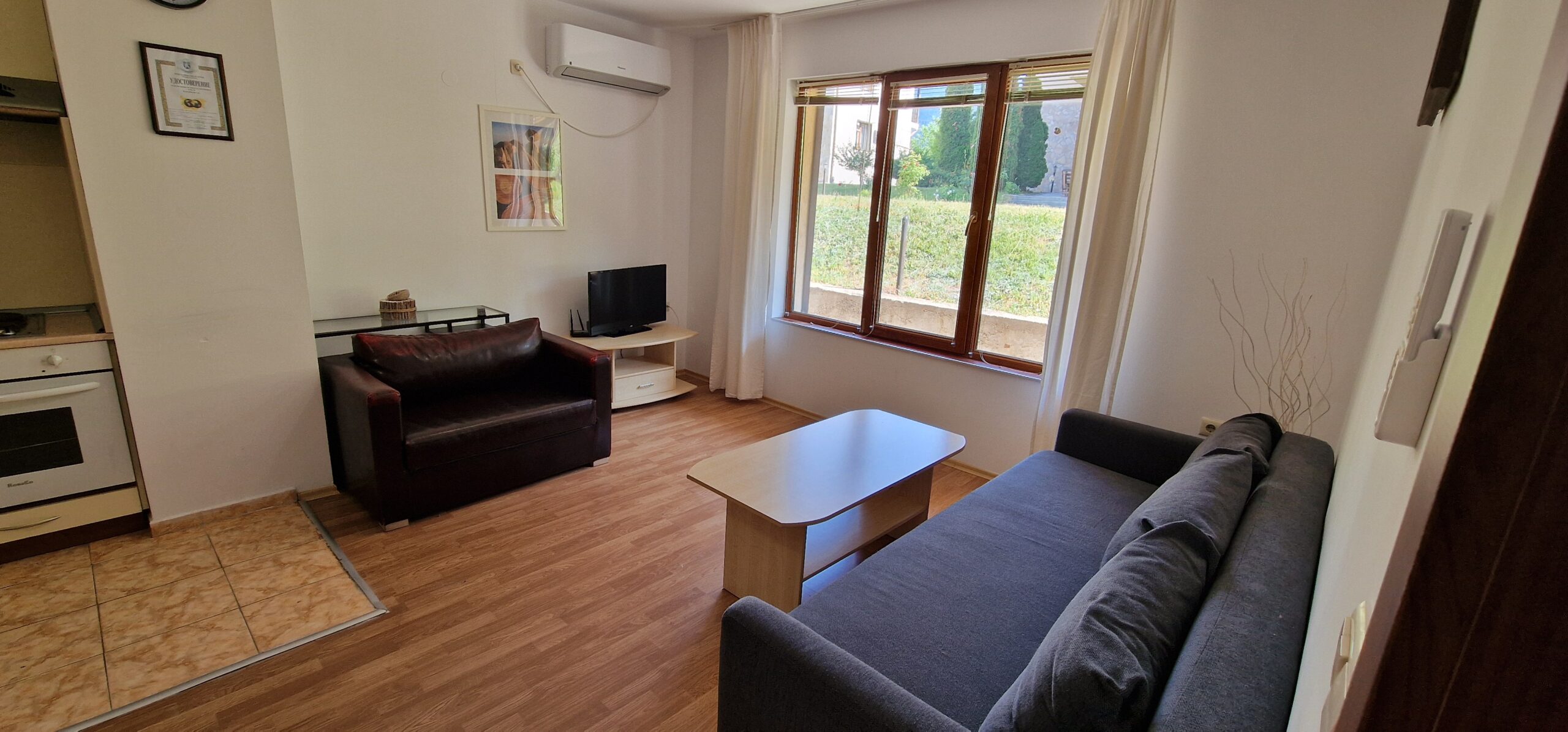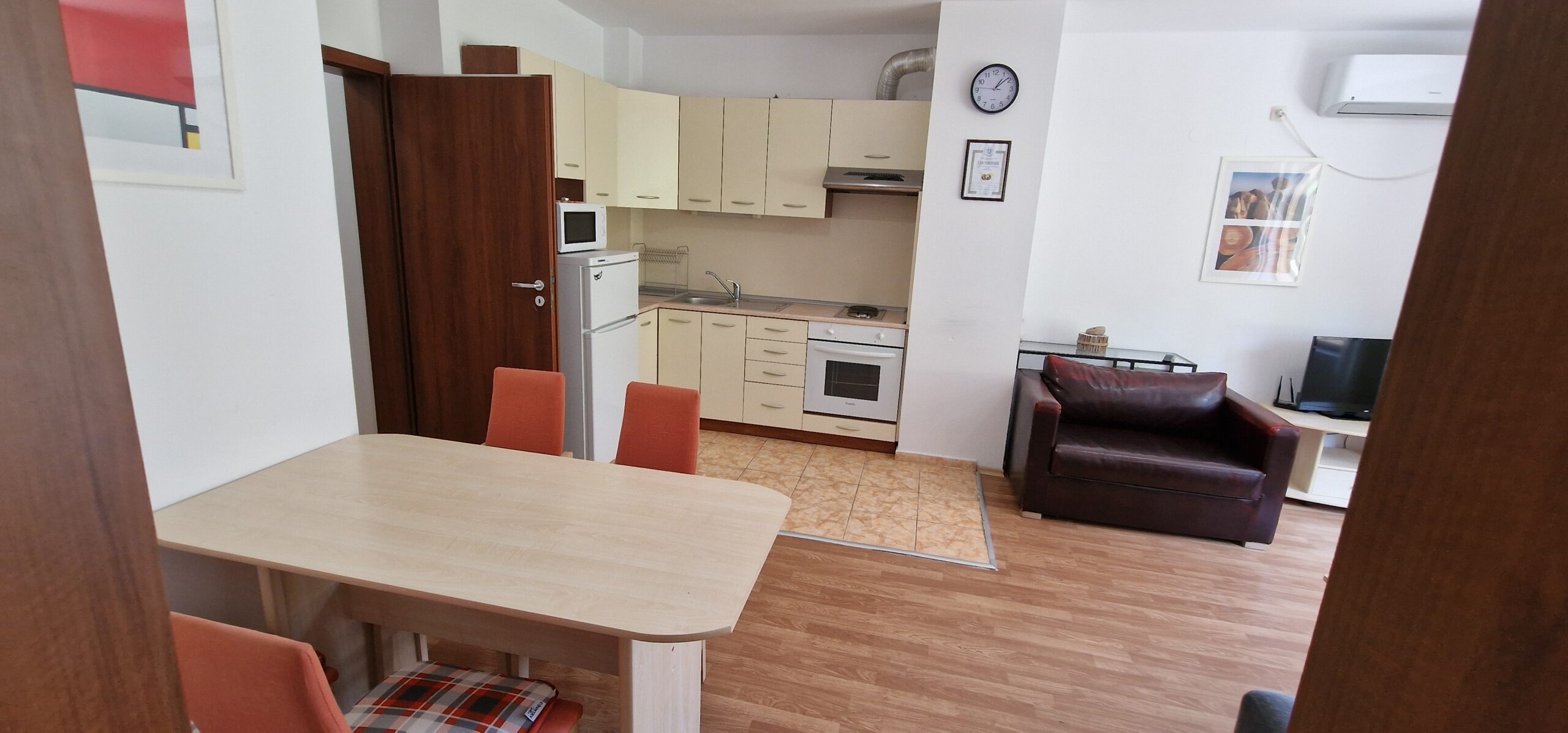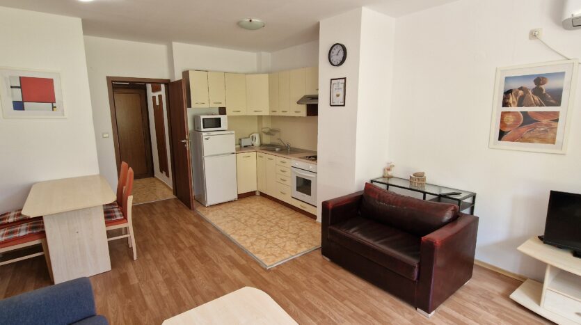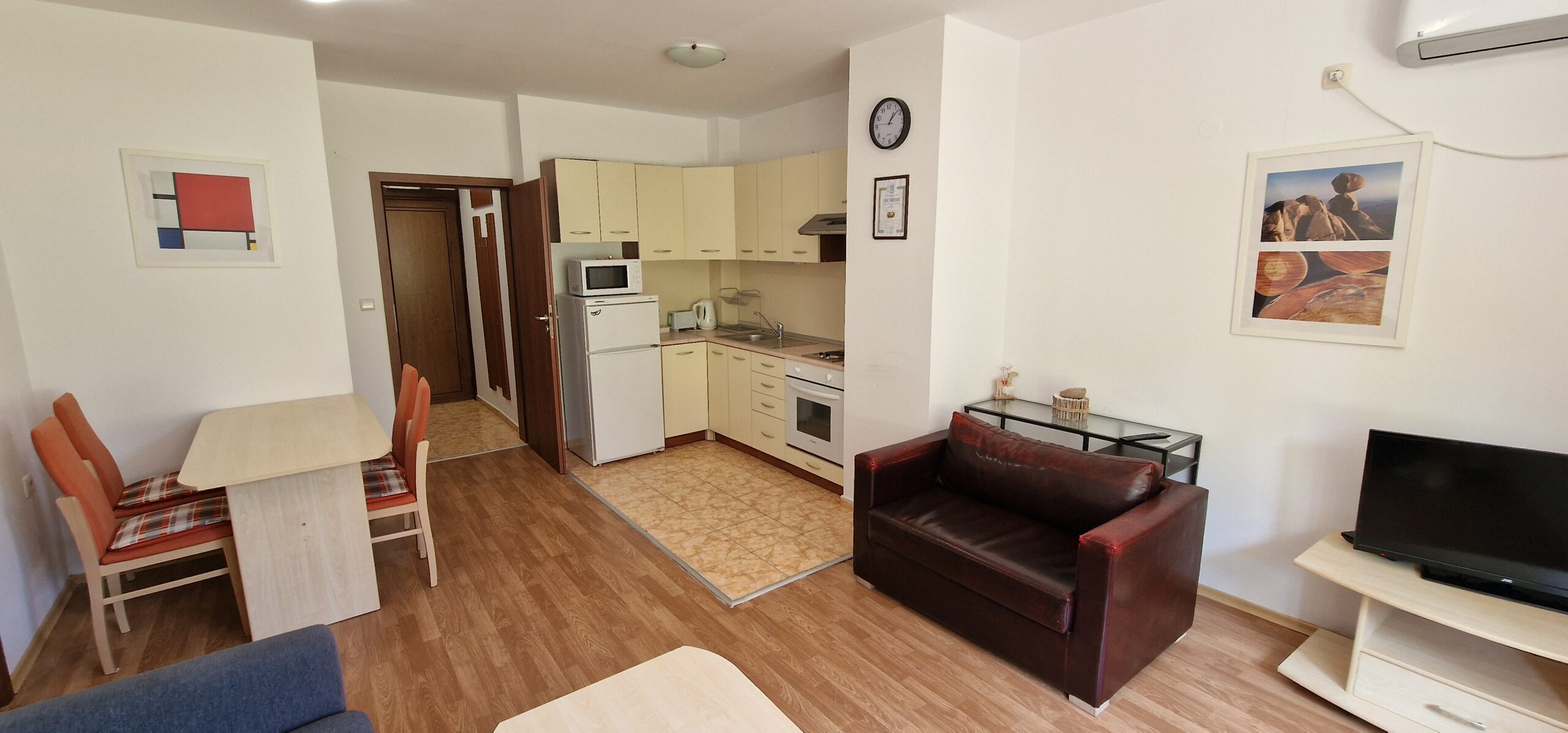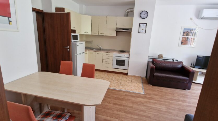 The apartment consists of a small entrance hallway, an open plan living/dining room with a kitchenette equipped with an oven, electric stove, extractor, refrigerator, a dining table with chairs, a comfortable sofa with a coffee table, TV and an armchair.