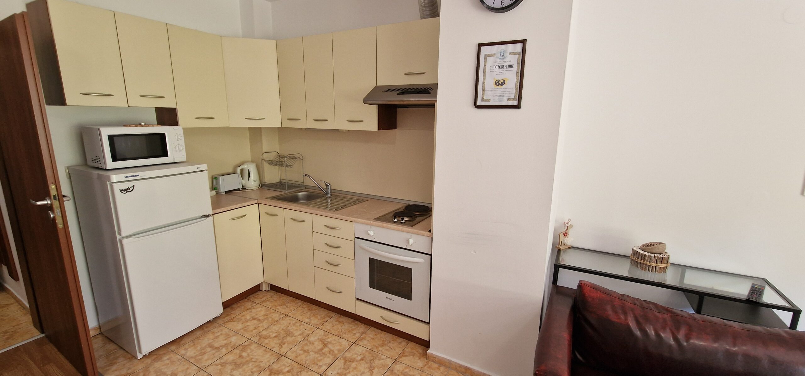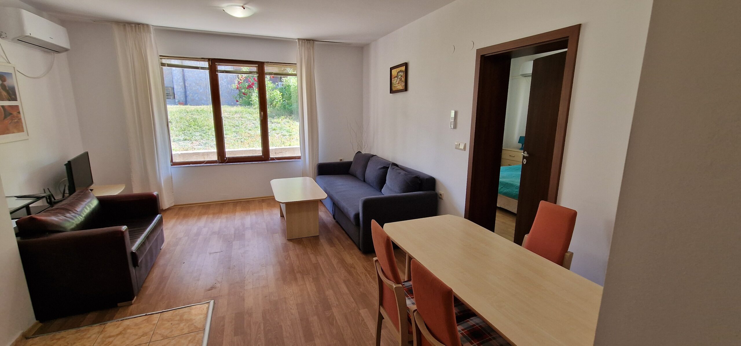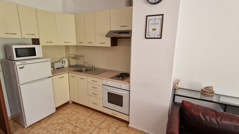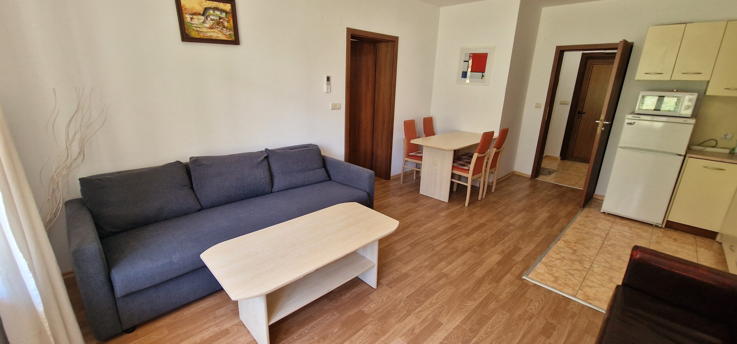 The apartment consists of a small entrance hallway, an open plan living/dining room with a kitchenette equipped with an oven, electric stove, extractor, refrigerator, a dining table with chairs, a comfortable sofa with a coffee table, TV and an armchair.