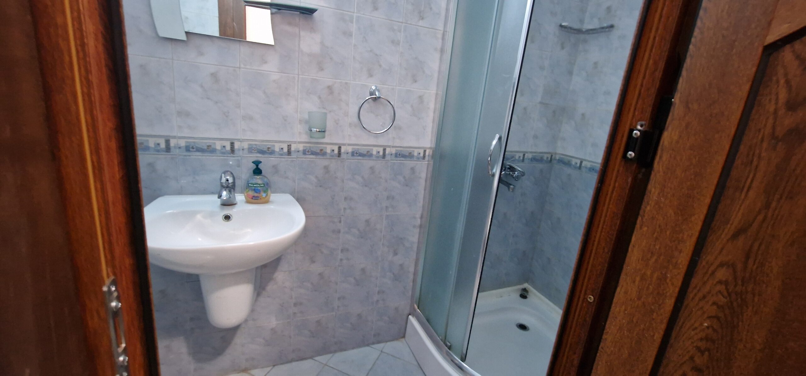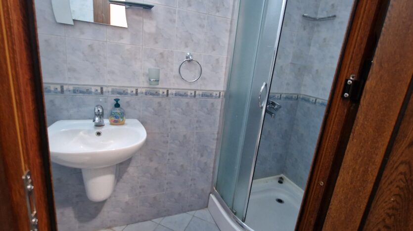 The bathroom is equipped with a sink, toilet, a shower cabin and a hot water boiler.
