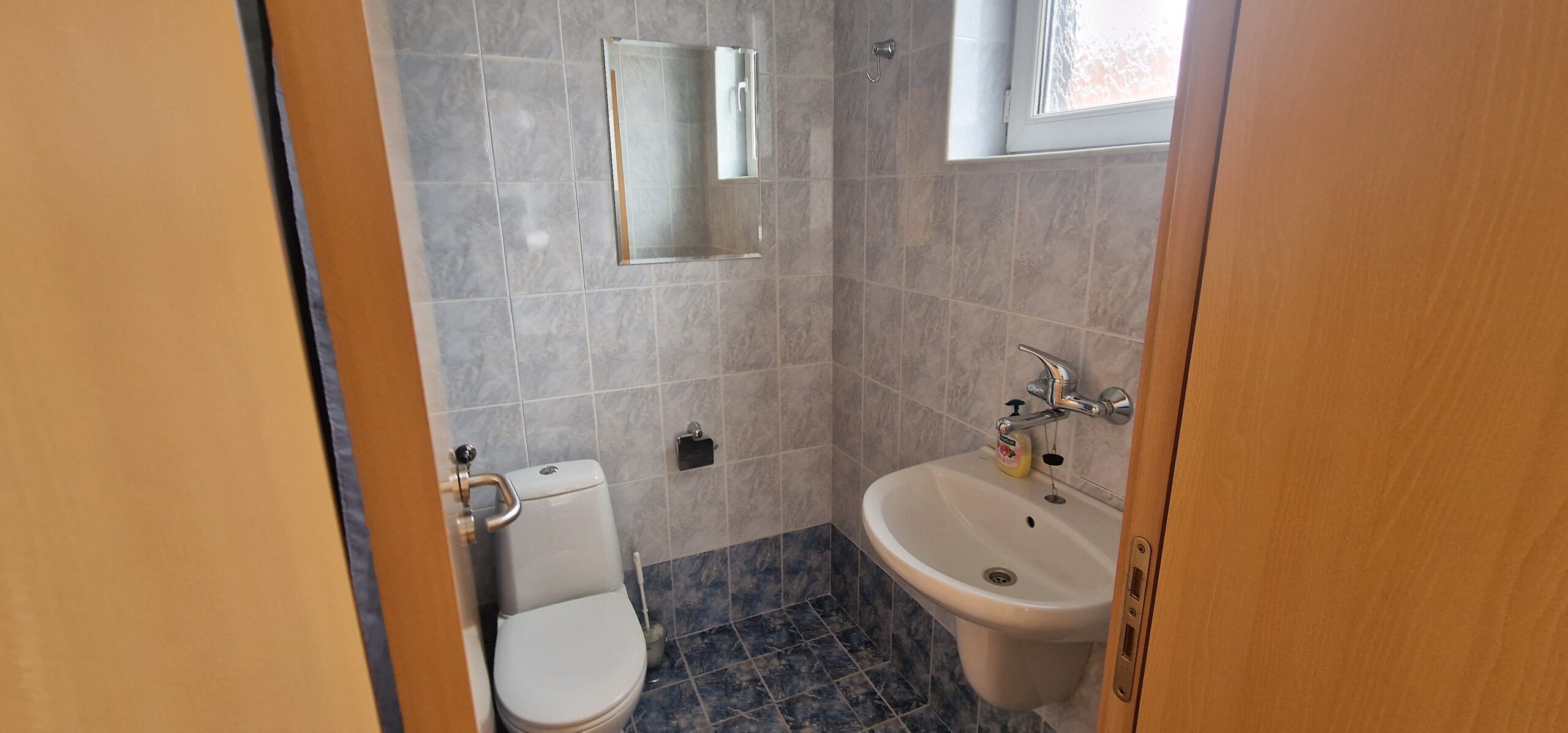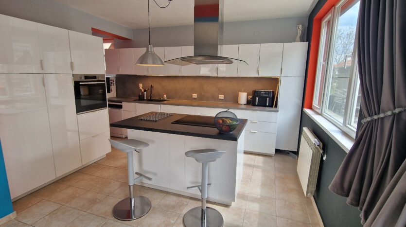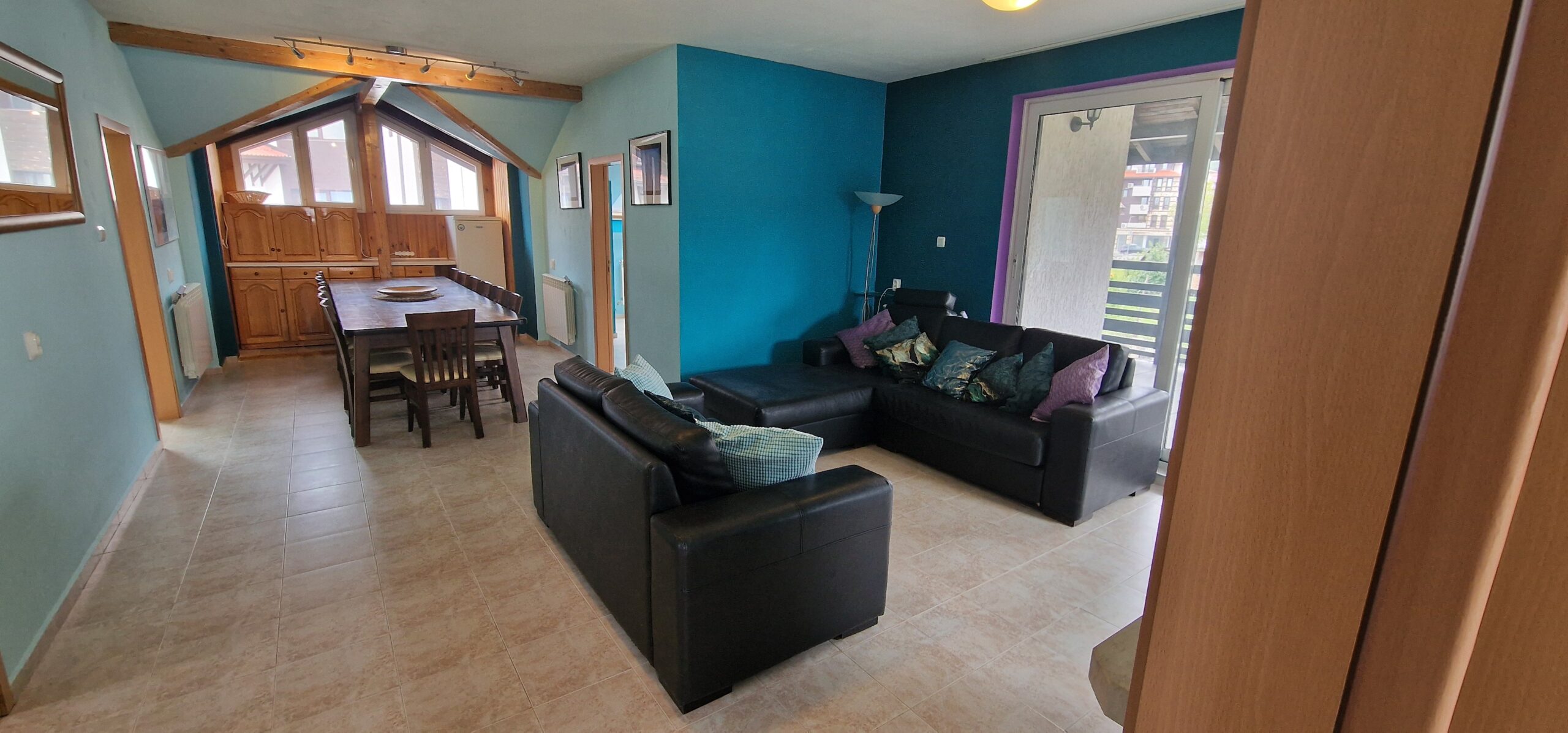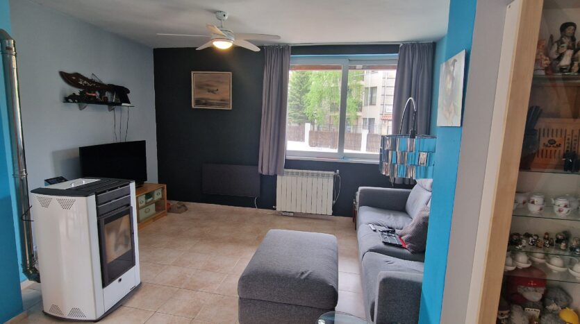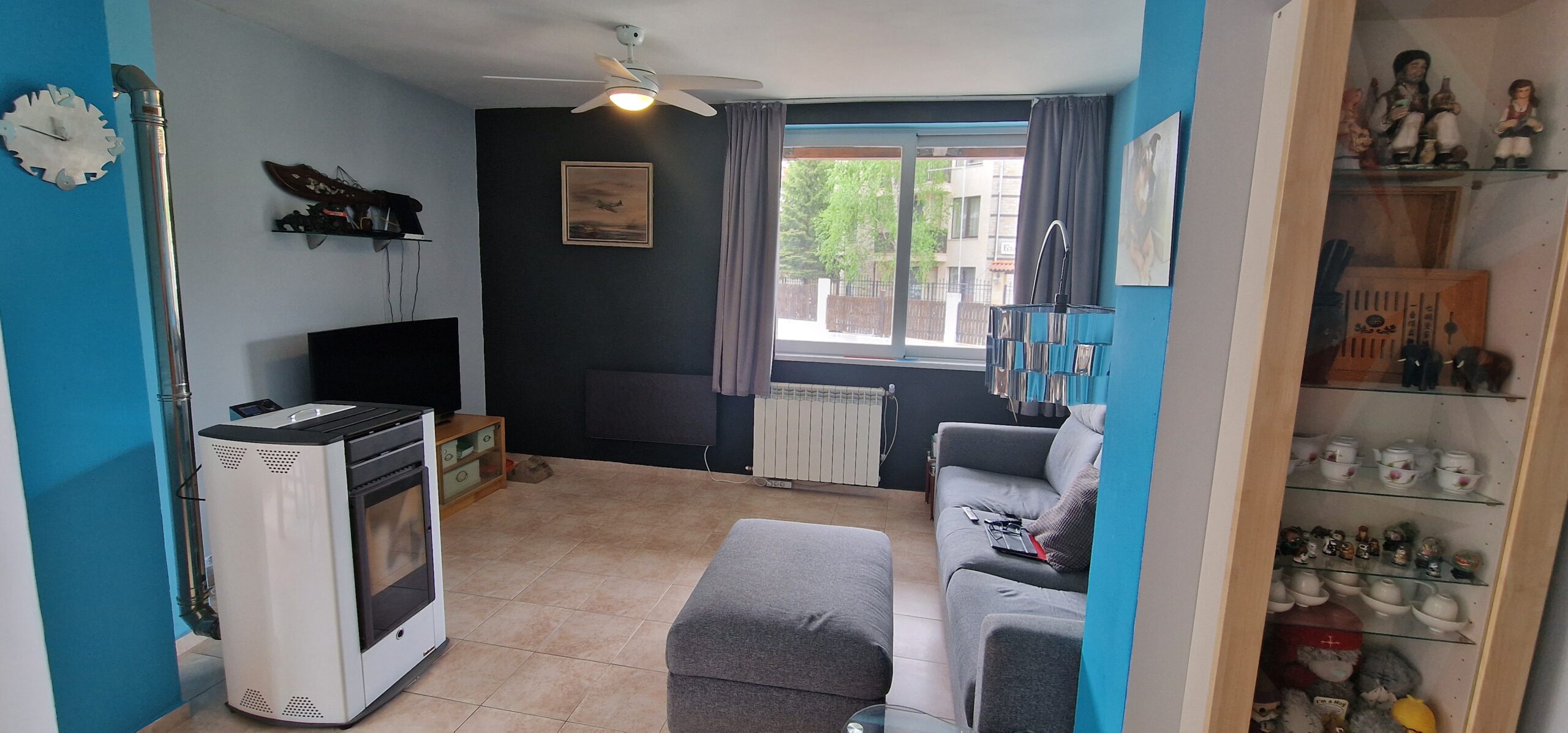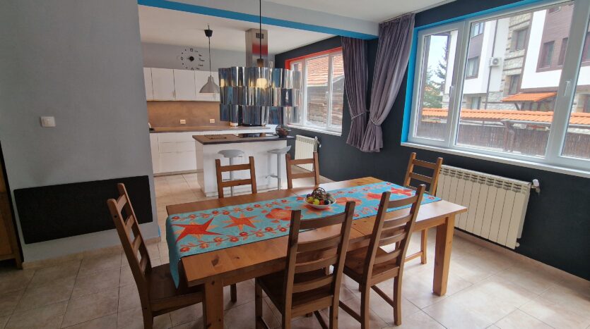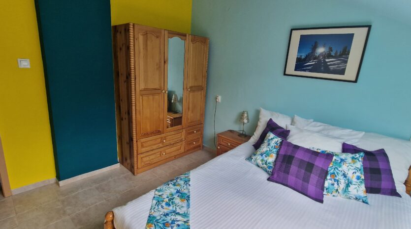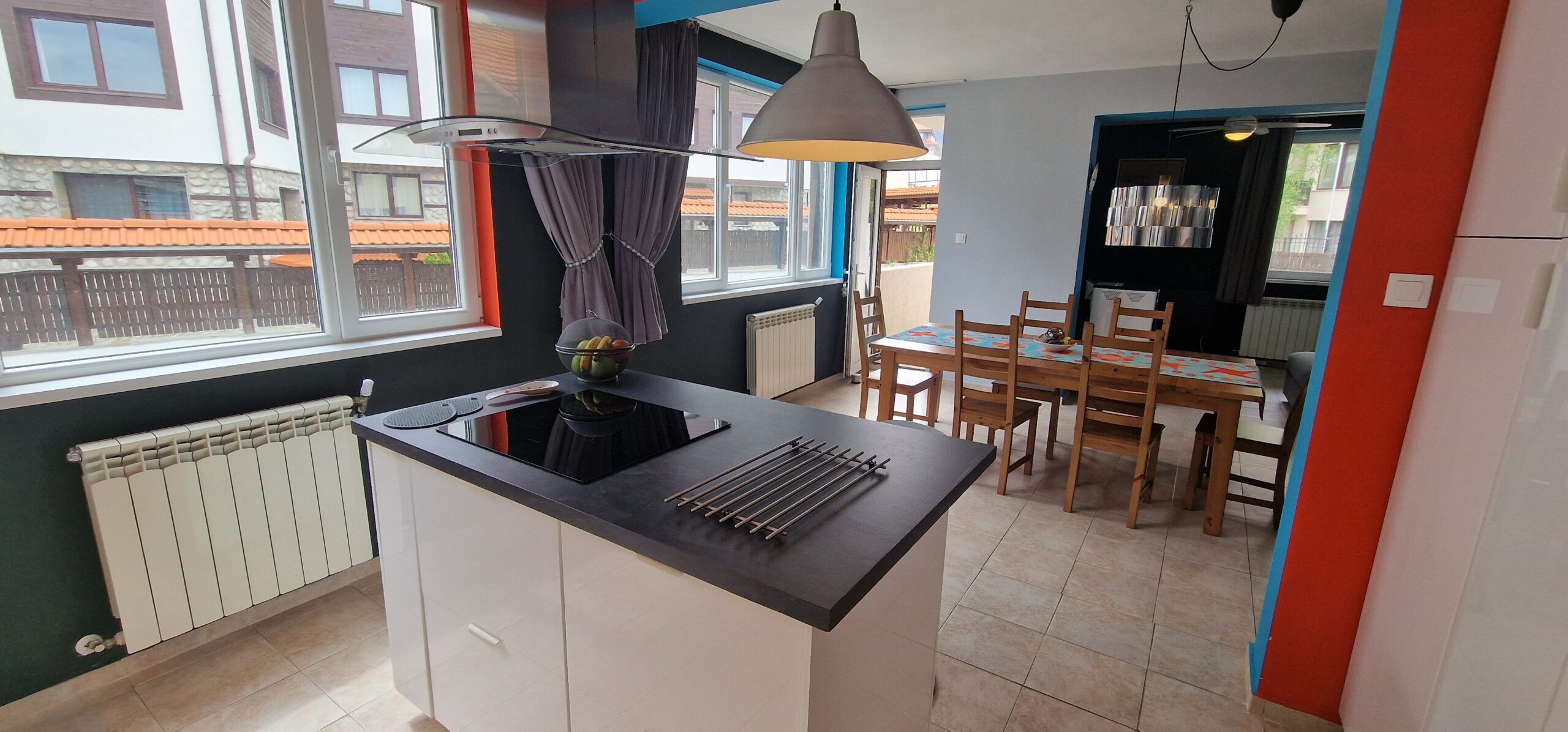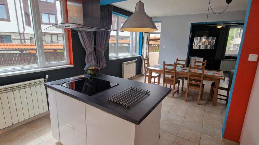 • 1st floor; there is a modern and fully equipped kitchen with an island, a large dining area  and a cozy leaving area with a comfortable sofa, large TV,  and pellets fire place. There are 2 bedrooms on this level – one of which is beautifully furnished with a double bed and has a walk-in wardrobe , the other one is furnished with a double bed, a single bed and large wardrobe. The main bathroom is modernly equipped with a large shower with glass , double sink and a toilet. There is а small laundry room.
