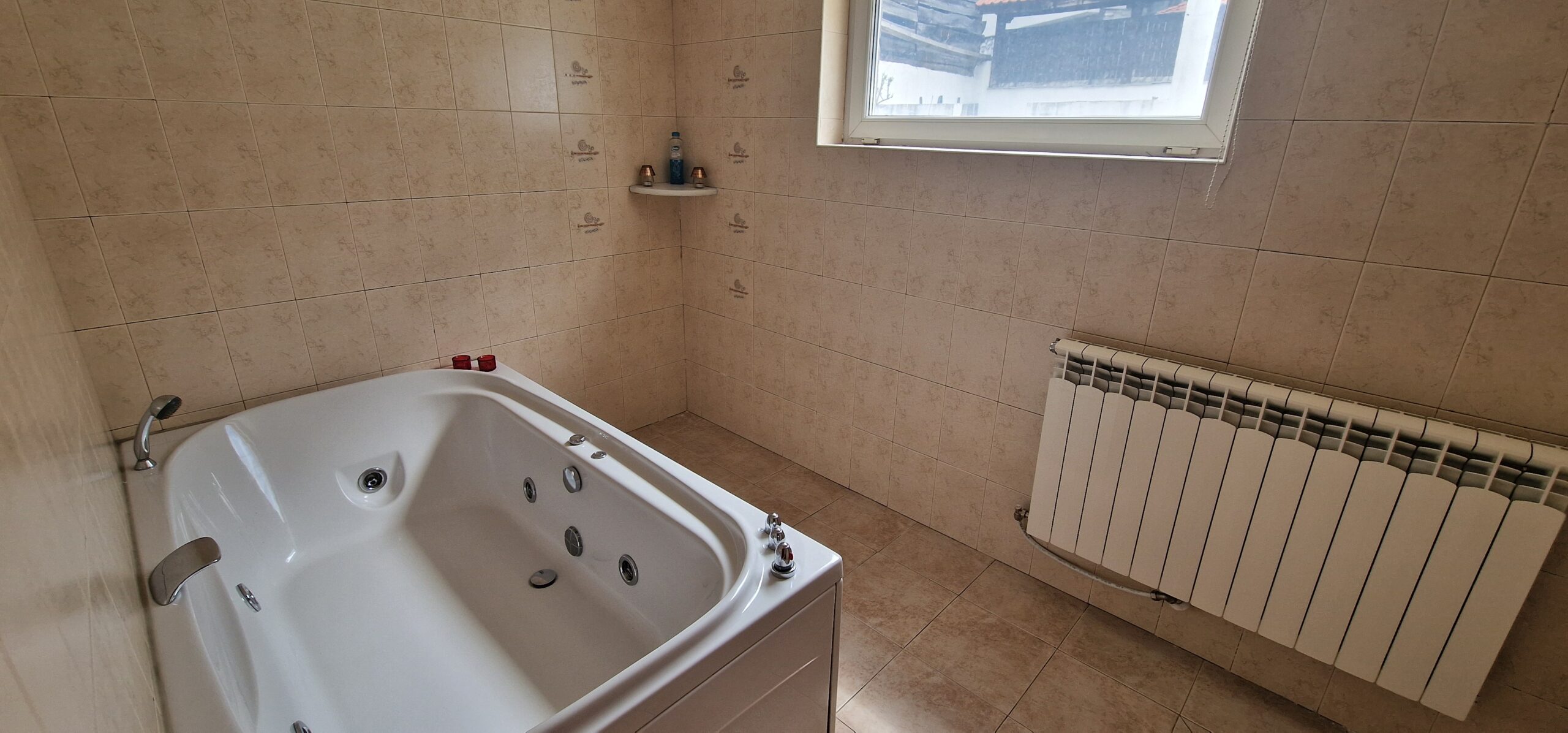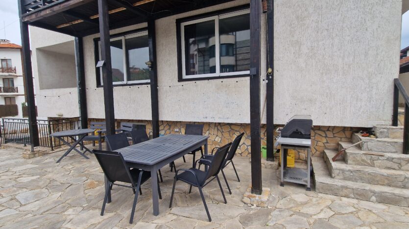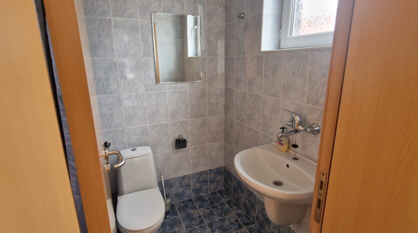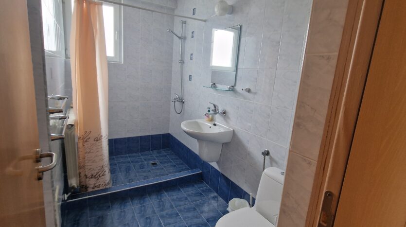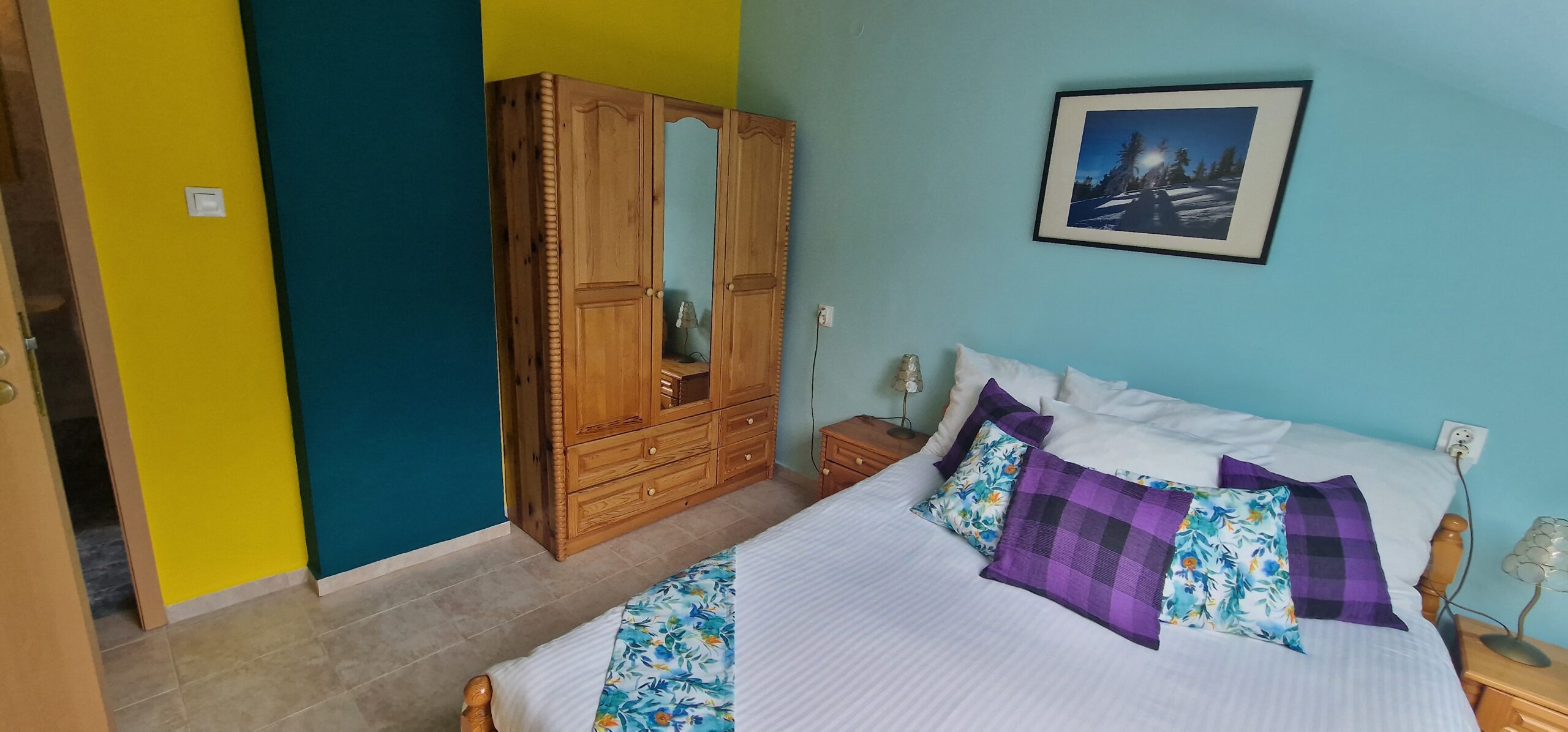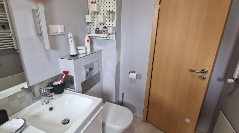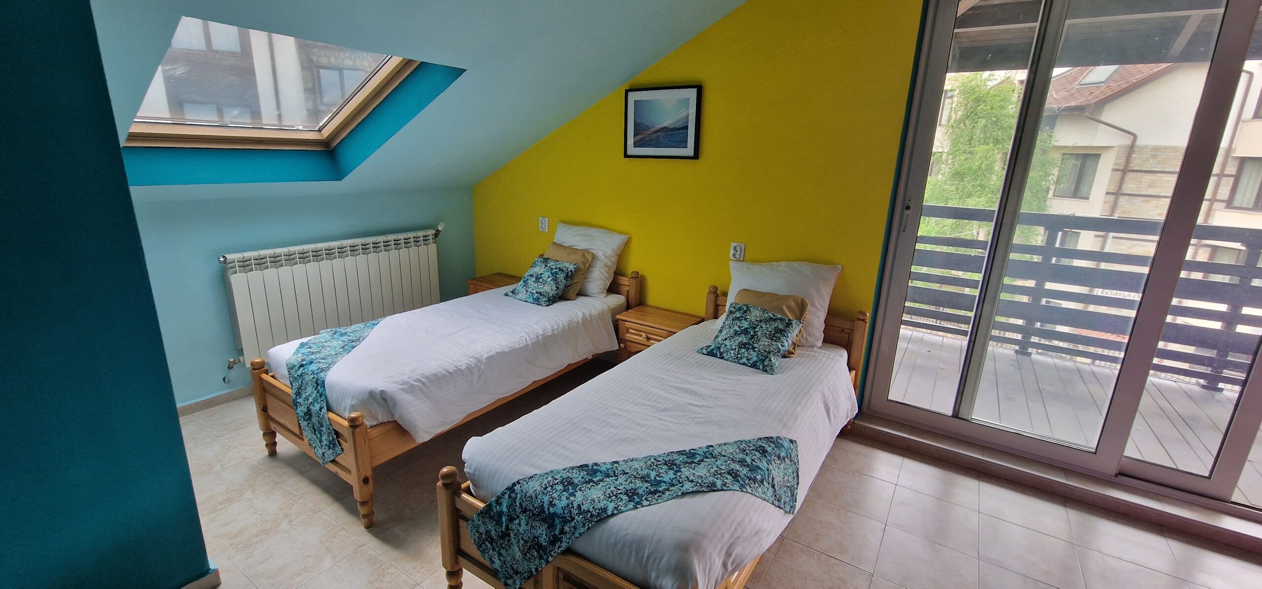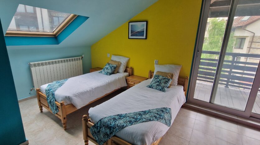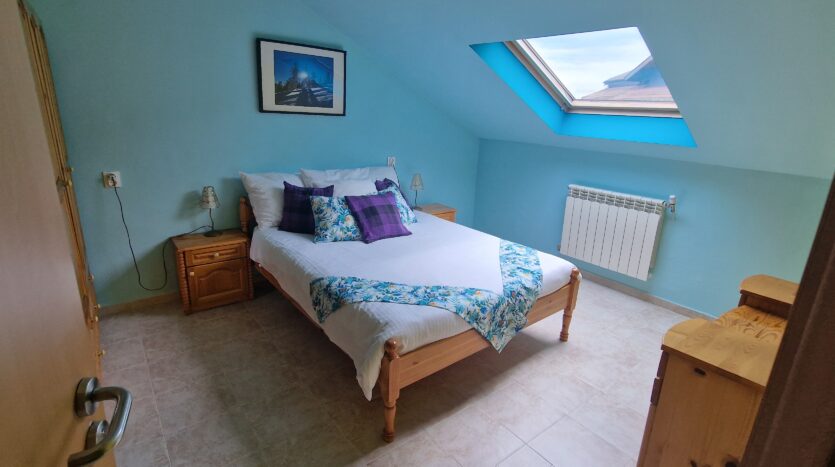 • 1st floor; there is a modern and fully equipped kitchen with an island, a large dining area  and a cozy leaving area with a comfortable sofa, large TV,  and pellets fire place. There are 2 bedrooms on this level – one of which is beautifully furnished with a double bed and has a walk-in wardrobe , the other one is furnished with a double bed, a single bed and large wardrobe. The main bathroom is modernly equipped with a large shower with glass , double sink and a toilet. There is а small laundry room.