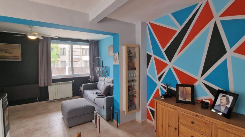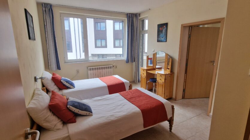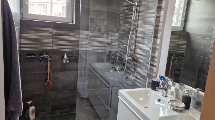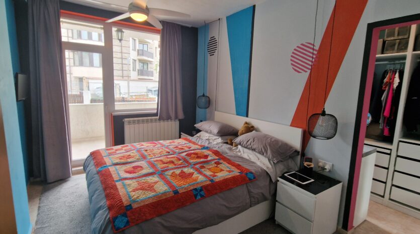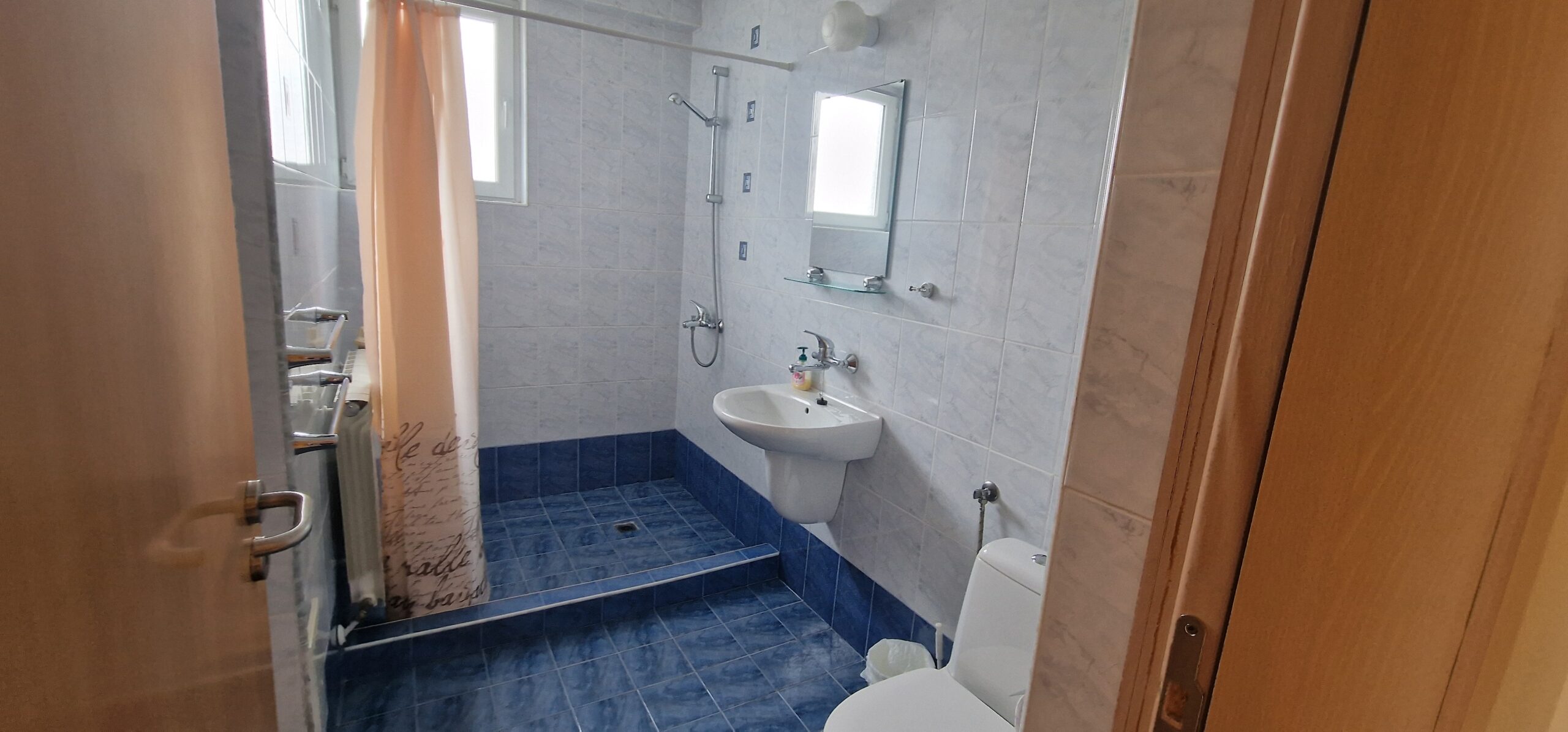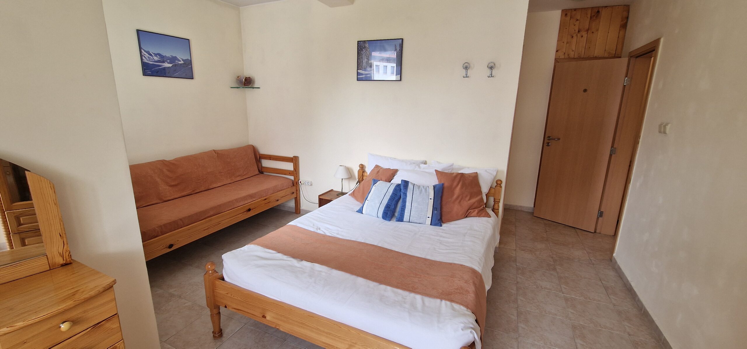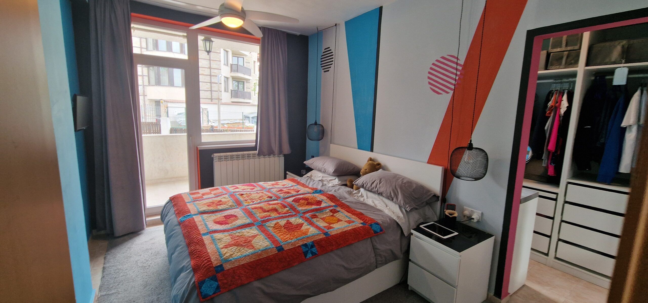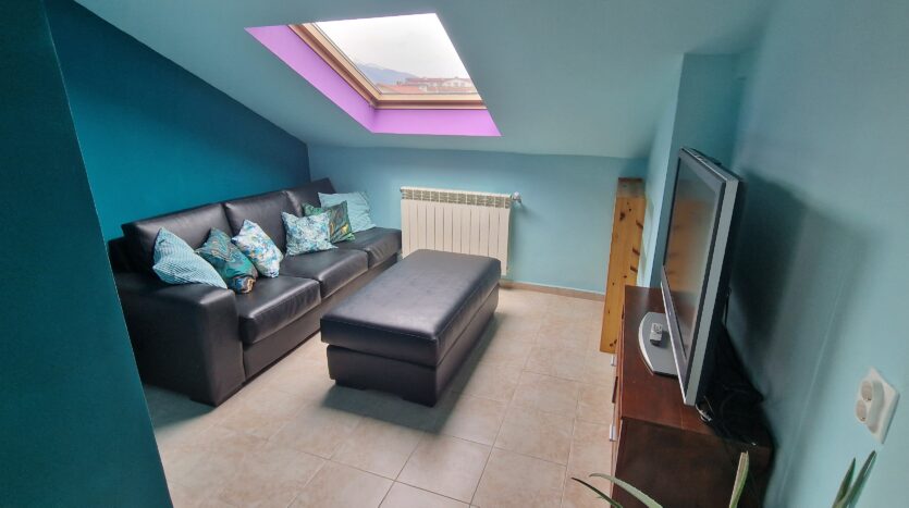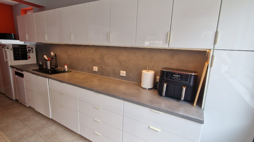 • 1st floor; there is a modern and fully equipped kitchen with an island, a large dining area  and a cozy leaving area with a comfortable sofa, large TV,  and pellets fire place. There are 2 bedrooms on this level – one of which is beautifully furnished with a double bed and has a walk-in wardrobe , the other one is furnished with a double bed, a single bed and large wardrobe. The main bathroom is modernly equipped with a large shower with glass , double sink and a toilet. There is а small laundry room.