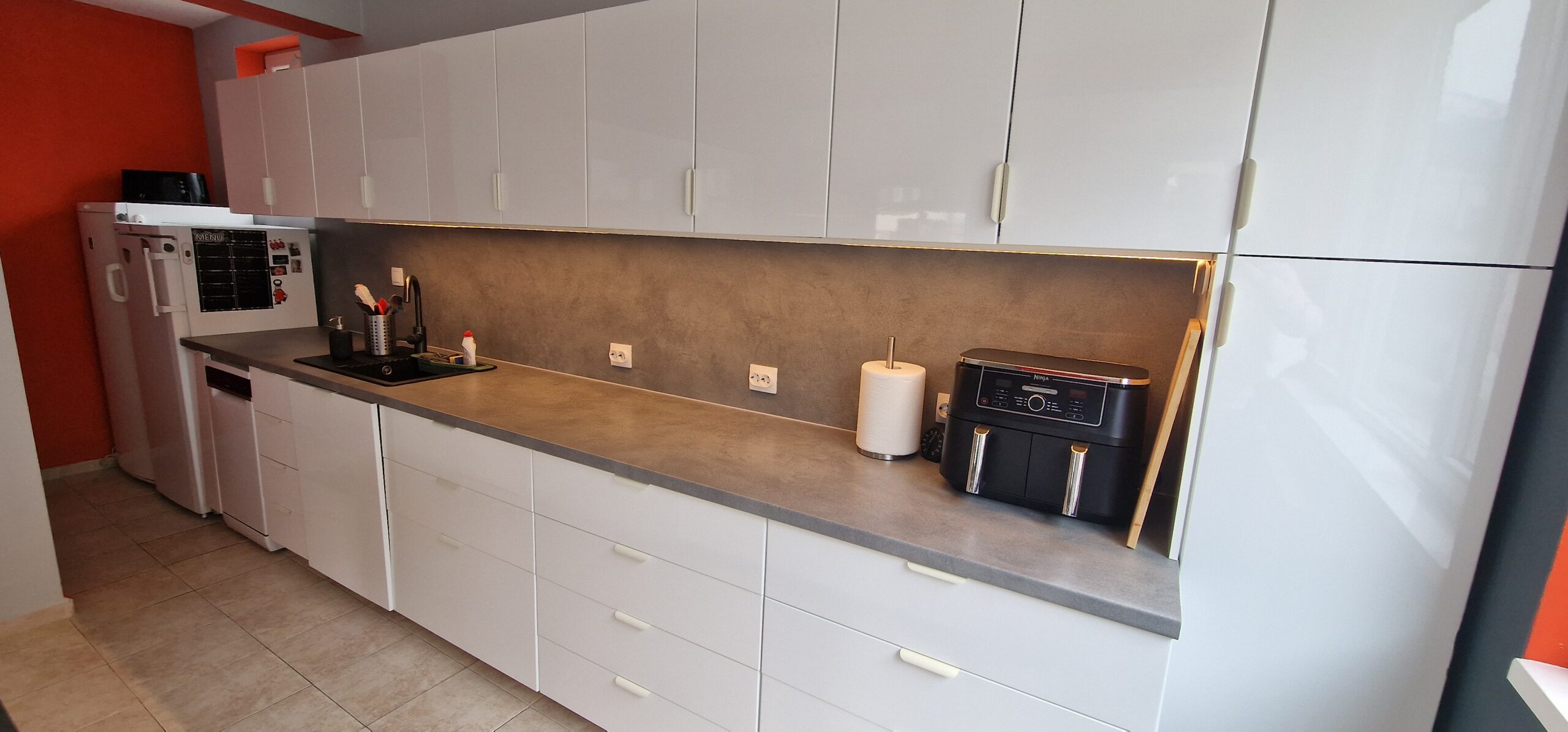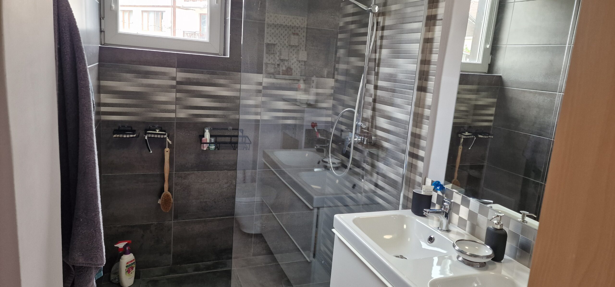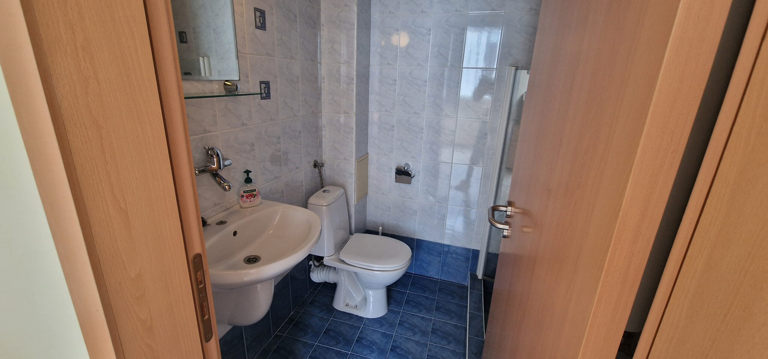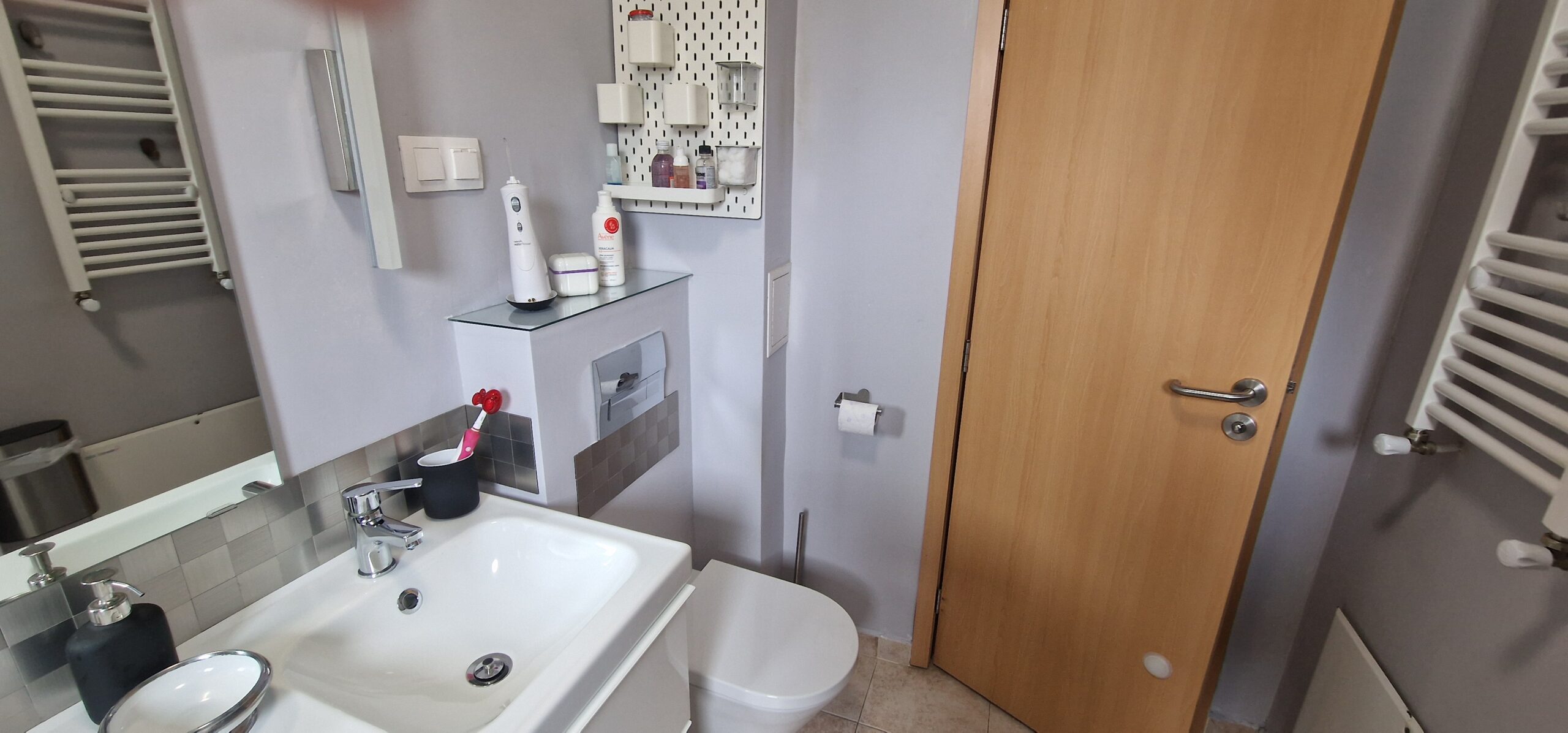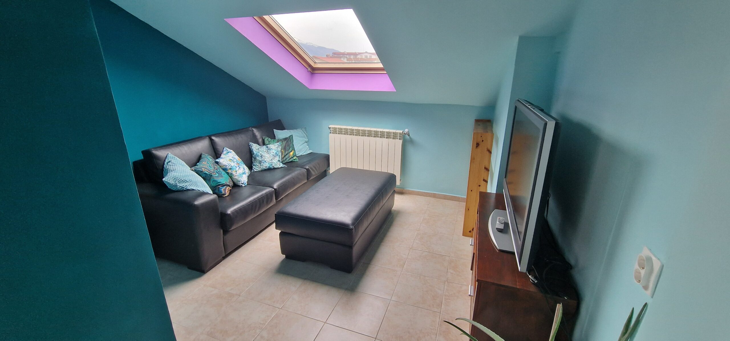 • 1st floor; there is a modern and fully equipped kitchen with an island, a large dining area  and a cozy leaving area with a comfortable sofa, large TV,  and pellets fire place. There are 2 bedrooms on this level – one of which is beautifully furnished with a double bed and has a walk-in wardrobe , the other one is furnished with a double bed, a single bed and large wardrobe. The main bathroom is modernly equipped with a large shower with glass , double sink and a toilet. There is а small laundry room.