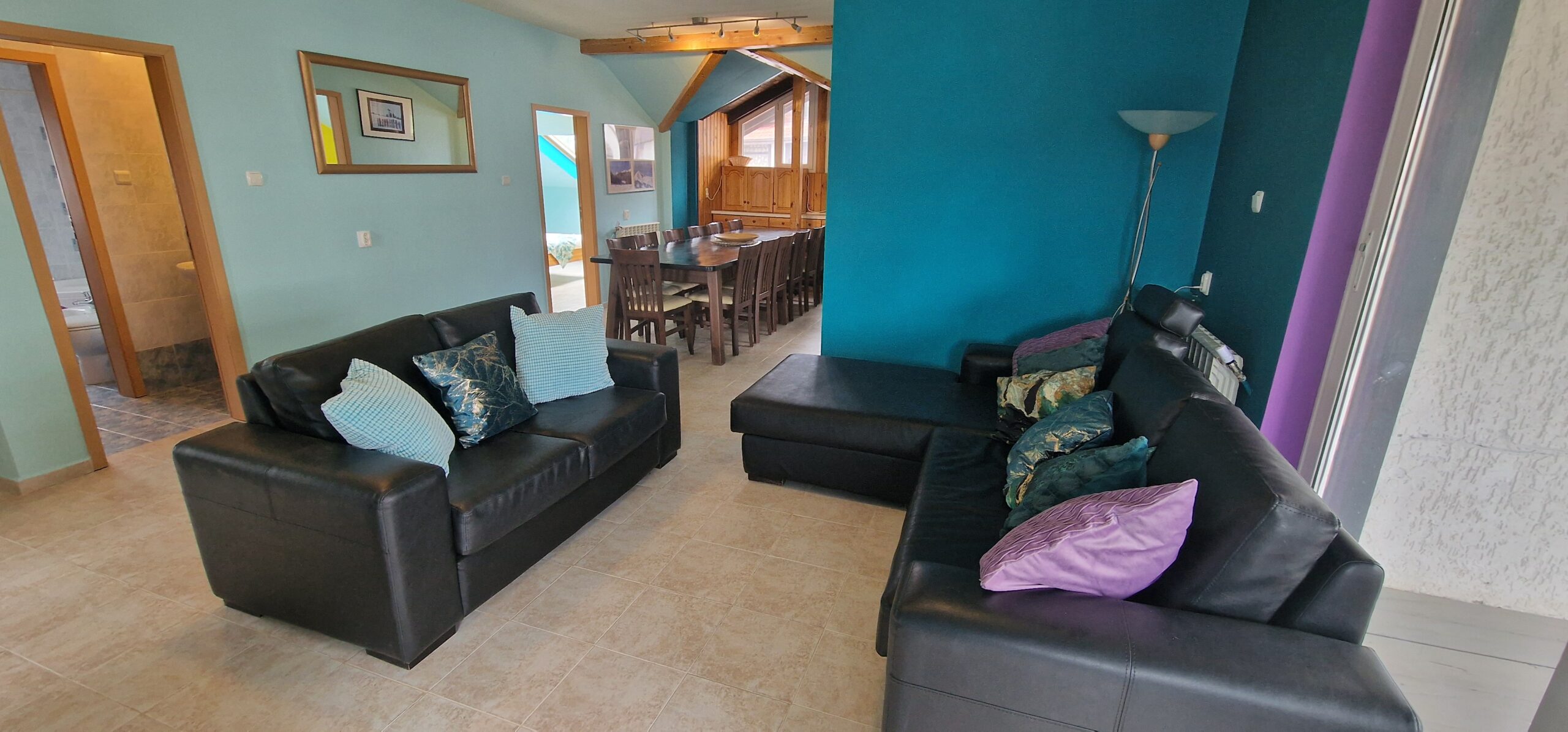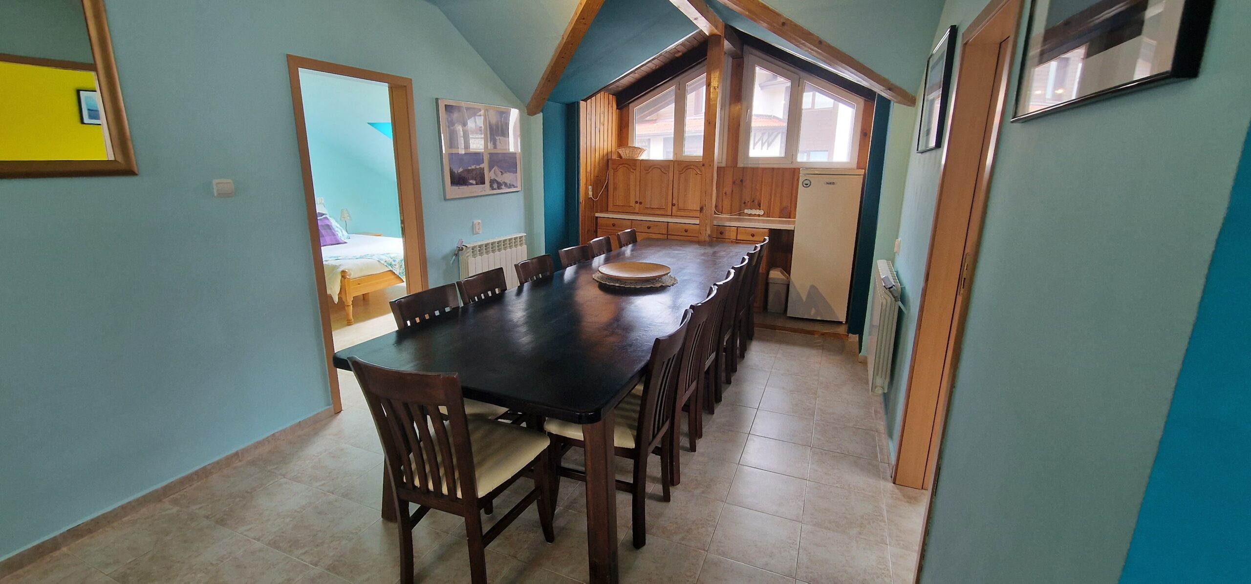 •  3rd floor; there is an open plan living room with a second kitchen and a large wooden dining table,  can sit 12 people , and 2 large sofas next to the fire place.  Beyond, there is a cosy living area with a sofa and big TV. There are 2 bedrooms, 2 bathrooms on this level. This floor has access to a large balcony area with beautiful views to the mountain.