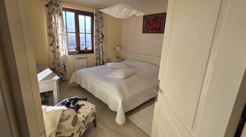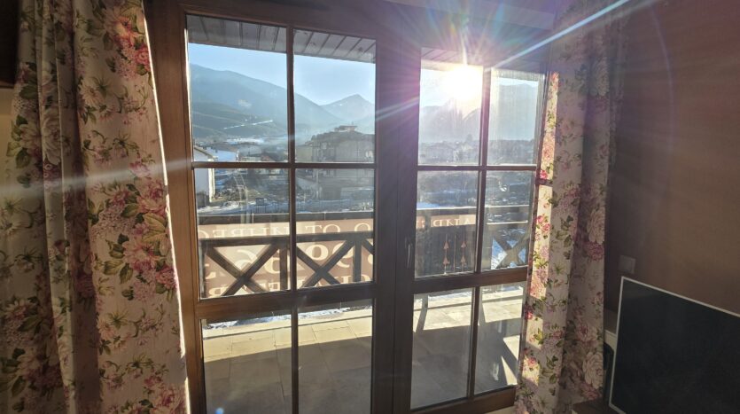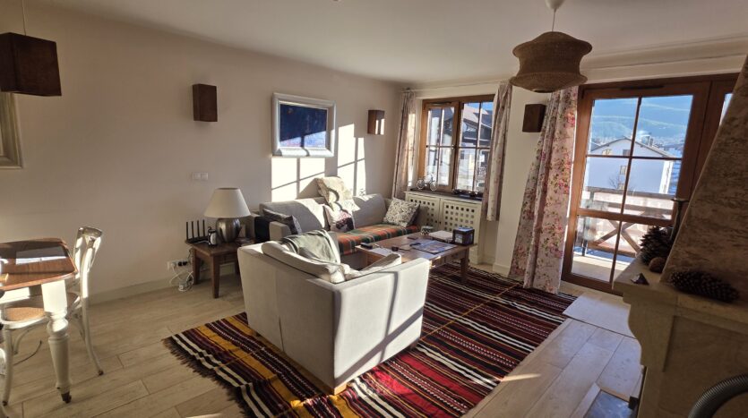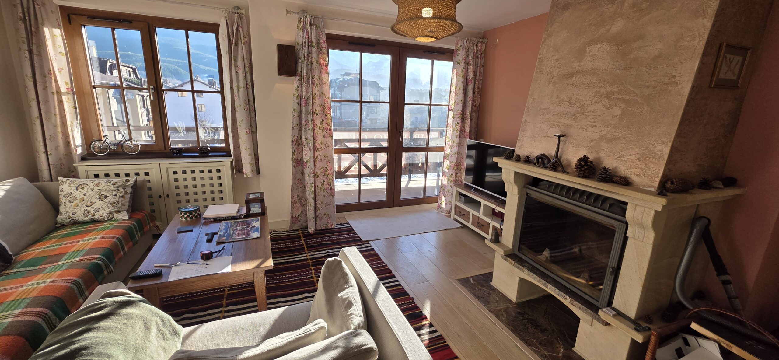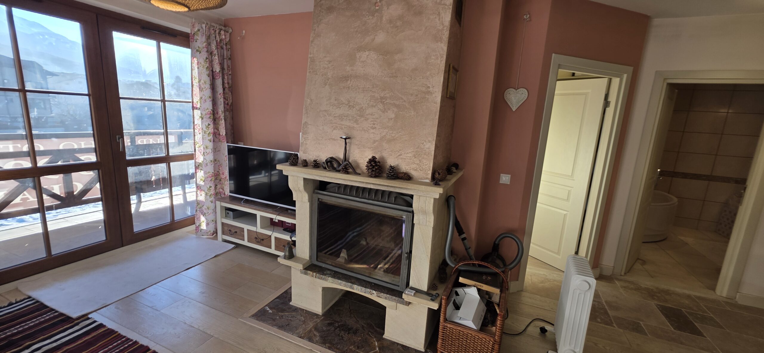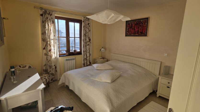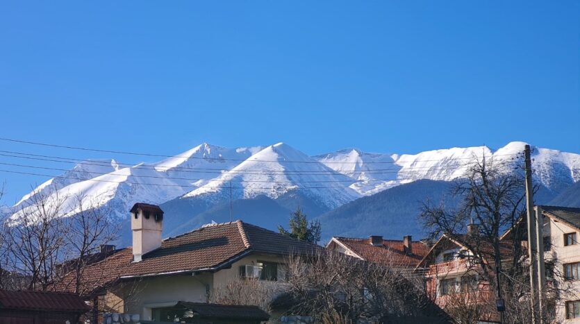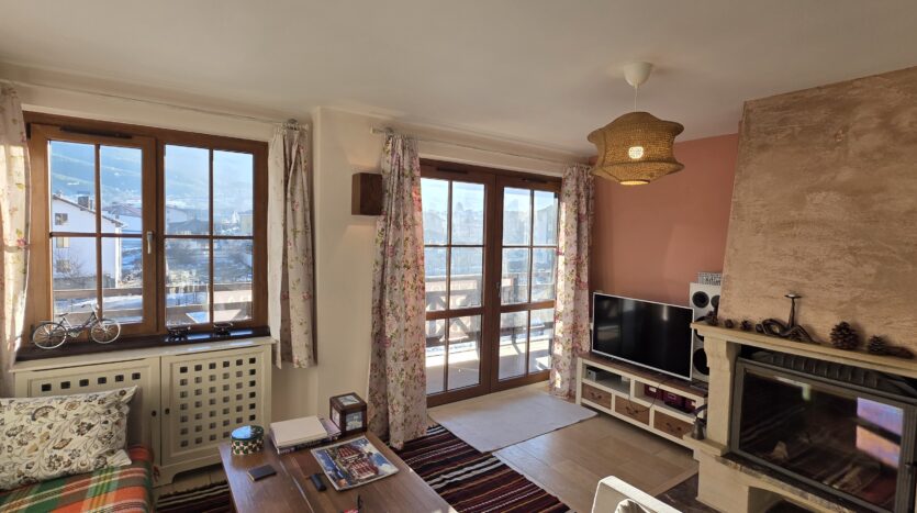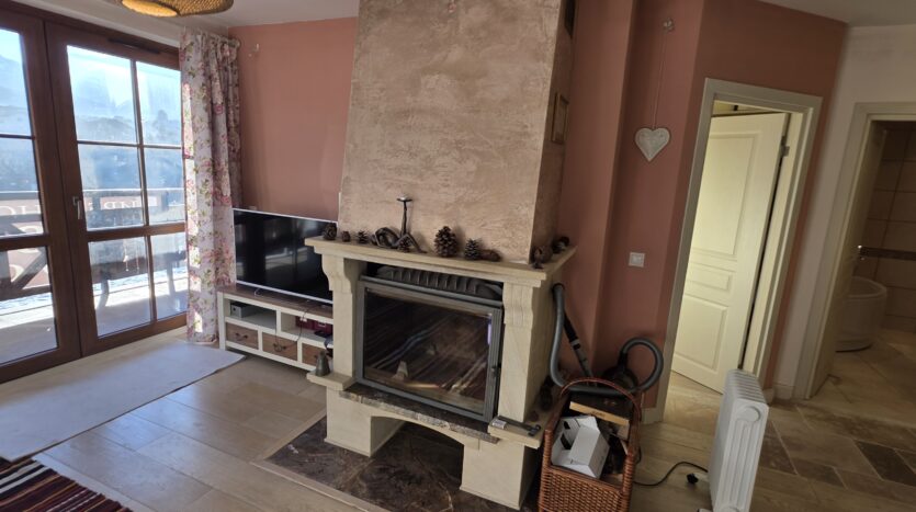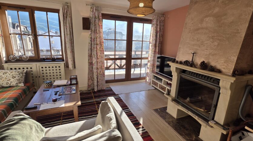 The apartment consists of an entrance hallway, spacious custom-made kitchen, made of solid wood fully equipped with an oven, ceramic hob, extractor and a washing machine. The living/dinning area has a log- fireplace and is beautifully furnished with a dining area and a sofa with an armchair, coffee table and a TV. There is an access to a spacious South-facing balcony with an amazing panoramic view of Pirin mountains. The main bedroom is furnished with a double bed, bedside tables and a large wardrobe and has an en-suite bathroom equipped with a bathtub, sink and toilet. The second bedroom has а bunk bed, desk and a large wardrobe. The furniture are made of solid wood. The second bathroom is equipped with a shower, sink and a toilet.