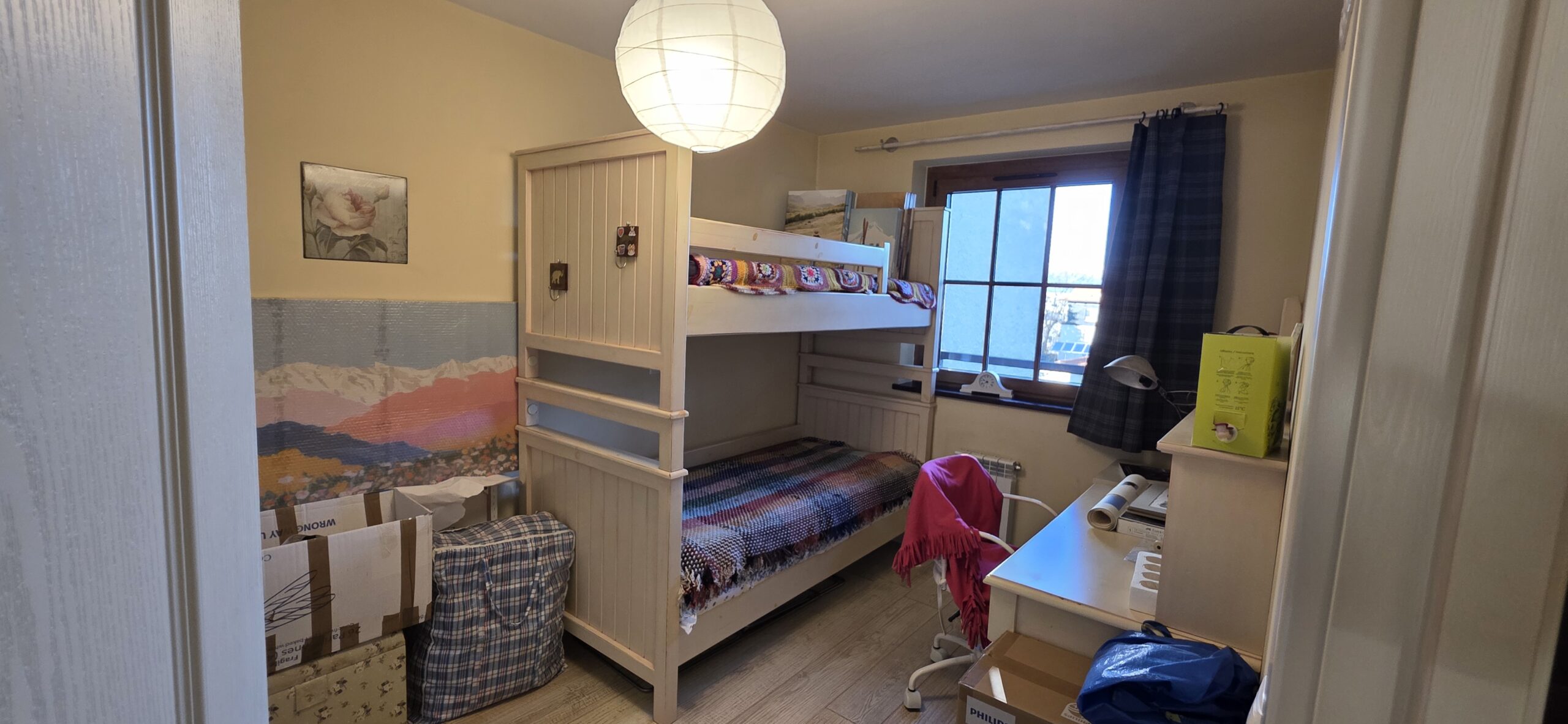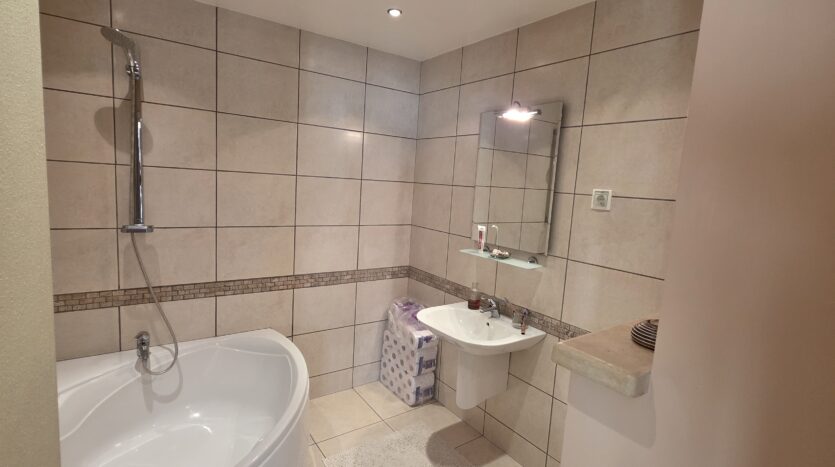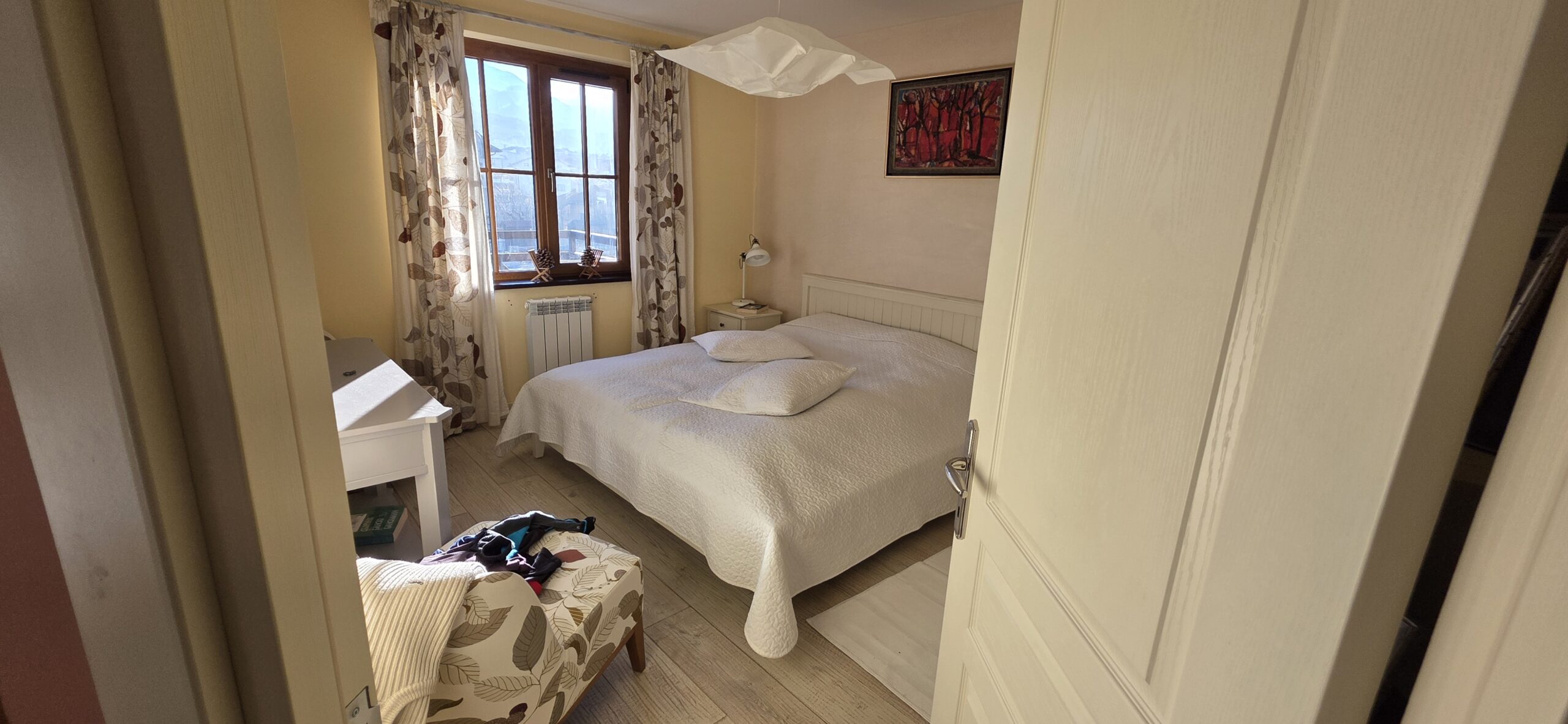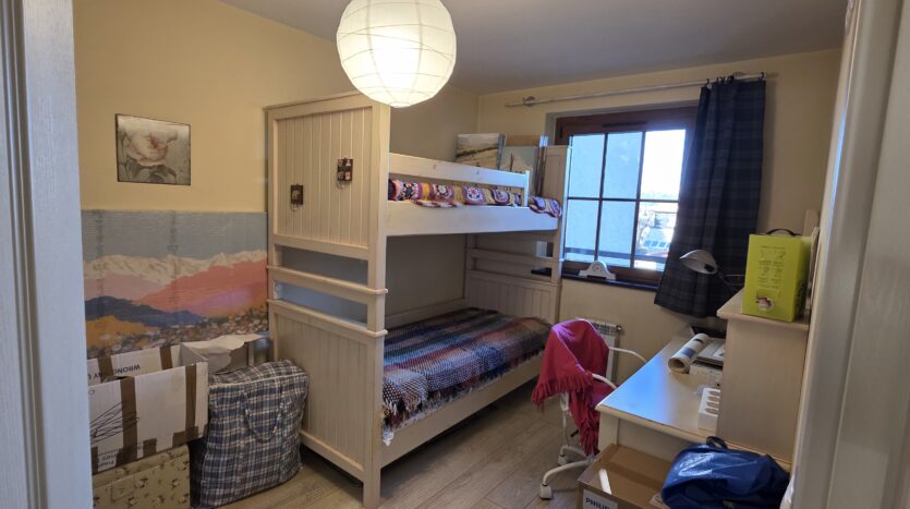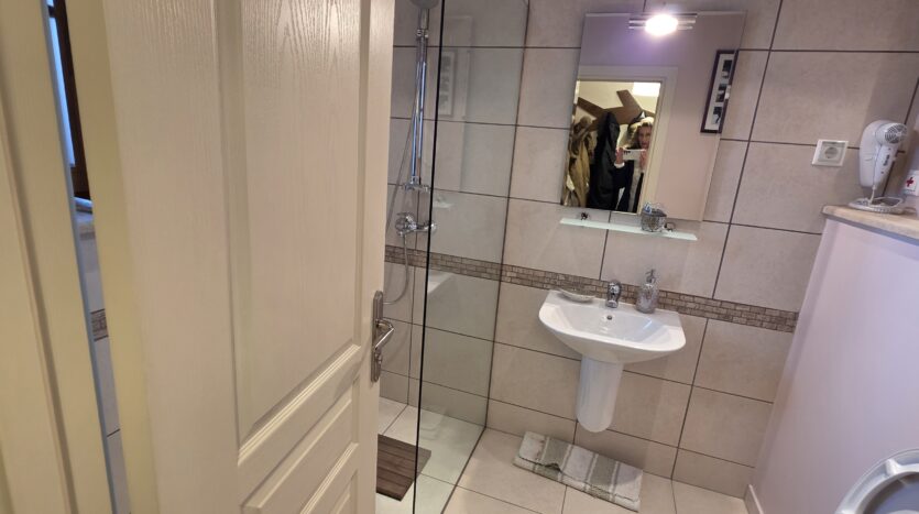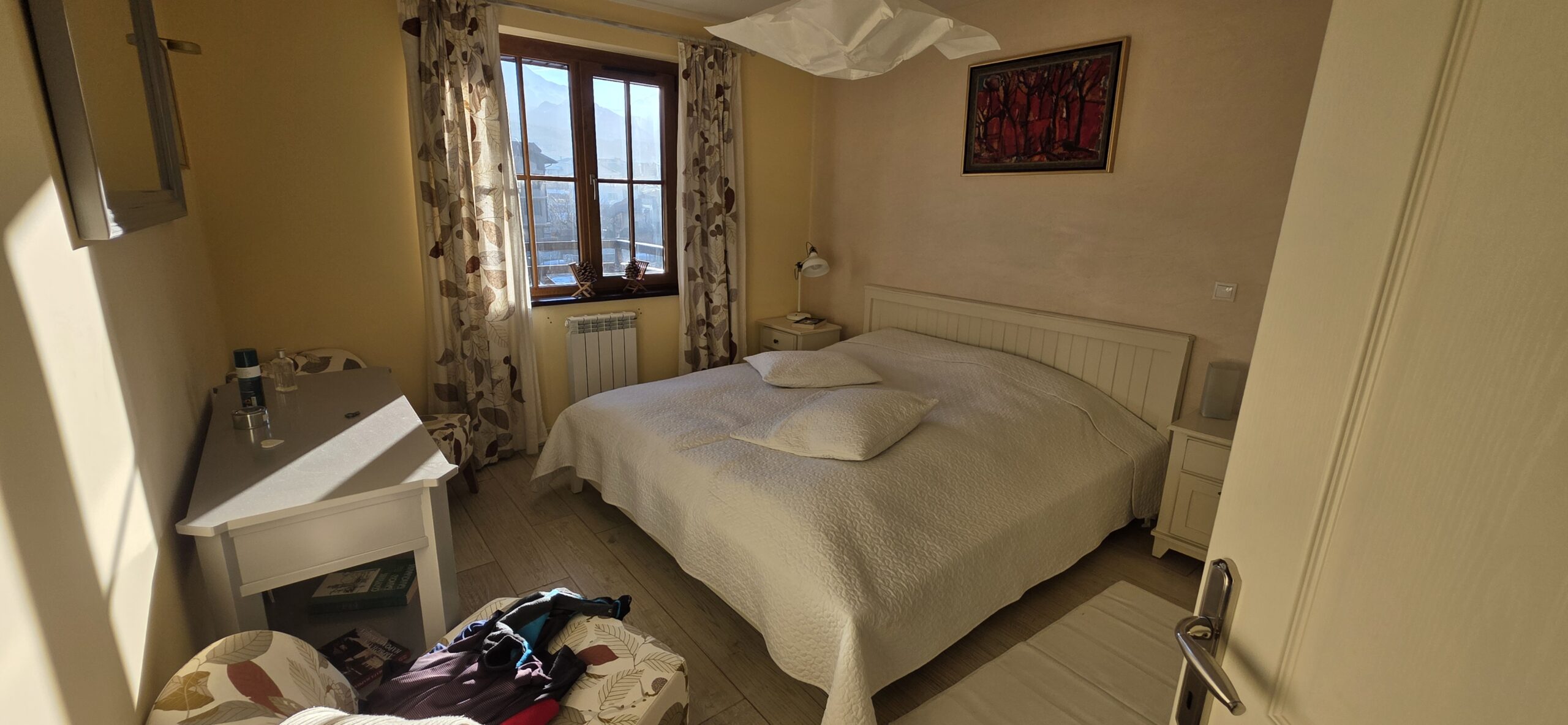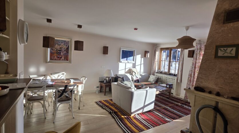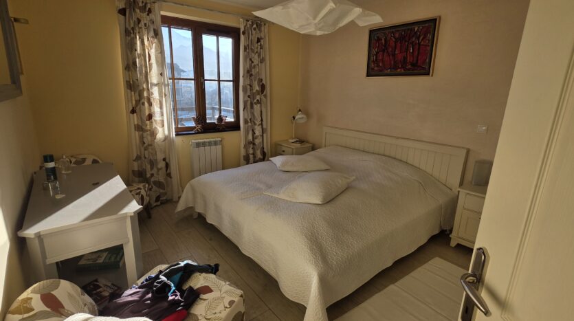 The apartment consists of an entrance hallway, spacious custom-made kitchen, made of solid wood fully equipped with an oven, ceramic hob, extractor and a washing machine. The living/dinning area has a log- fireplace and is beautifully furnished with a dining area and a sofa with an armchair, coffee table and a TV. There is an access to a spacious South-facing balcony with an amazing panoramic view of Pirin mountains. The main bedroom is furnished with a double bed, bedside tables and a large wardrobe and has an en-suite bathroom equipped with a bathtub, sink and toilet. The second bedroom has а bunk bed, desk and a large wardrobe. The furniture are made of solid wood. The second bathroom is equipped with a shower, sink and a toilet.
