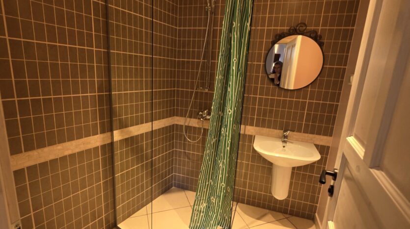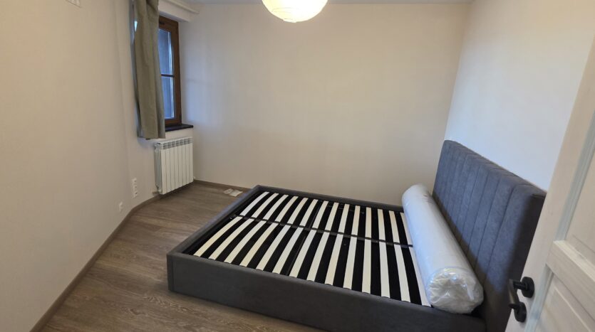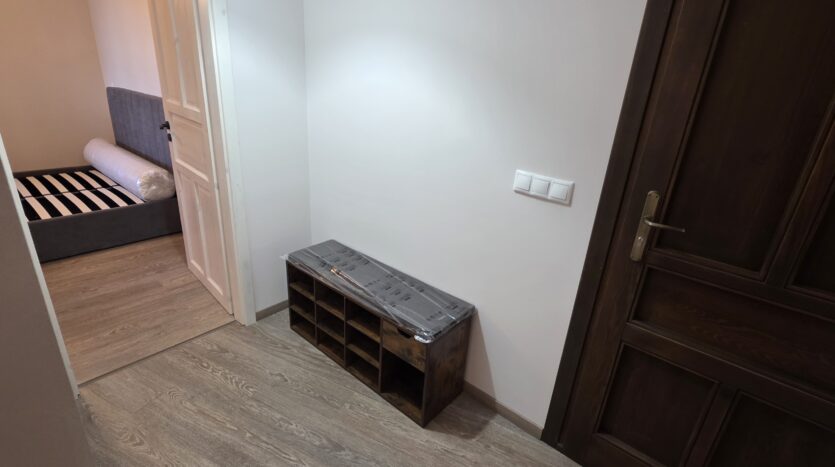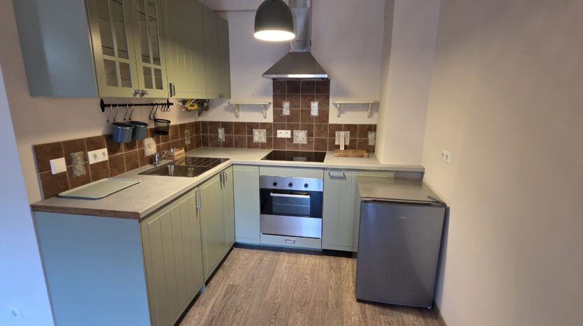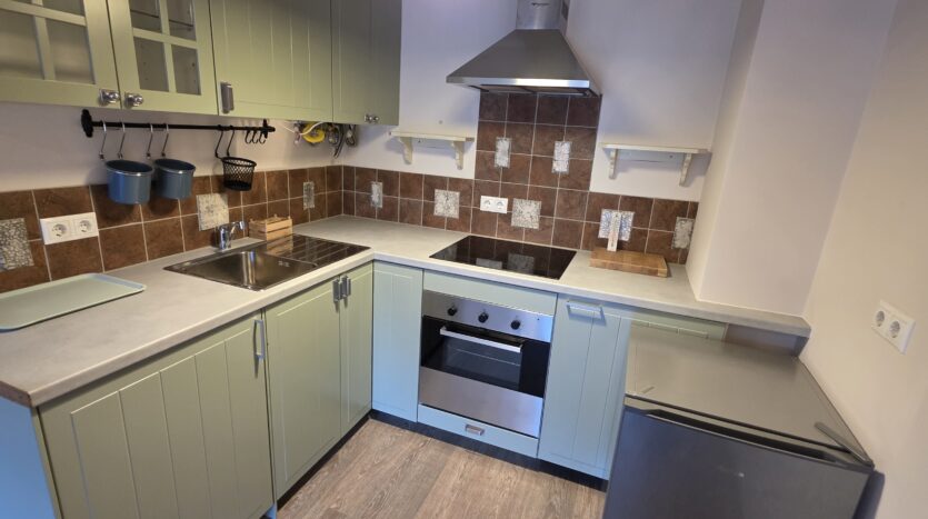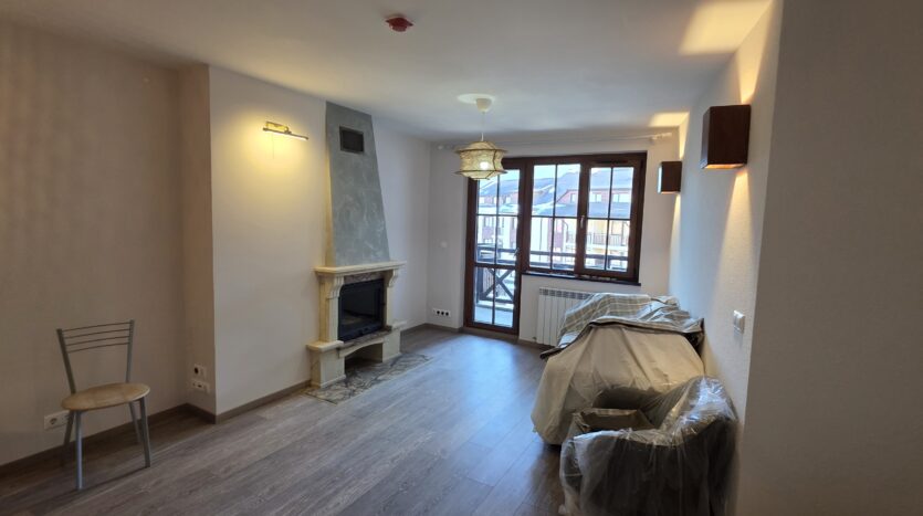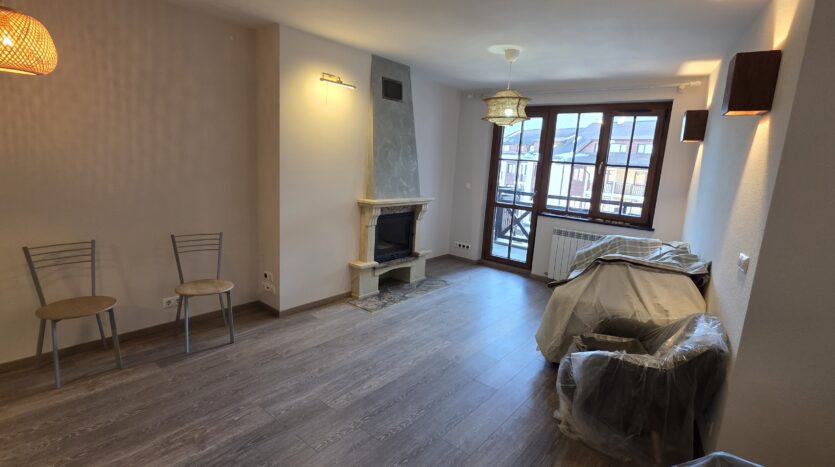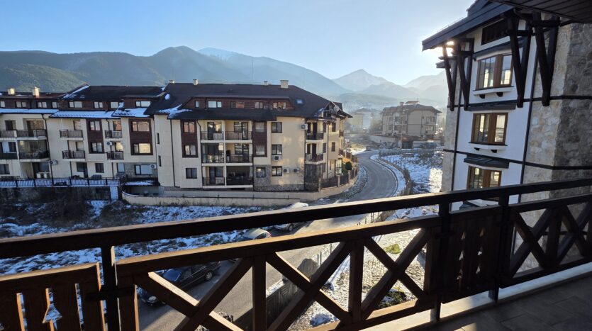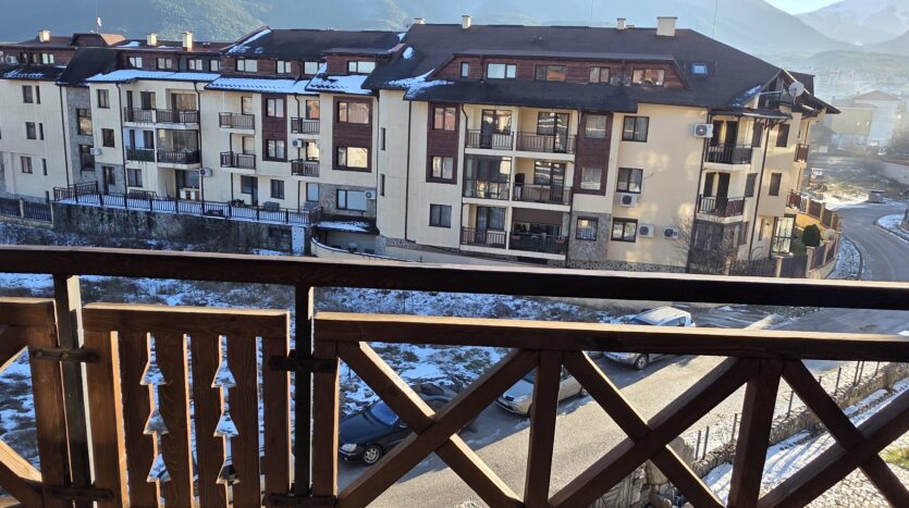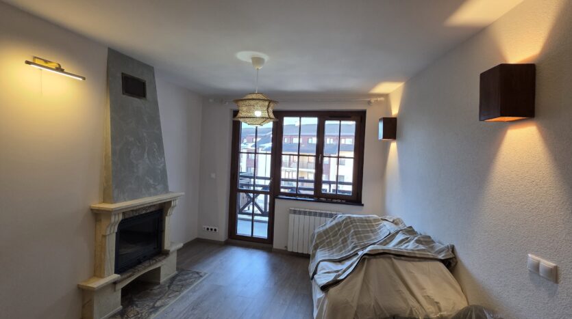 The apartment consists of an entrance hallway, living/dining room with a kitchenette equipped with an oven, ceramic hob, extractor and refrigerator, a dining area and a bright sitting area with a sofa and a log fireplace. There is an access to a spacious balcony with an amazing panoramic view of Pirin mountains. The bedroom is furnished with a double bed. The bathroom is equipped with a shower, sink and a toilet.