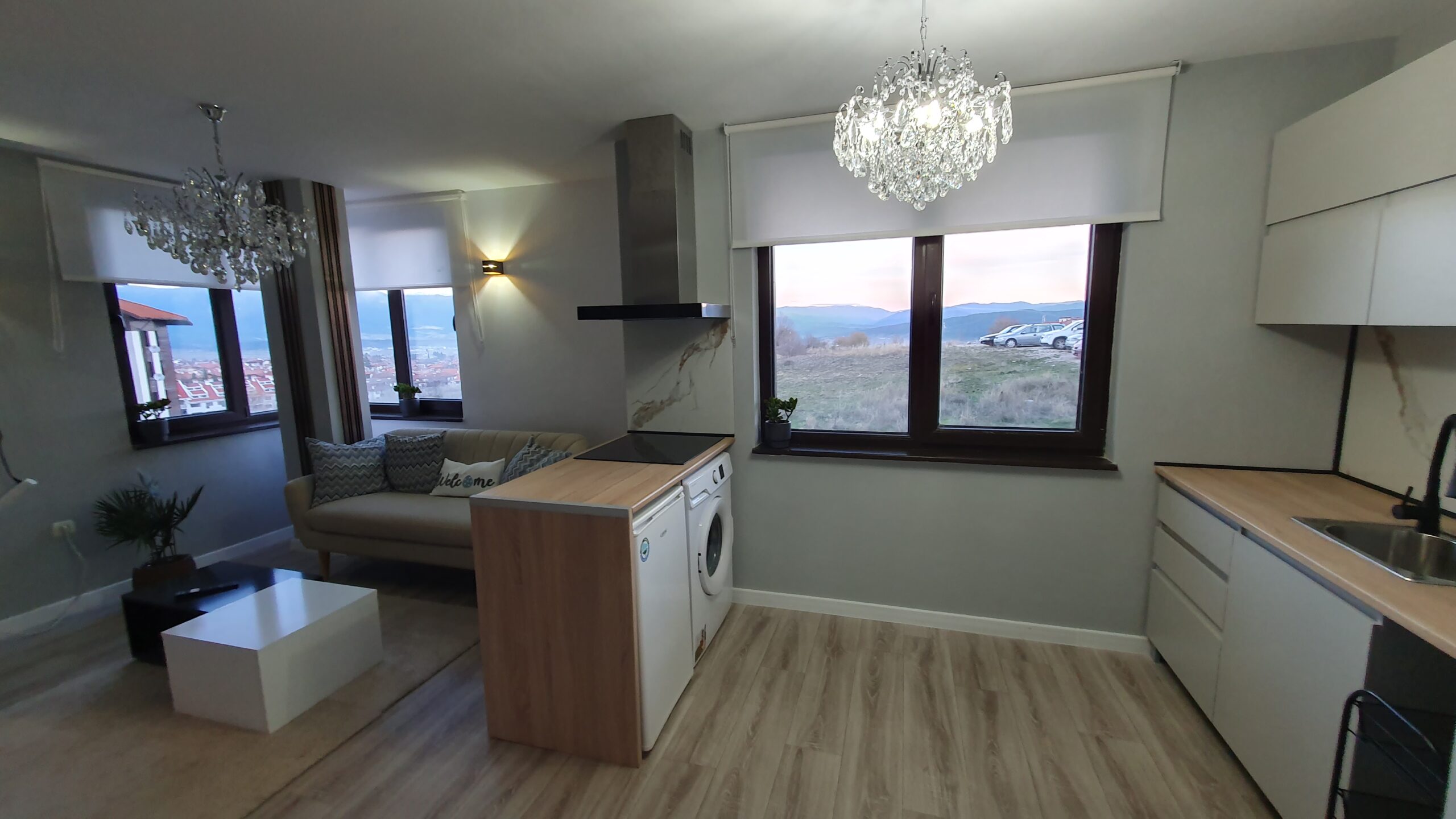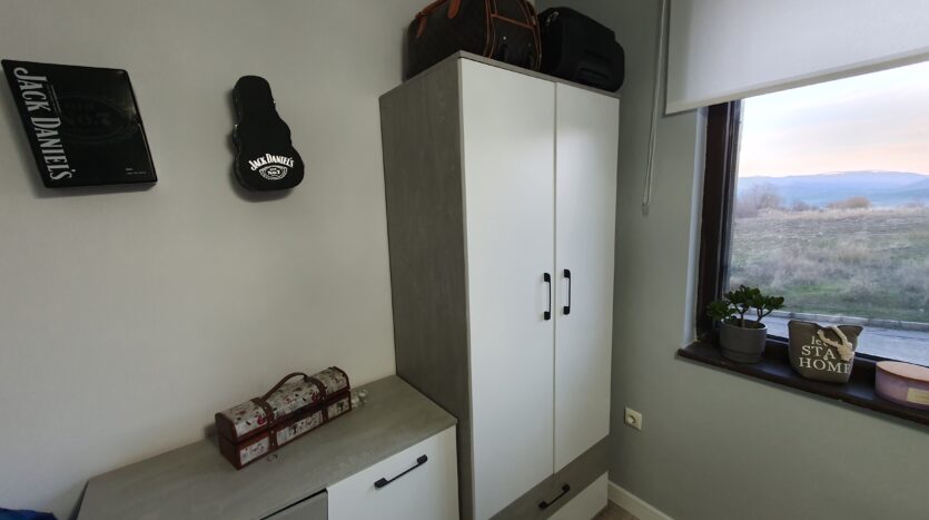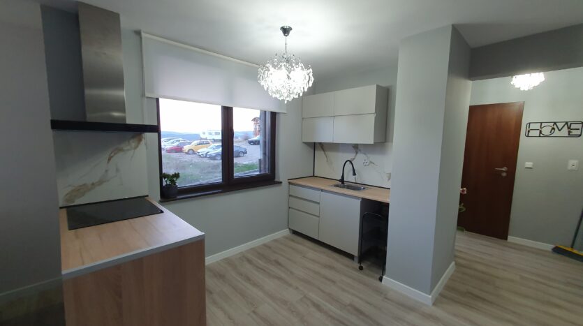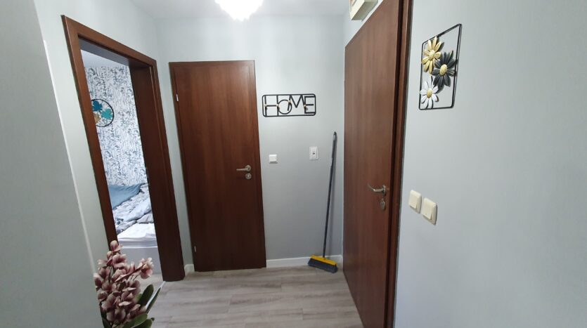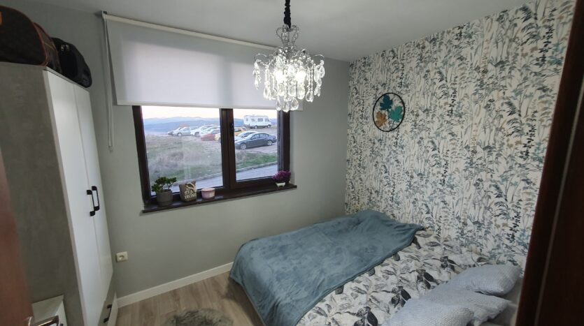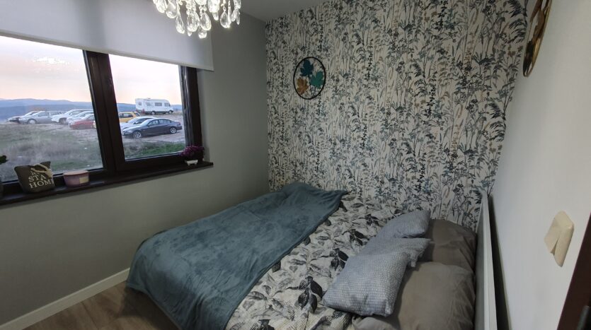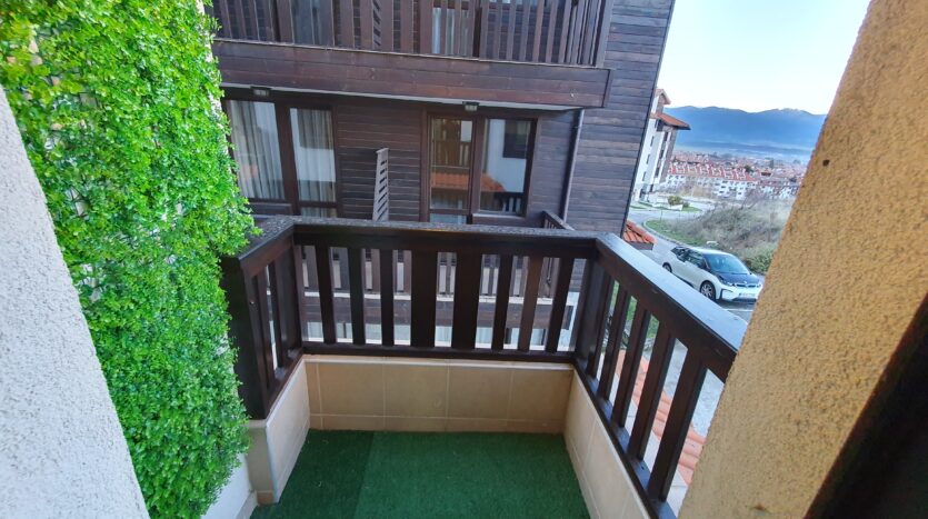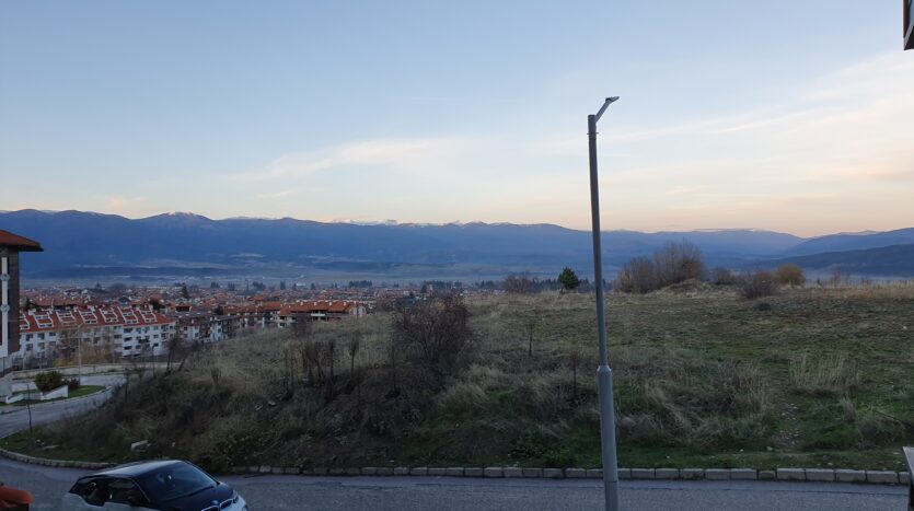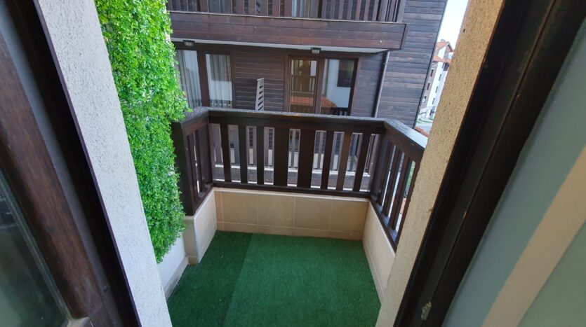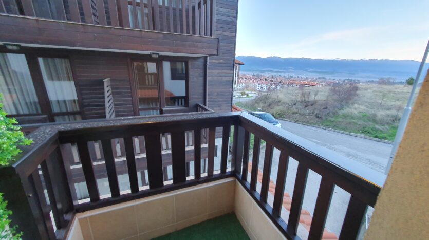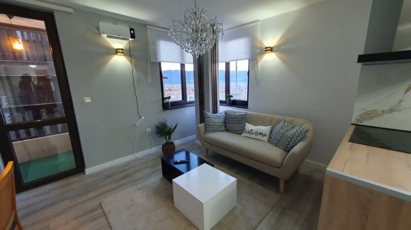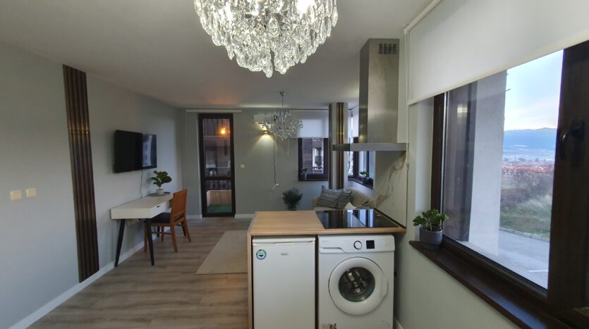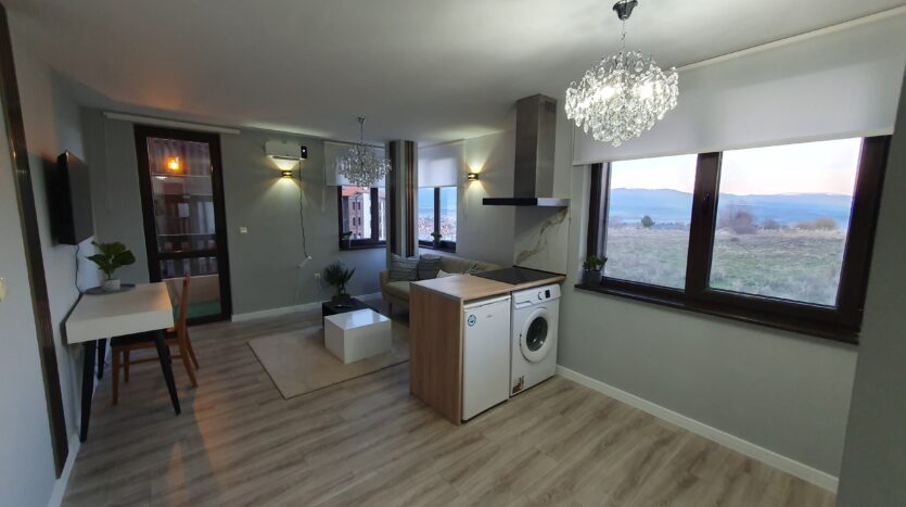 The apartment is furnished and equipped with new furniture and appliances. It consists of an entrance hallway, an open plan living/dining room with a kitchenette equipped with a ceramic hob, extractor, refrigerator, washing machine and a dinning table with a chair. The lounge area is modernly furnished with a sofa bed, coffeе table and TV. There is an access to a balcony with a beautiful view of Pirin mountain. The bedroom is furnished with a double bed, chest of drawers and a wardrobe.The bathroom is equipped with a shower, toilet, sink and a hot water boiler.