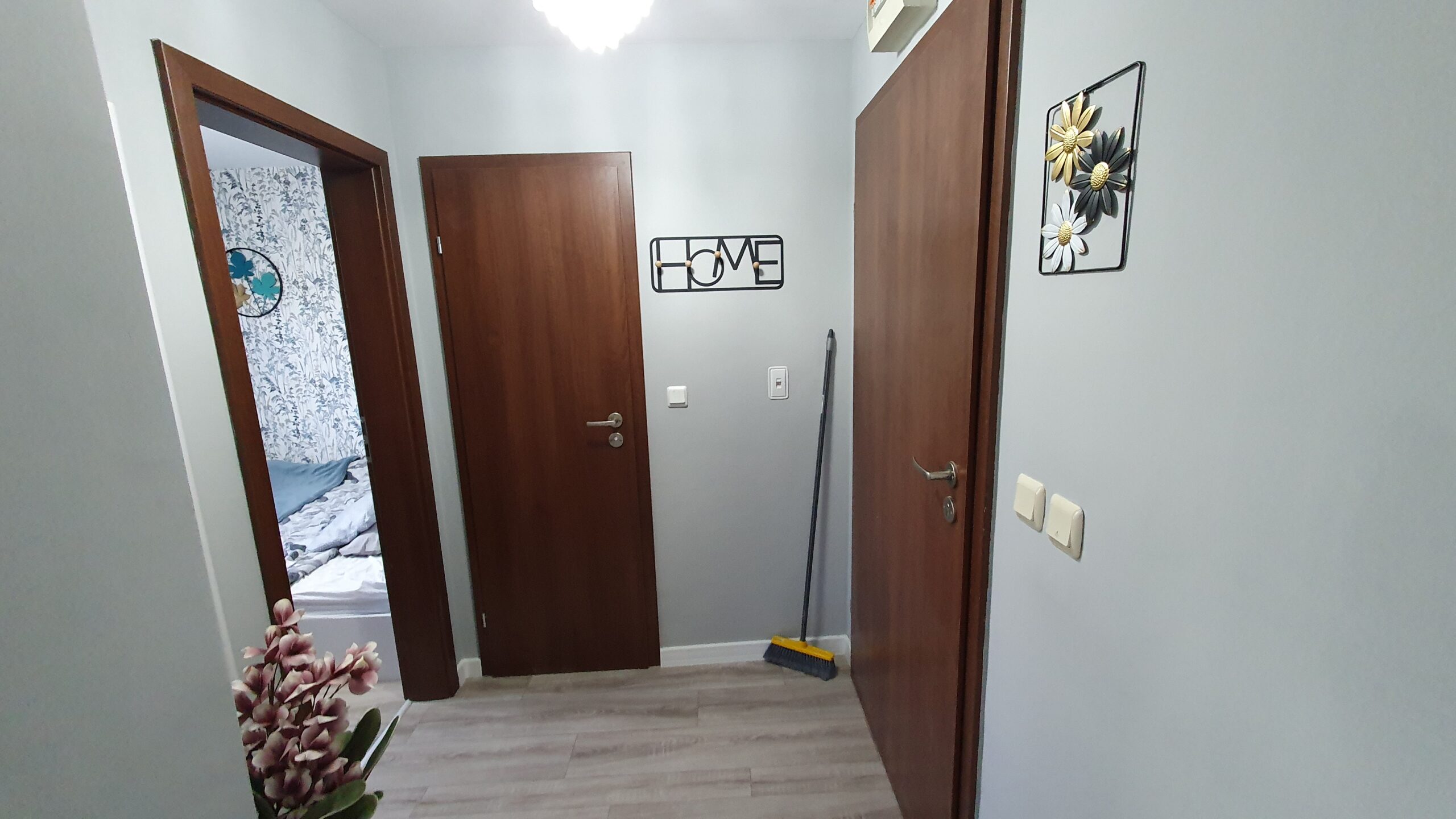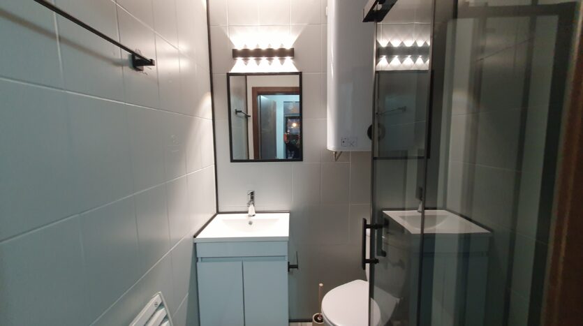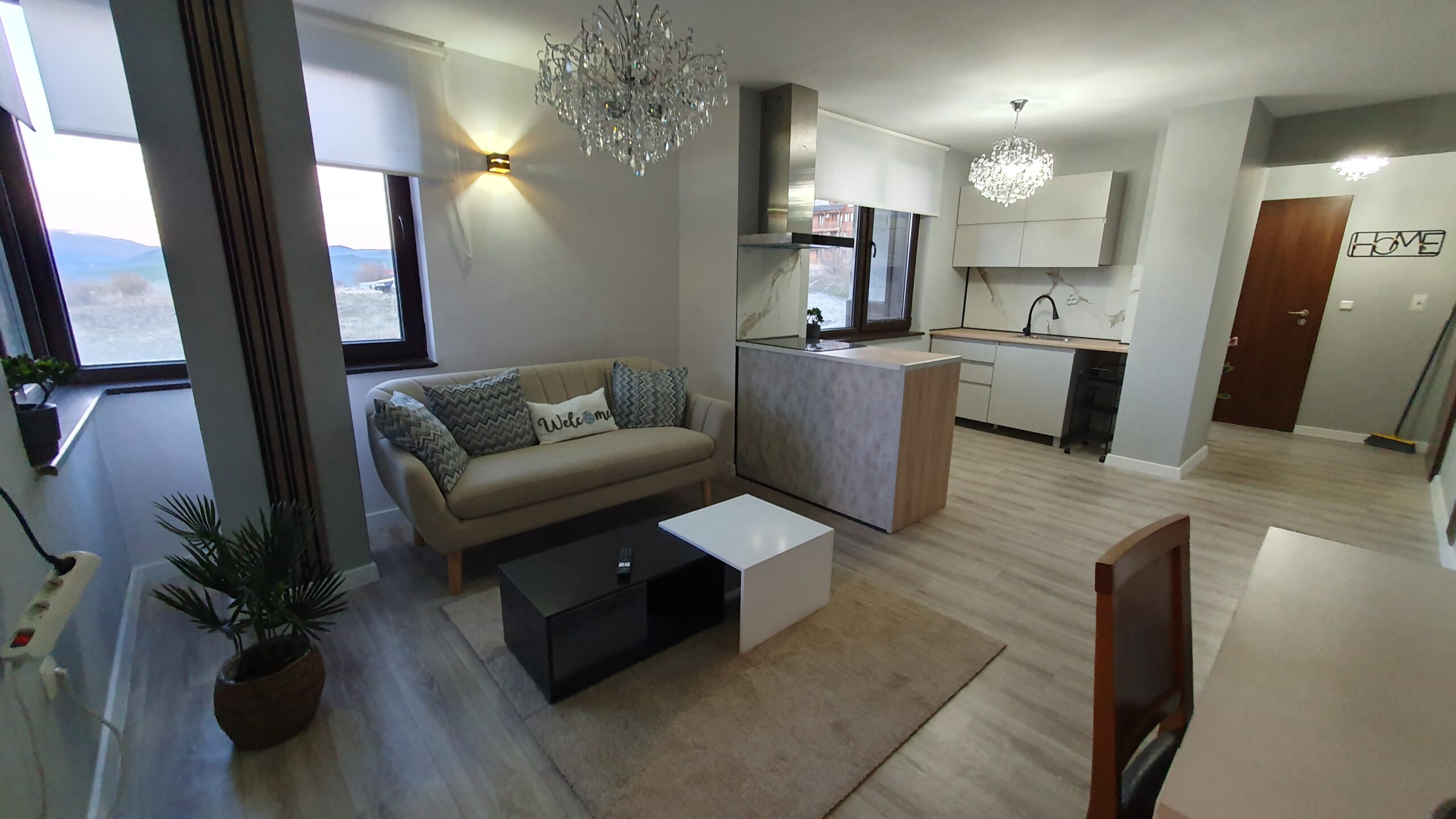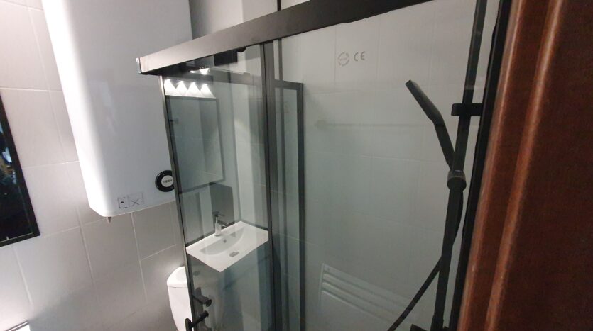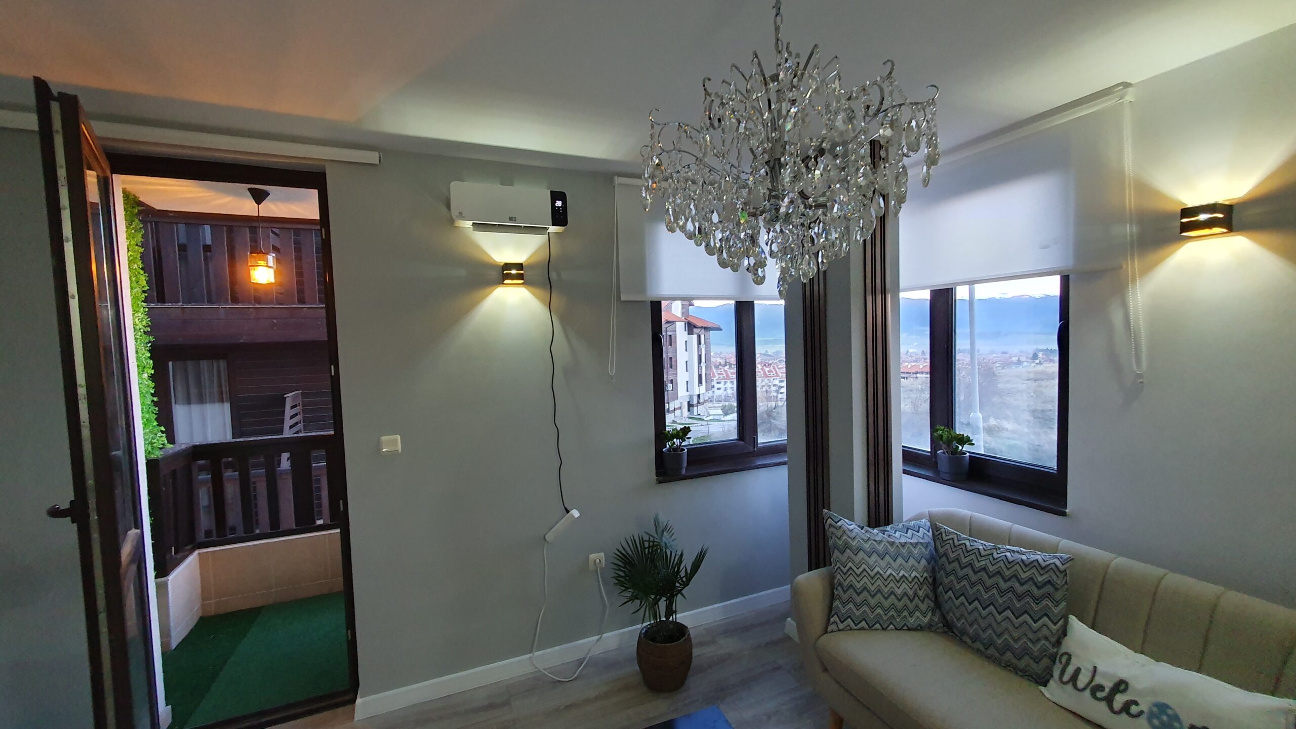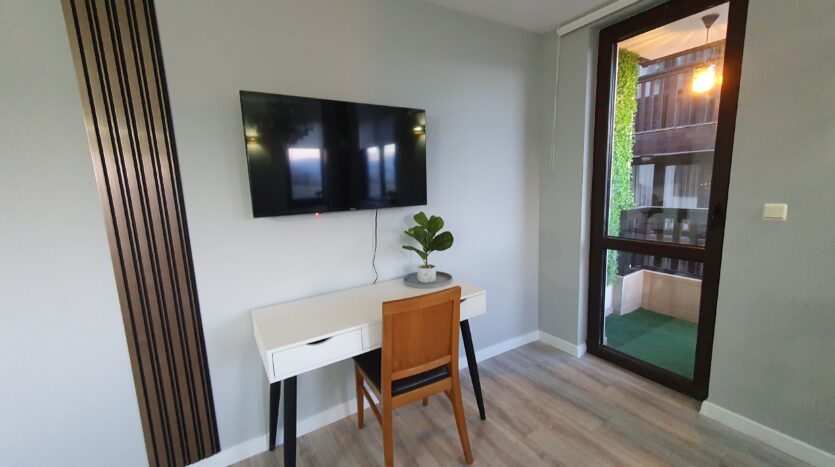 The apartment is furnished and equipped with new furniture and appliances. It consists of an entrance hallway, an open plan living/dining room with a kitchenette equipped with a ceramic hob, extractor, refrigerator, washing machine and a dinning table with a chair. The lounge area is modernly furnished with a sofa bed, coffeе table and TV. There is an access to a balcony with a beautiful view of Pirin mountain. The bedroom is furnished with a double bed, chest of drawers and a wardrobe.The bathroom is equipped with a shower, toilet, sink and a hot water boiler.