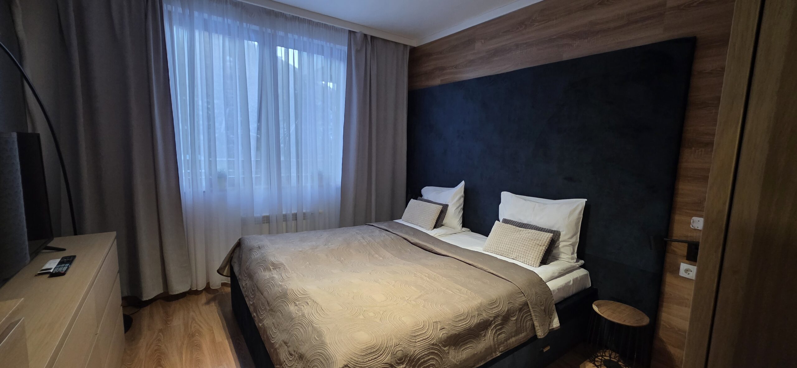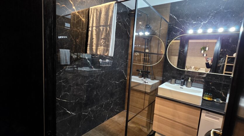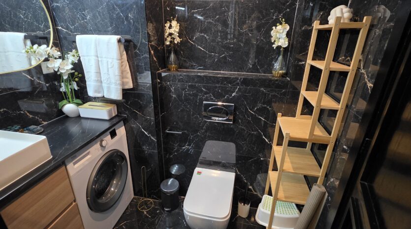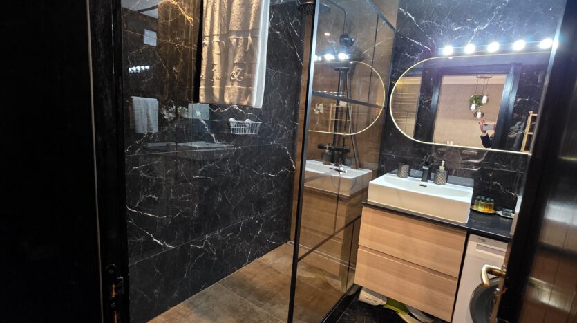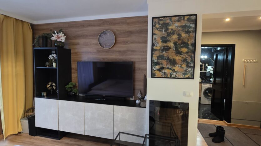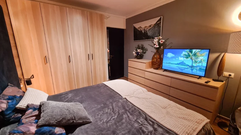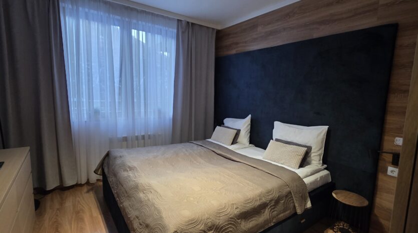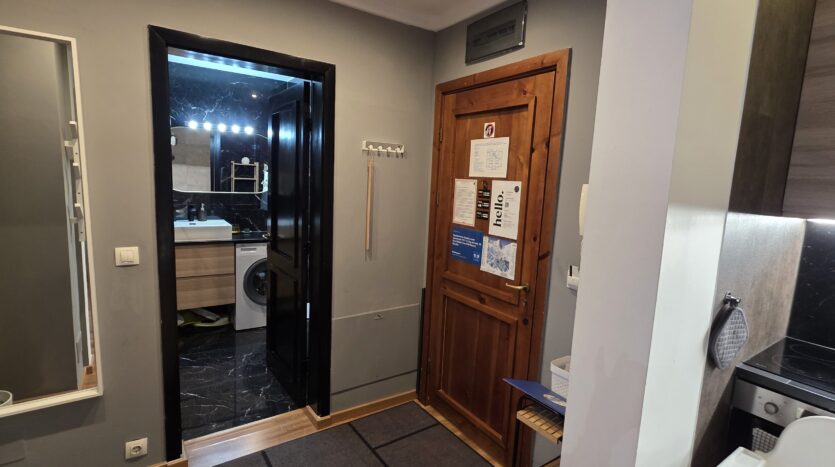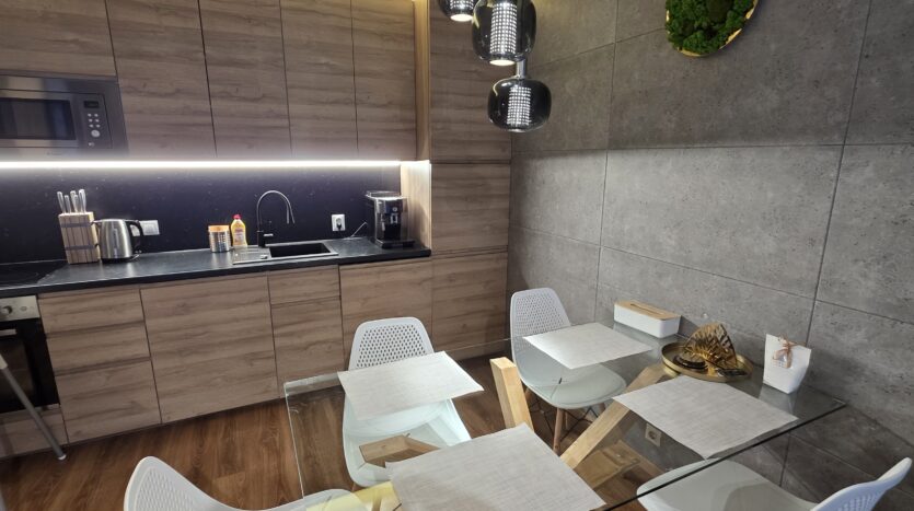 The apartment consists of an entrance hallway, a spacious living/dining room with a kitchenette equipped with an oven, ceramic hobs, extractor, microwave oven and a refrigerator, dining area, a corner sofa bed and a TV with TV unit. The bedroom is furnished with a double bed, bedside tables and а wardrobe. The bathroom is luxuriously equipped with a shower cabin, sink, washing machine and a toilet.