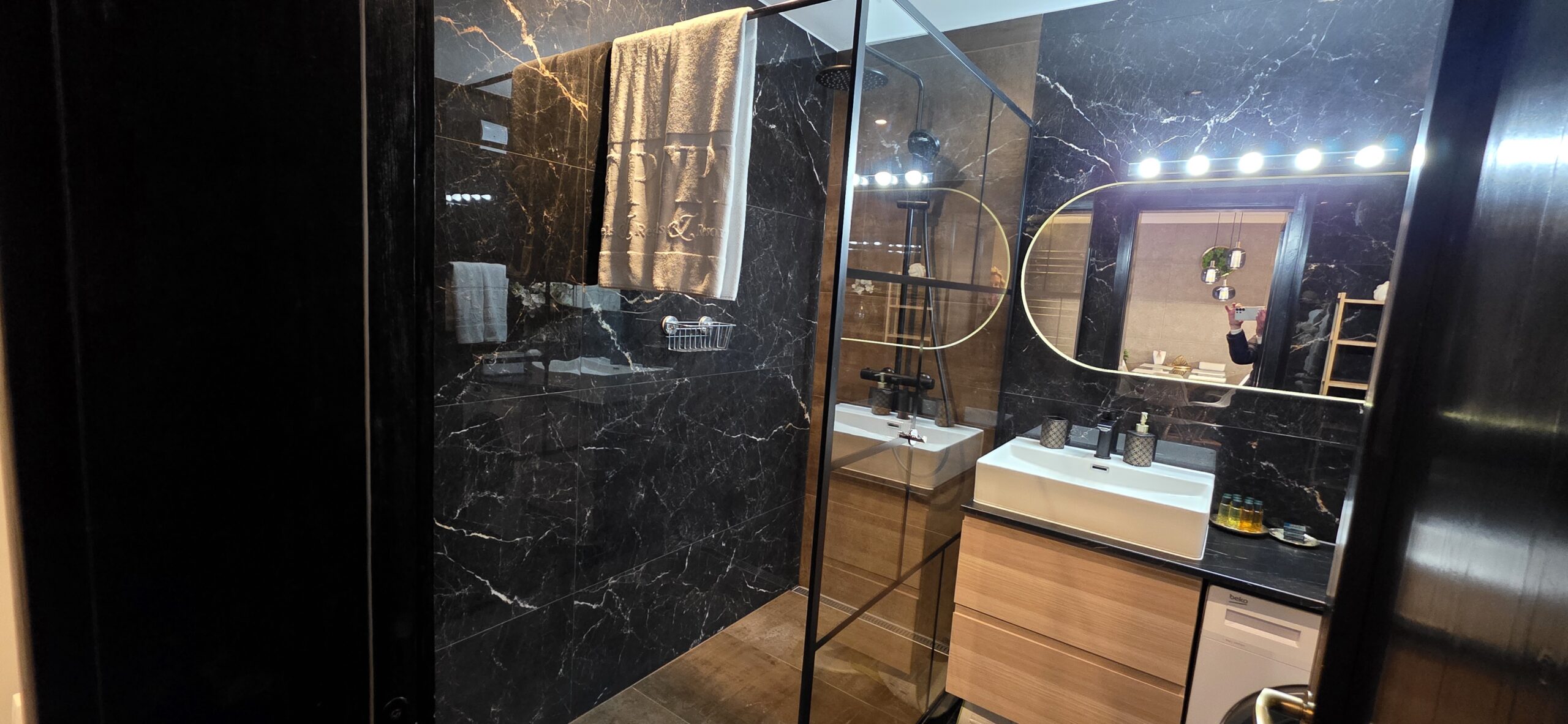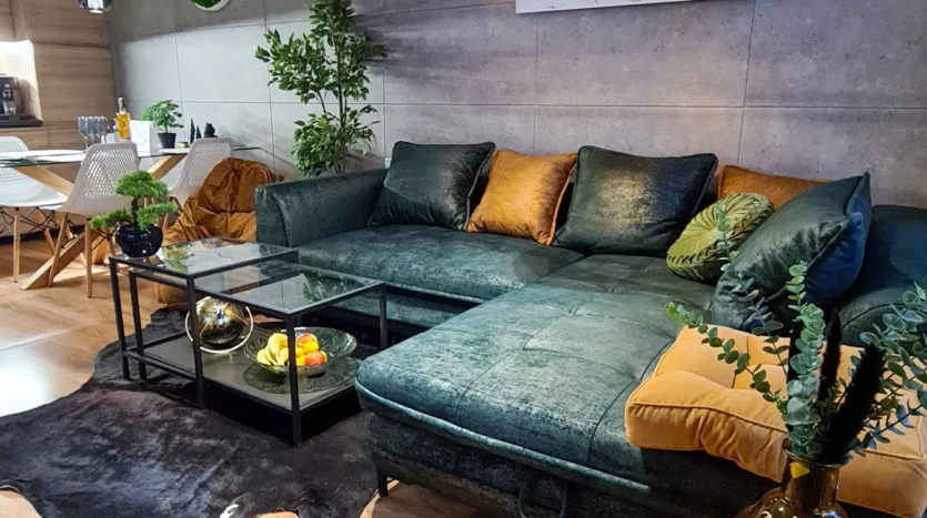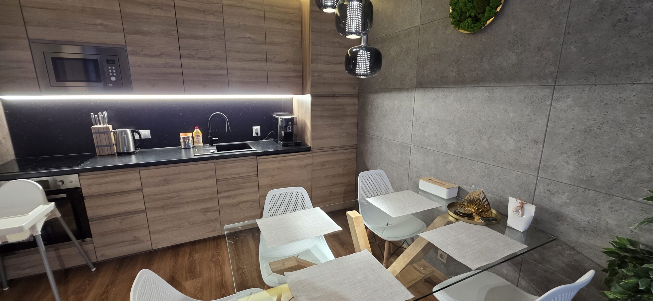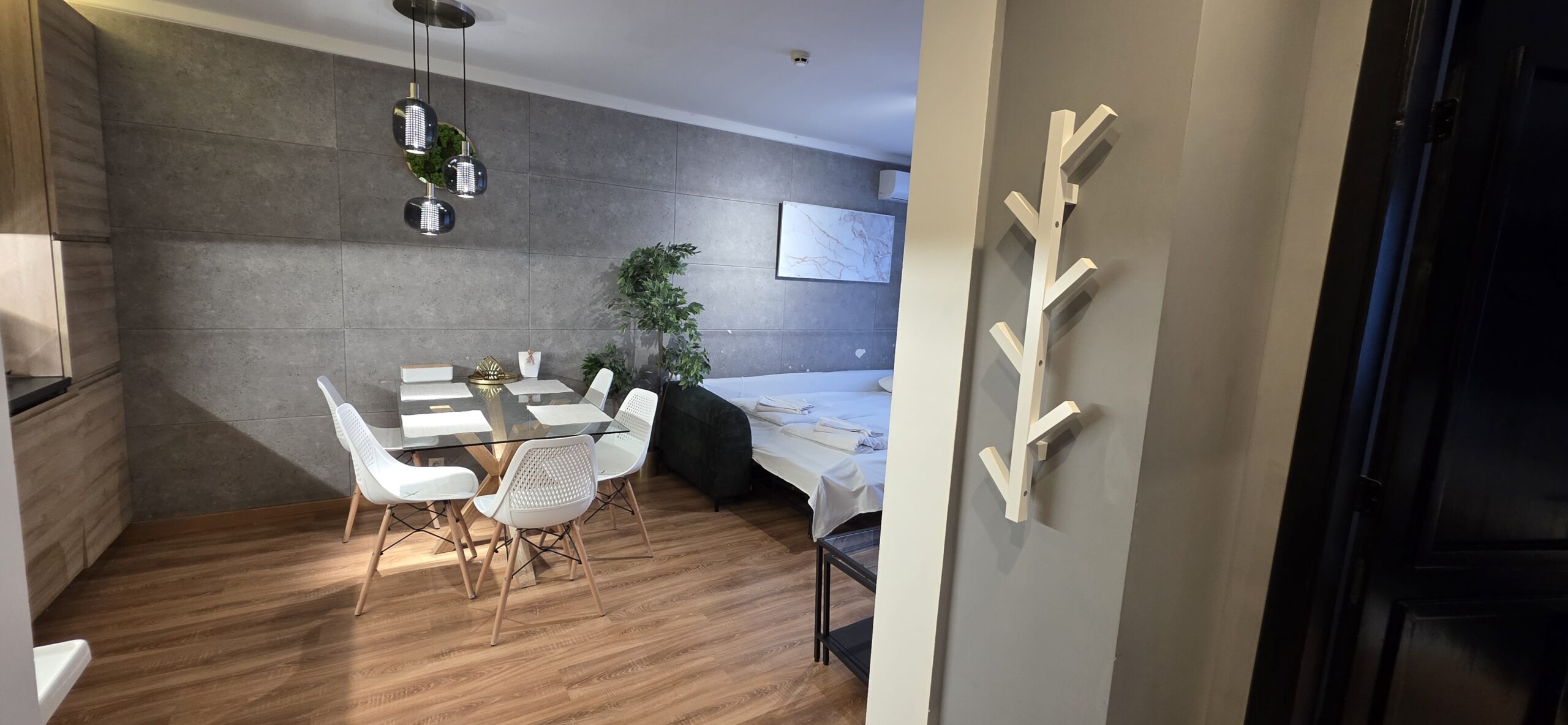 The apartment consists of an entrance hallway, a spacious living/dining room with a kitchenette equipped with an oven, ceramic hobs, extractor, microwave oven and a refrigerator, dining area, a corner sofa bed and a TV with TV unit. The bedroom is furnished with a double bed, bedside tables and а wardrobe. The bathroom is luxuriously equipped with a shower cabin, sink, washing machine and a toilet.