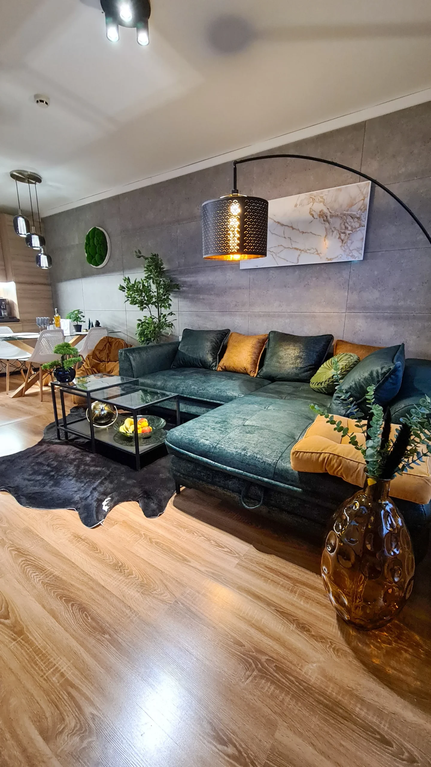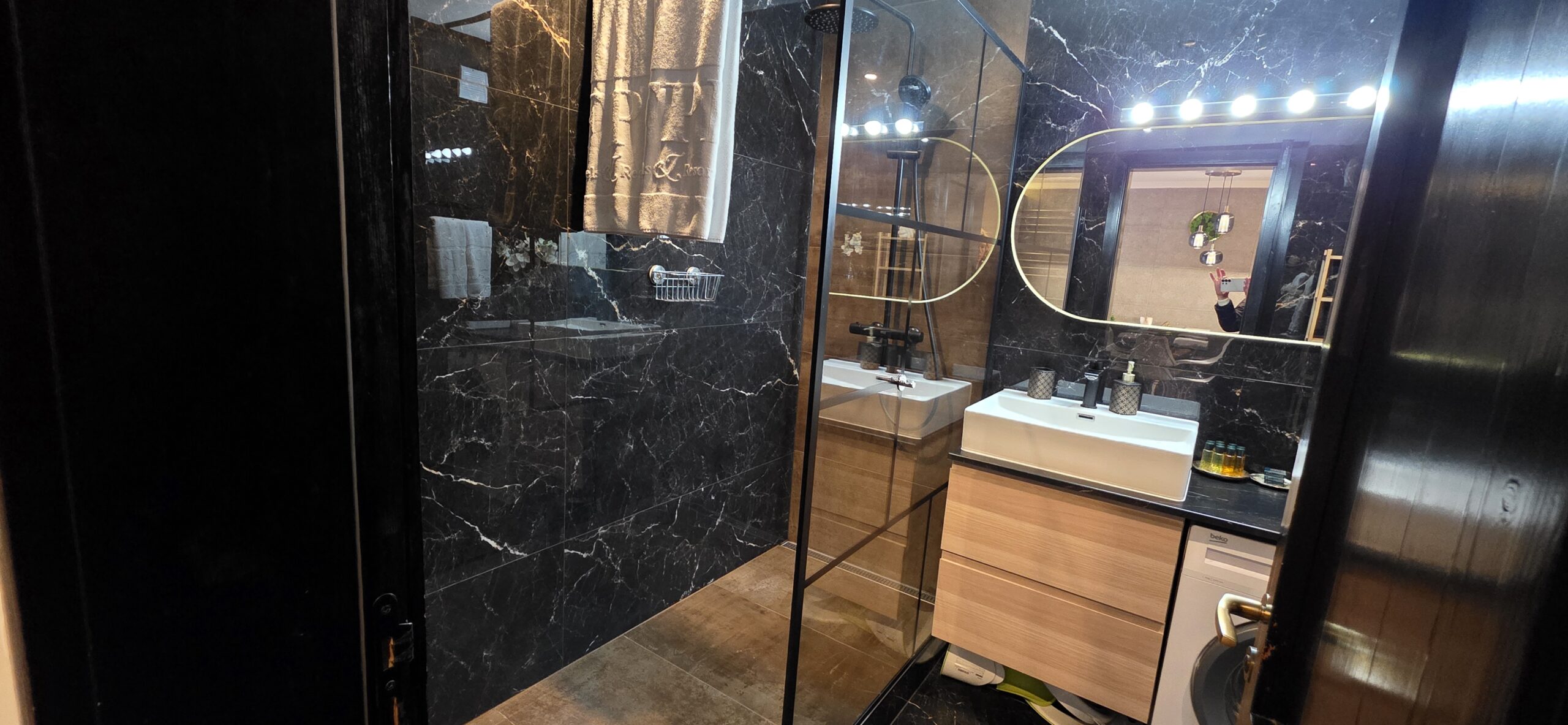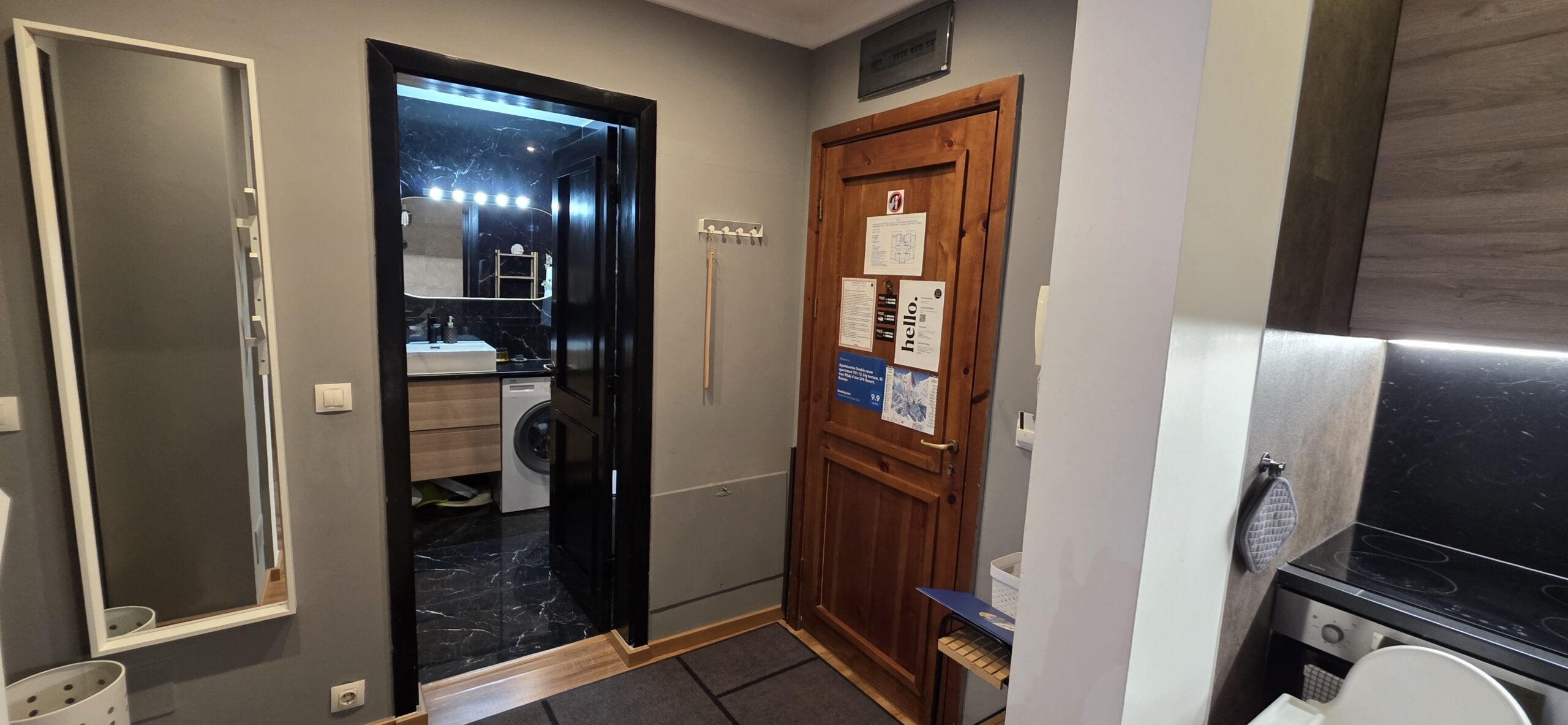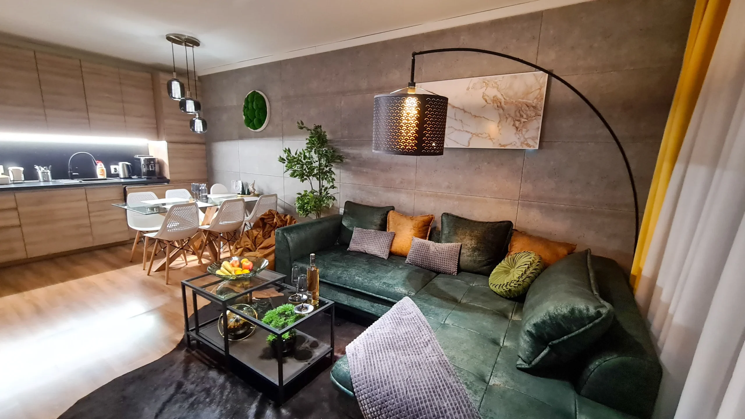 The apartment consists of an entrance hallway, a spacious living/dining room with a kitchenette equipped with an oven, ceramic hobs, extractor, microwave oven and a refrigerator, dining area, a corner sofa bed and a TV with TV unit. The bedroom is furnished with a double bed, bedside tables and а wardrobe. The bathroom is luxuriously equipped with a shower cabin, sink, washing machine and a toilet.