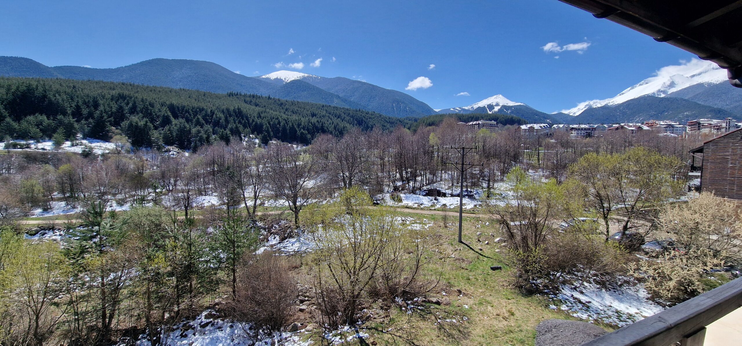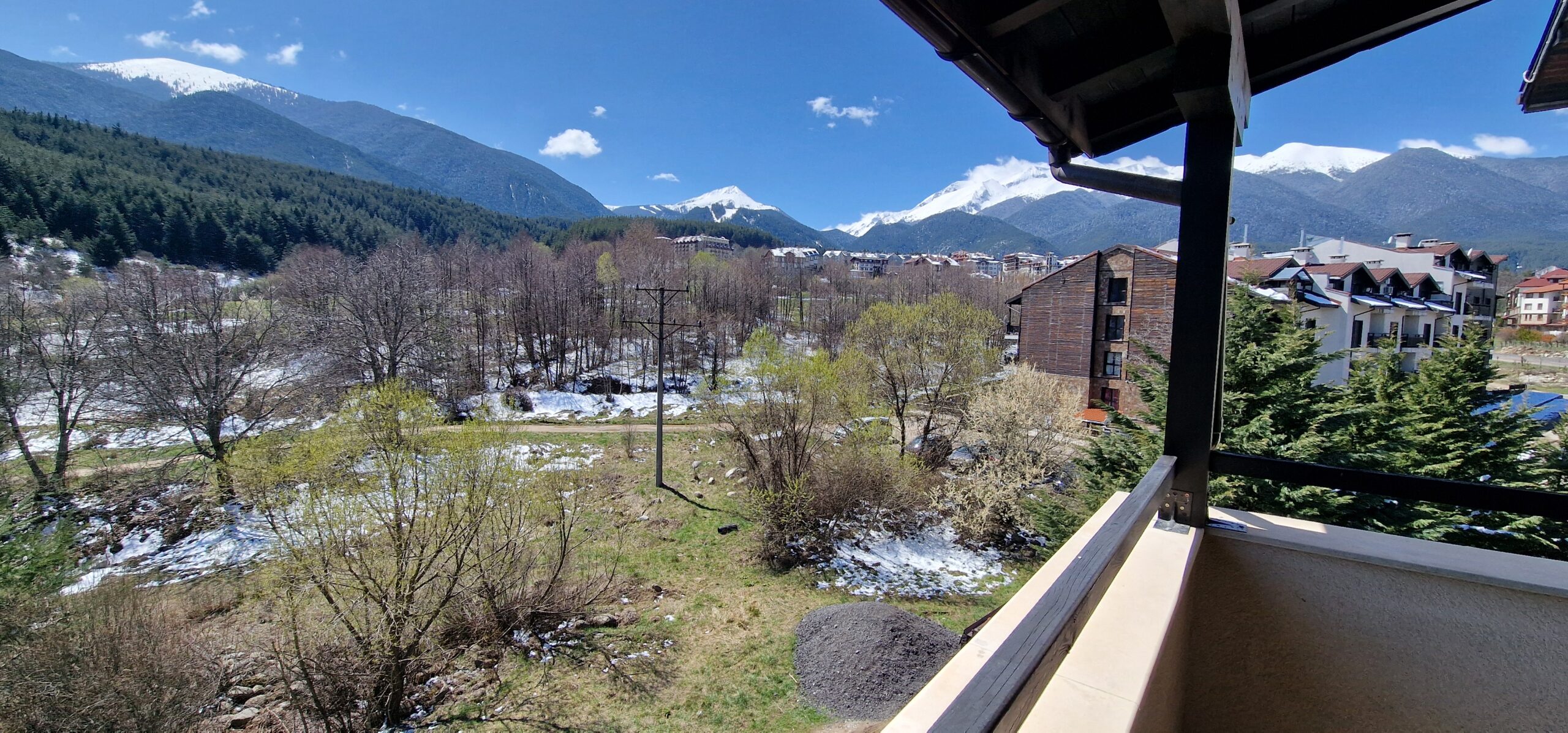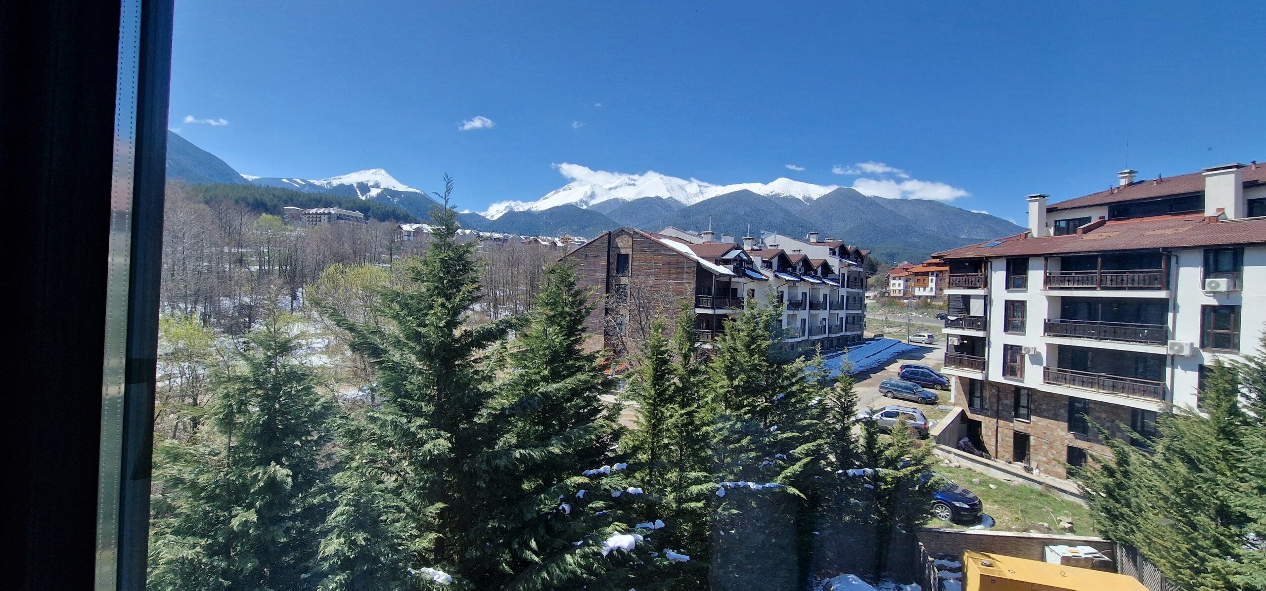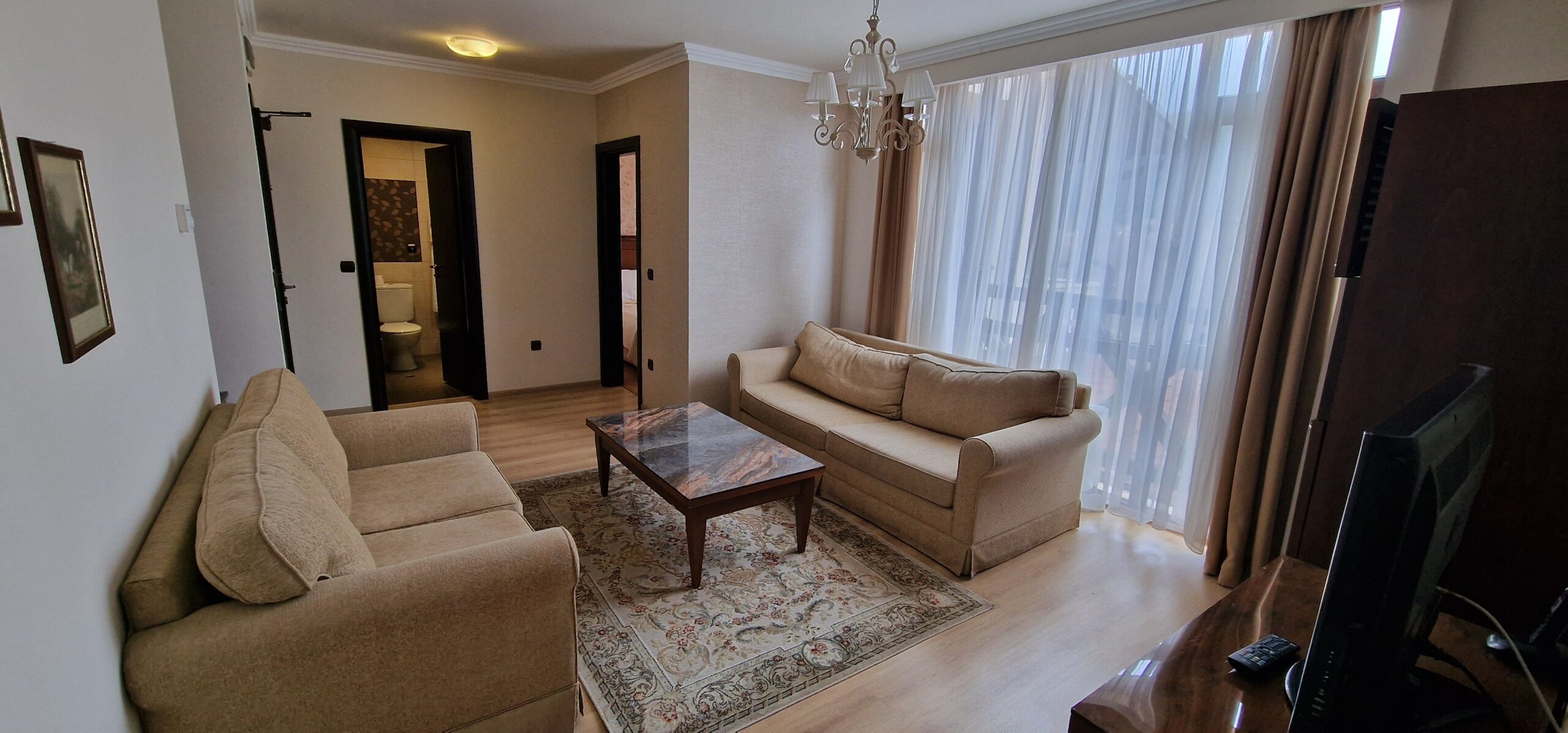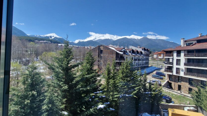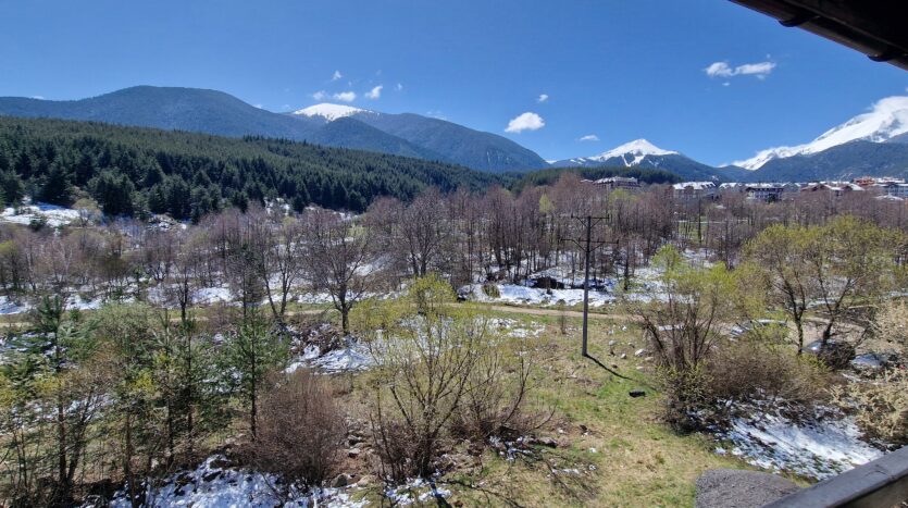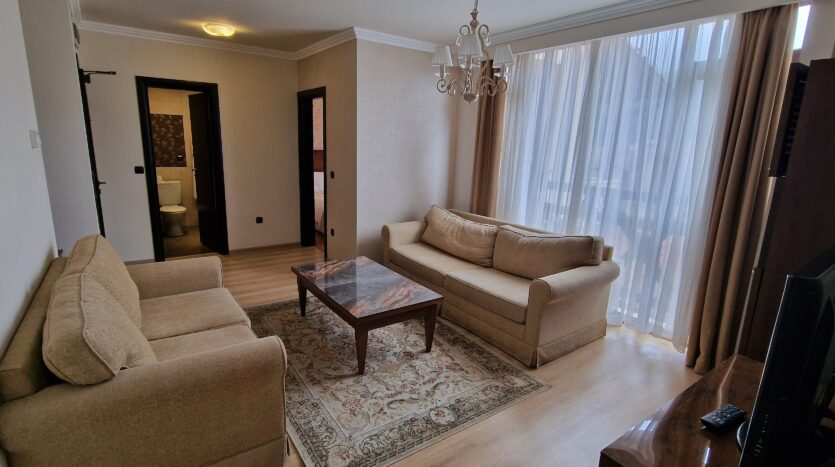 This elegant furnished apartment consists of an open plan living room with two sofas, coffee table and a TV. The main bedroom is beautifully furnished with a king size bed, bedside tables, wardrobe, dressing table with a mirror and a TV and has an un-suite bathroom with a sink, toilet and a shower cabin. The second bedroom has two single beds with bedside tables and a TV. Both bedrooms have access to a spacious terrace with a panoramic view of Pirin mountain and the forest park.