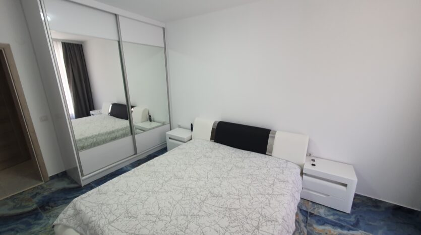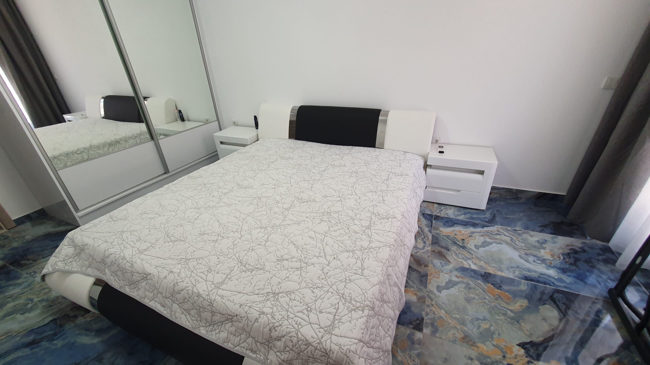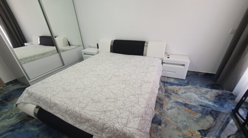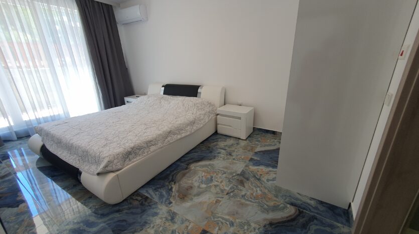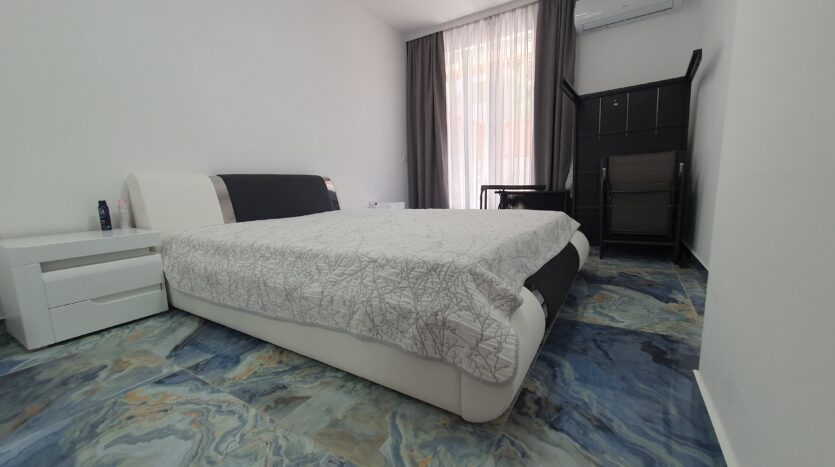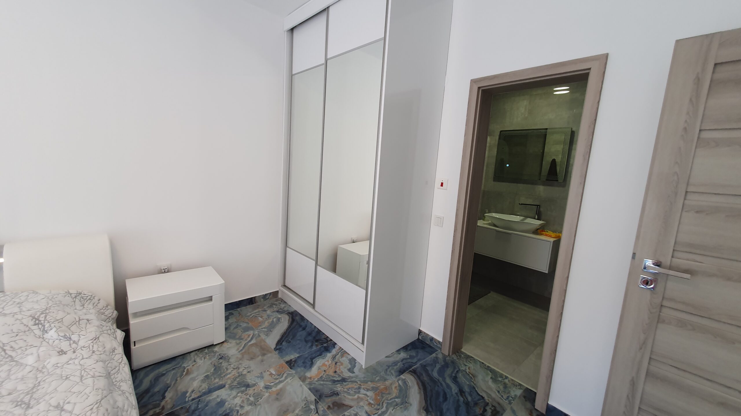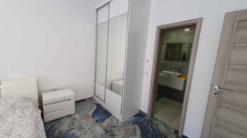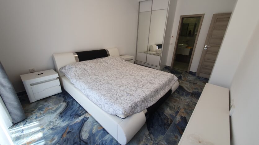 The main bedroom is beautifully furnished with a double bed, bedside tables and a wardrobe. There is an en-suite bathroom equipped with a bath tub, toilet, sink and a hot water boiler.
