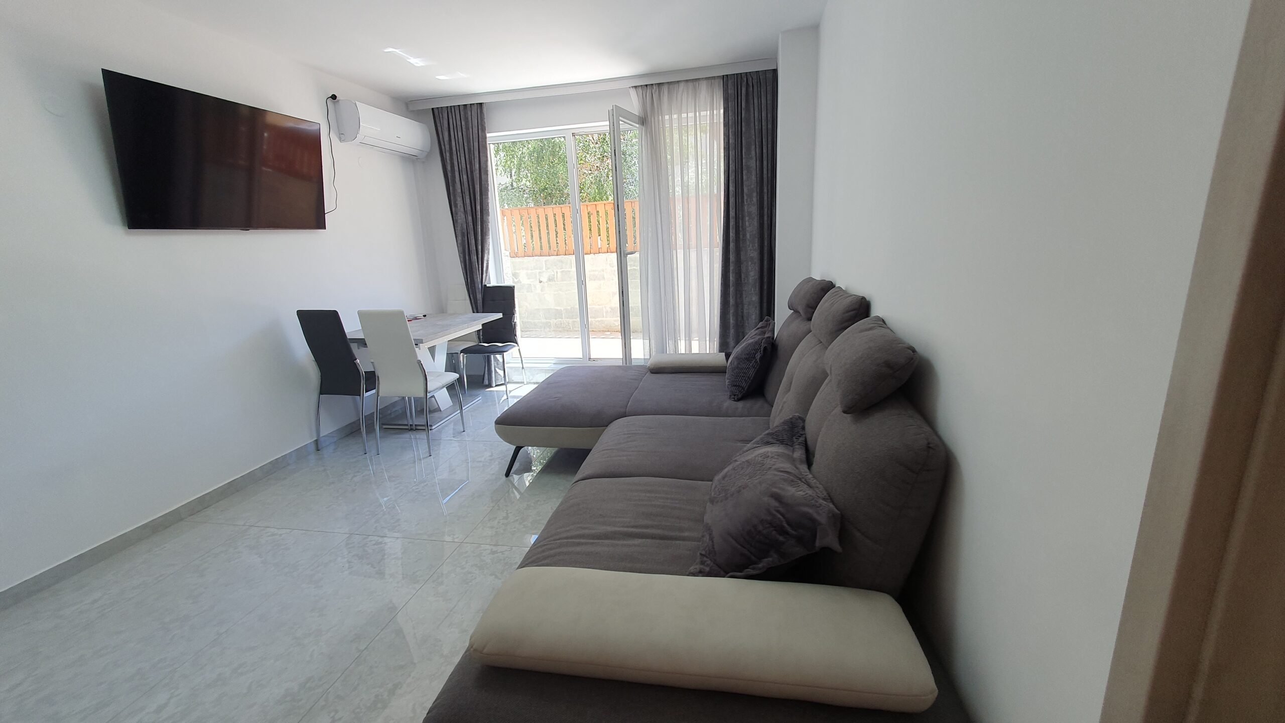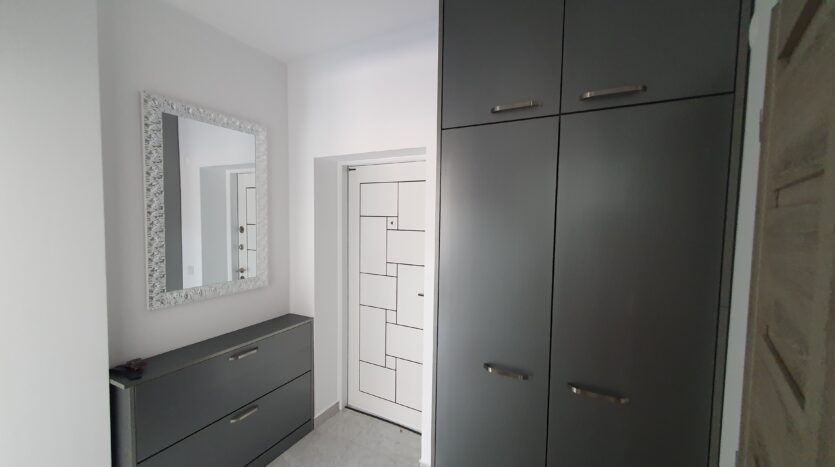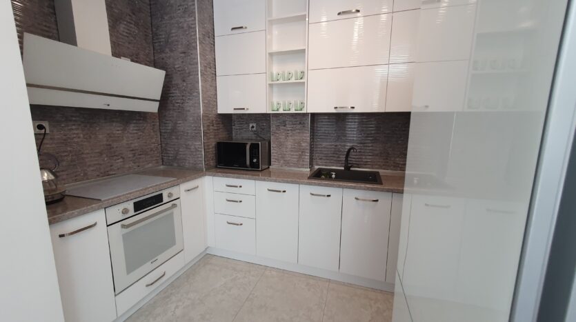 This high-end property consists of an entrance hallway with a wardrobe, a living/dining room with a modern kitchenette equipped with an oven, ceramic hob, extractor, full size refrigerator, a dining table with chairs, a cozy corner sofa and a wall-mounted TV.