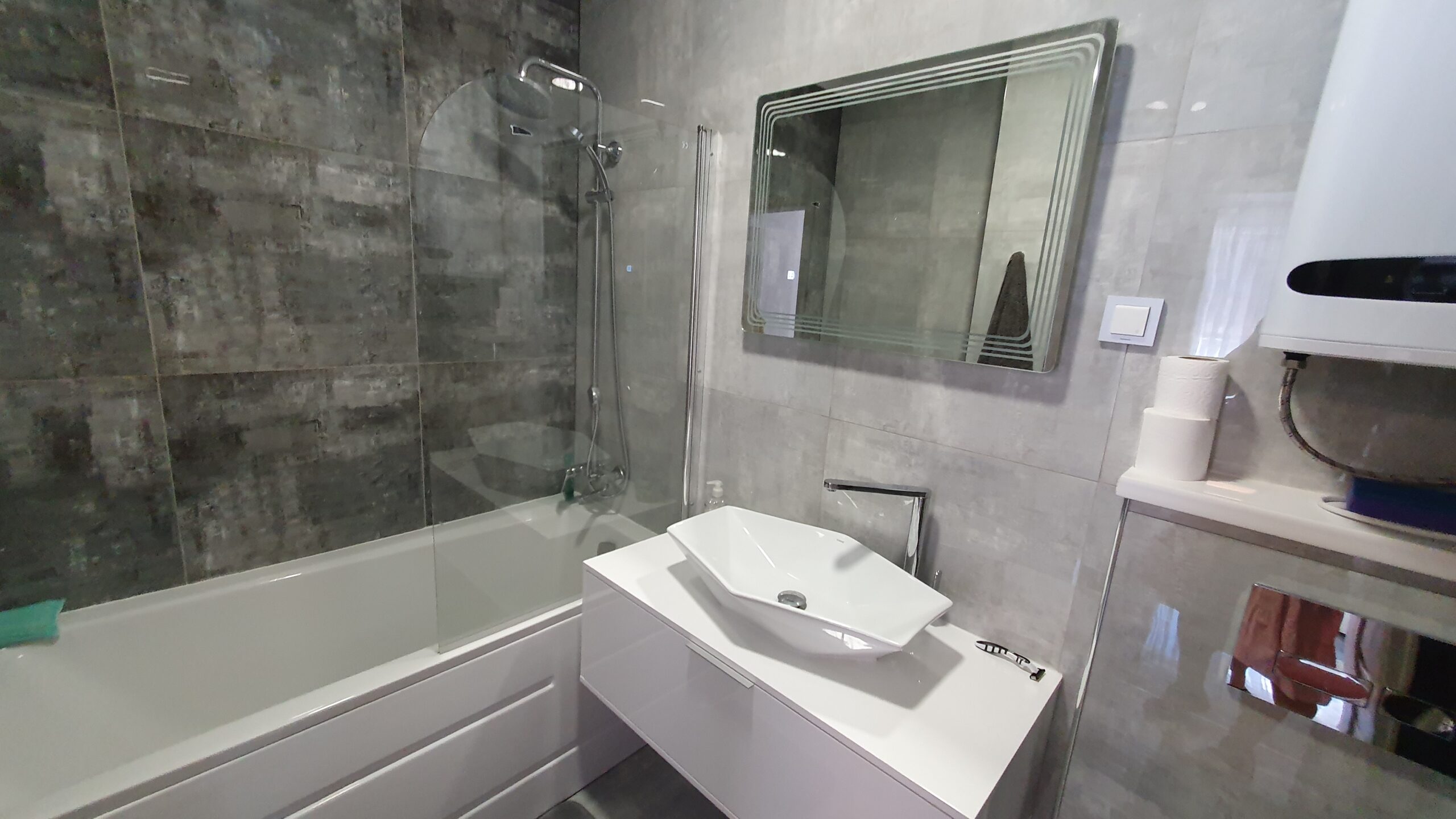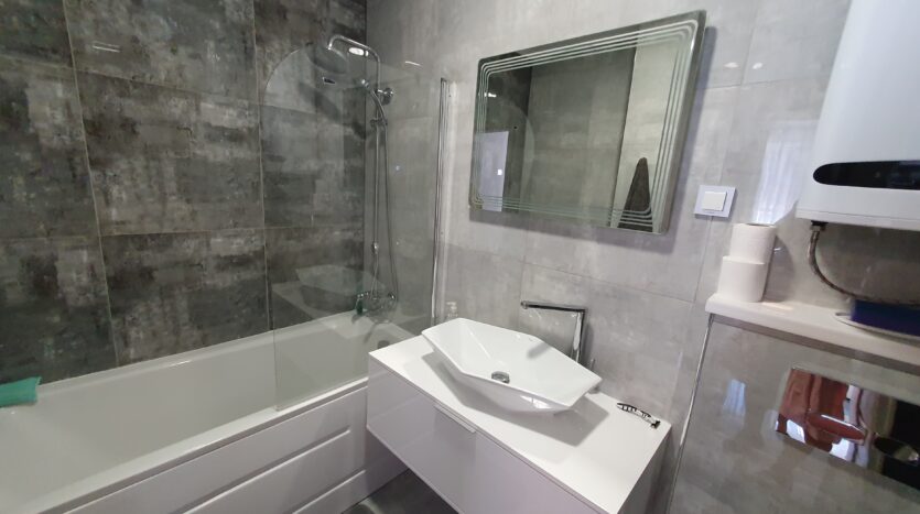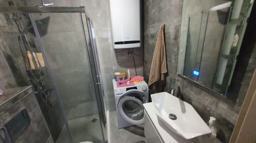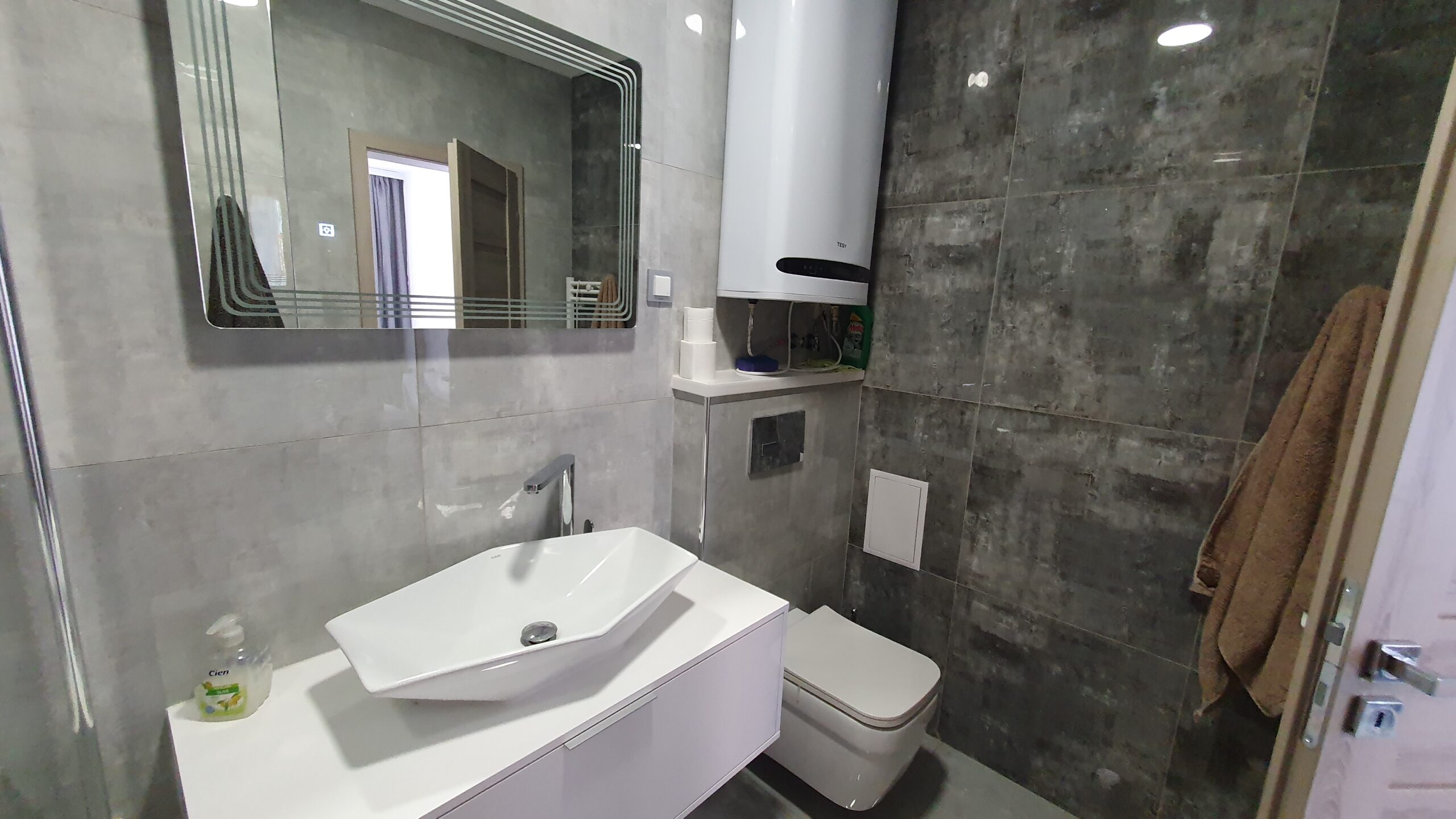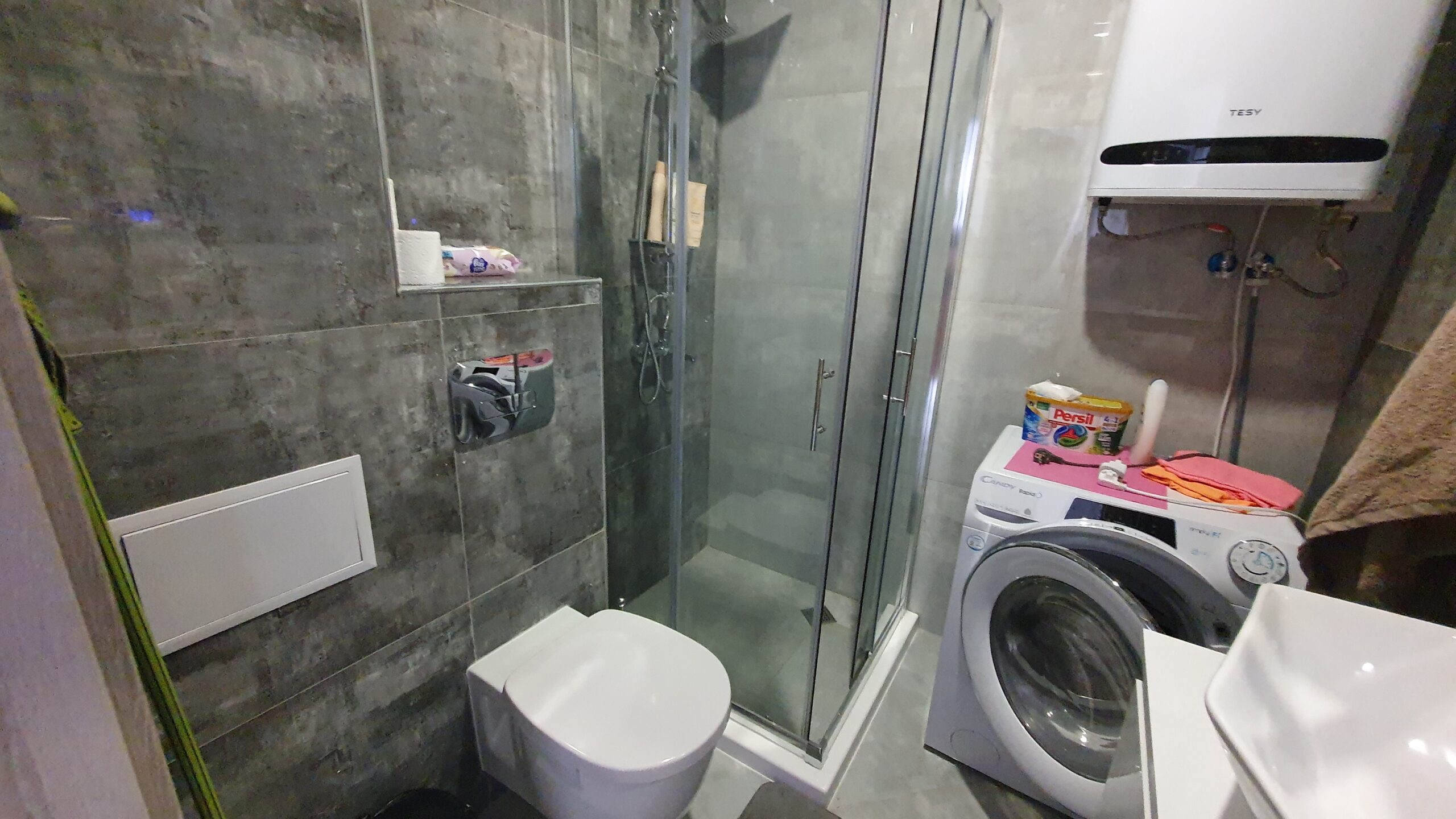 The second bathroom is equipped with a shower cabin, toilet, sink, washing machine and a hot water boiler.