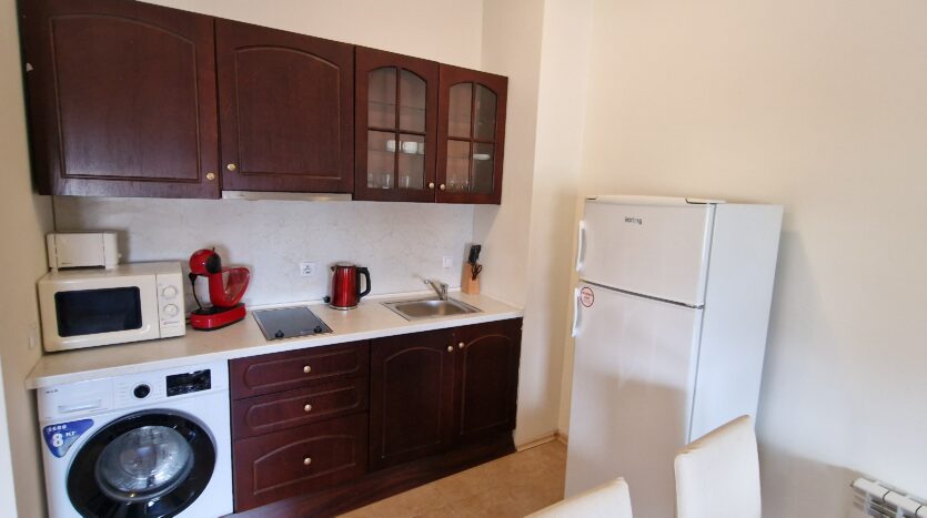 This property consists of a long entrance hallway with cloths hungers and niche with a wardrobe; There is a large , high ceilings, open plan living room, with a kitchen equipped with a ceramic hob, extractor, microwave and refrigerator, and also ready fittings for a washing machine. Matching dinning table with chairs. The living area is furnished with a brand new sofa and armchair, coffee table and a new Smart TV . Currently is a SIM internet router, building has fiber option cable from A1.