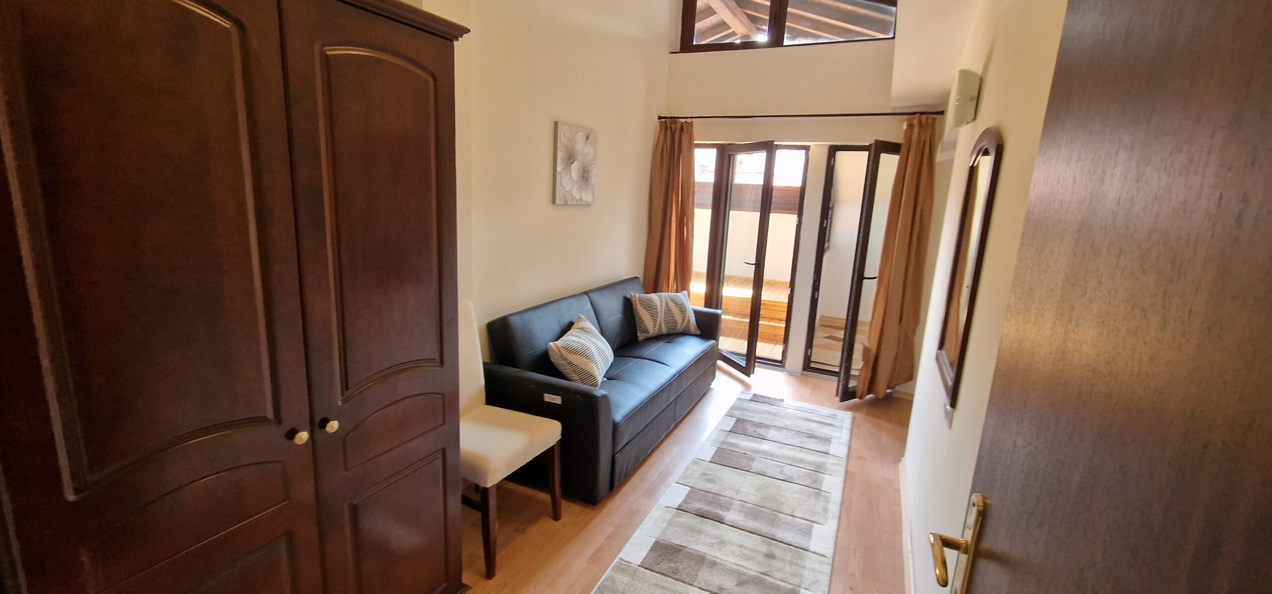 Third room, next to balcony, with a single bed and working desk; Two rooms have direct access to a spacious balcony, with newly iunstalled wooded decking, blacony with magnificent mountain views .
