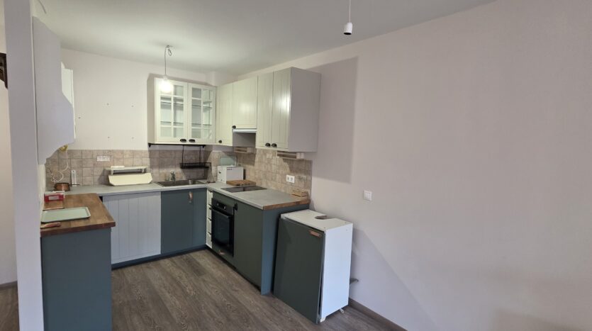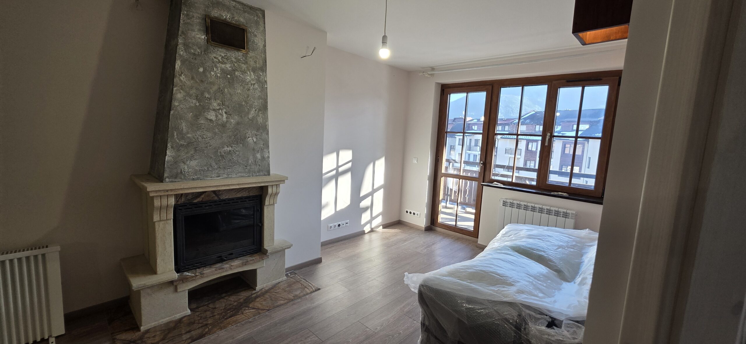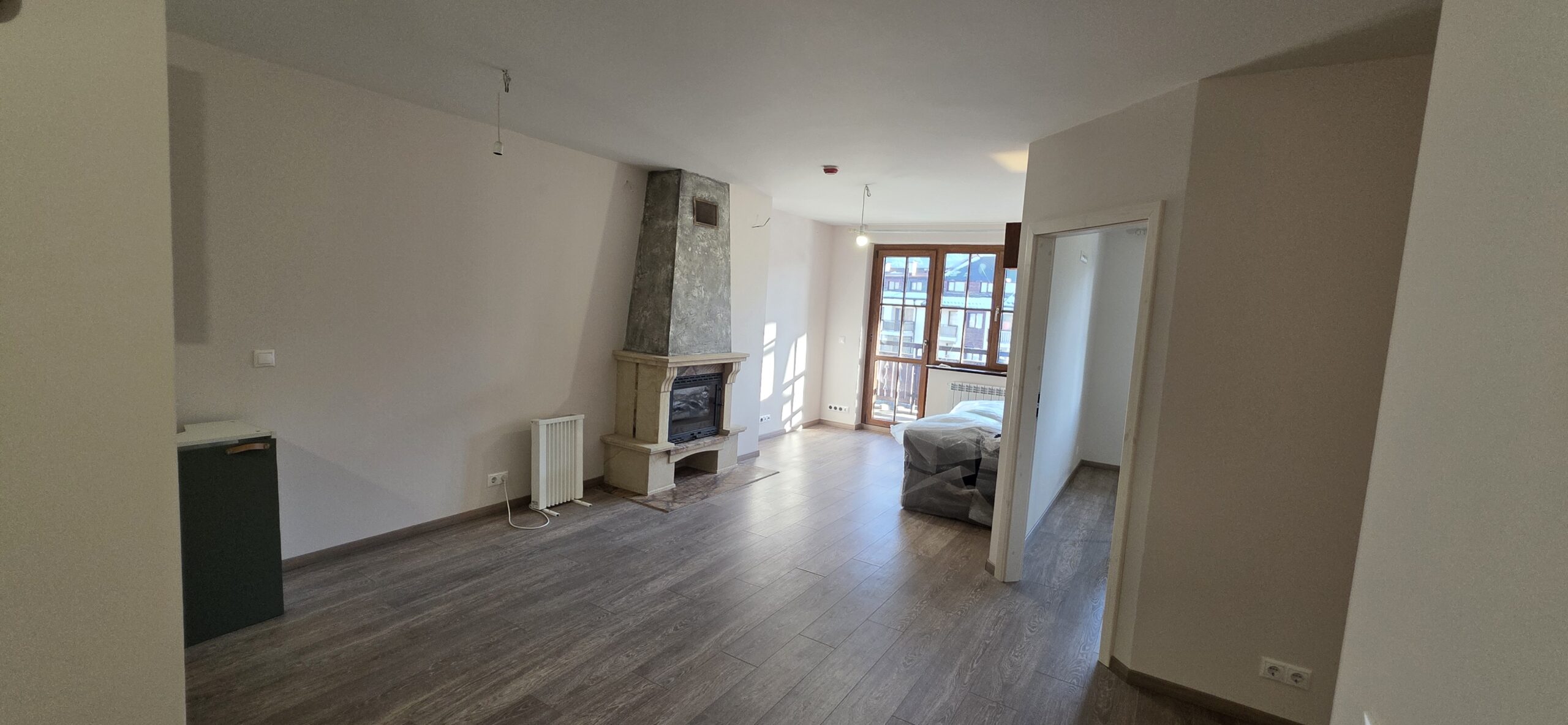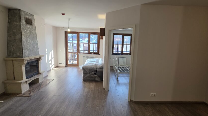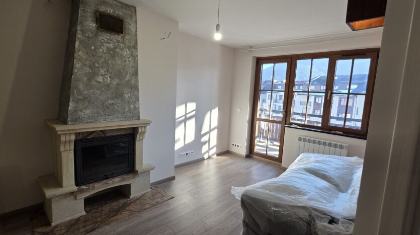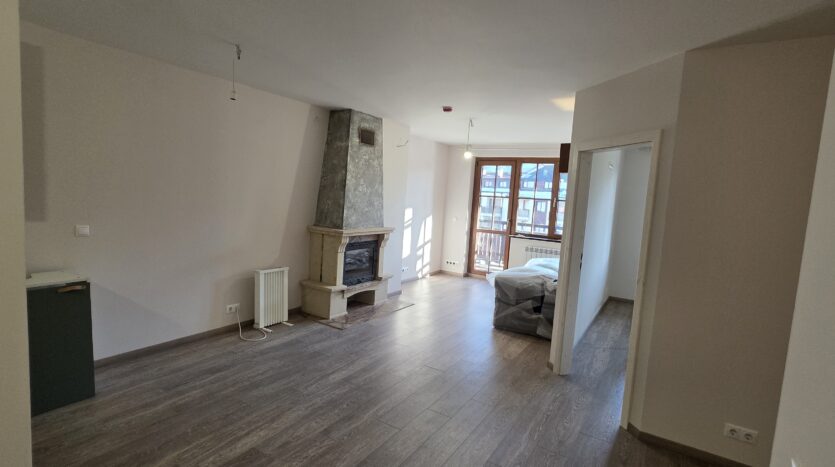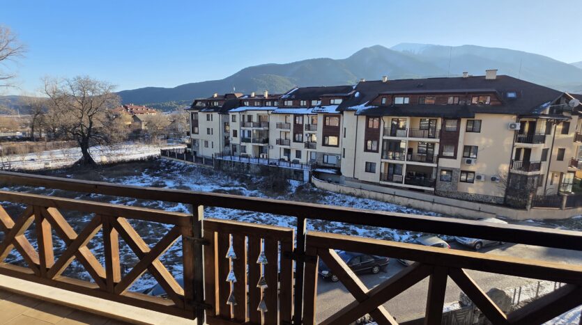 The apartment consists of an entrance hallway, living/dining room with solid wood kitchenette equipped with an oven, ceramic hob, extractor and refrigerator, a dining area in a niche and a bright sitting area with a comfortable sofa and a log fireplace. There is an access to a spacious balcony with an amazing panoramic view of Pirin mountains. The bedroom is furnished with a double bed. The bathroom is luxury equipped with a shower, sink and a toilet.