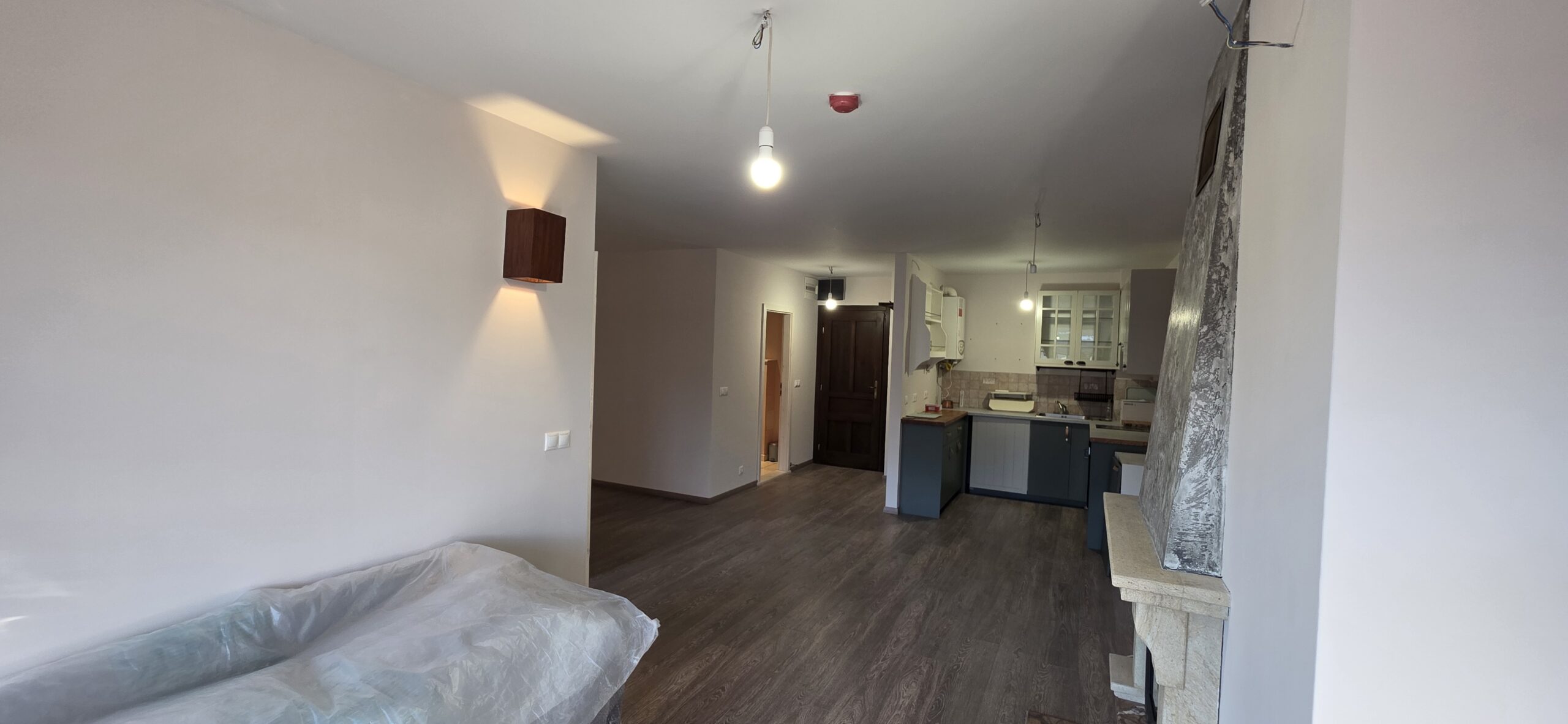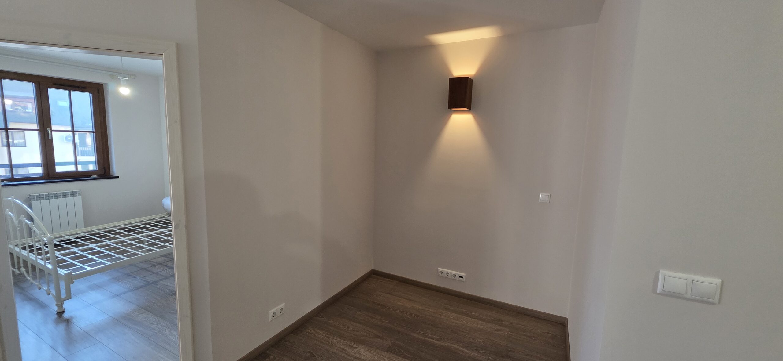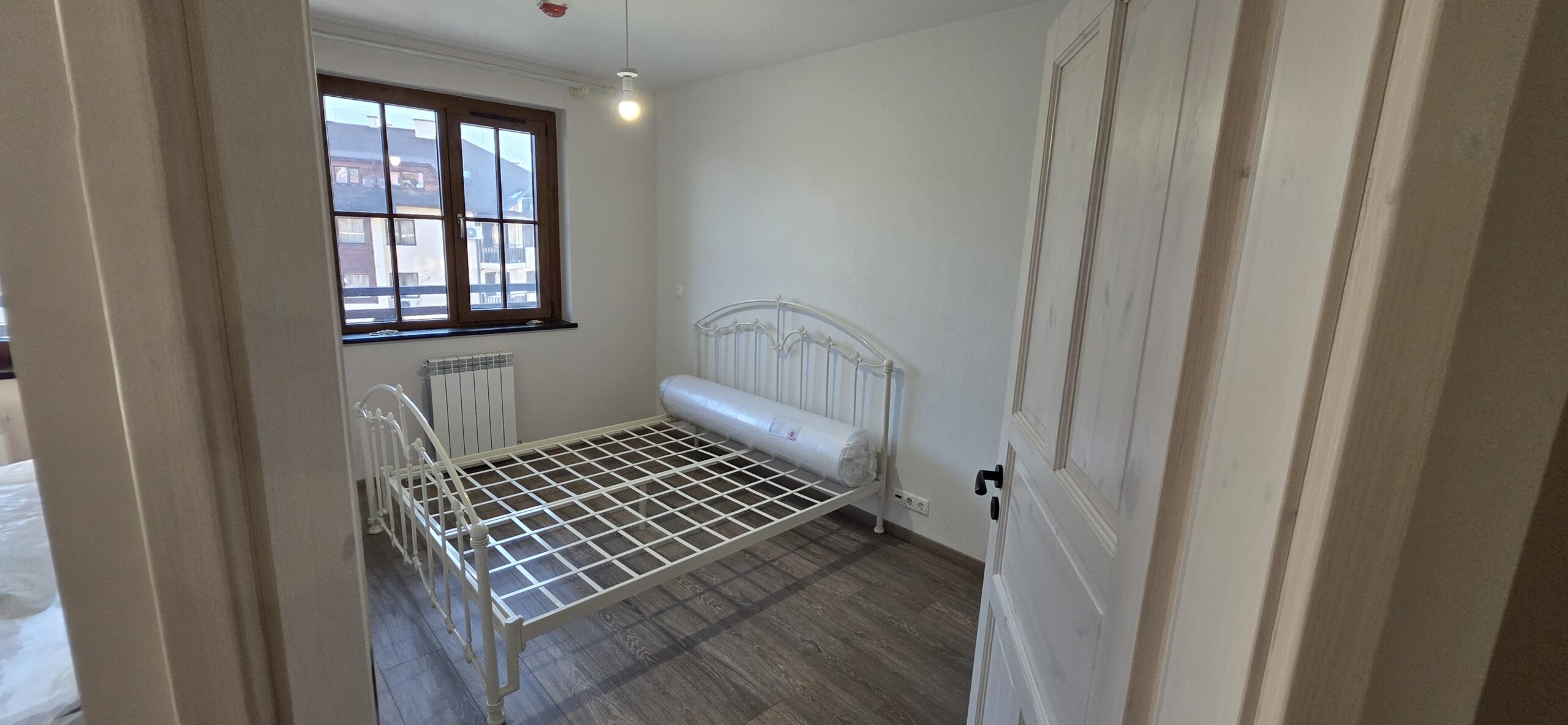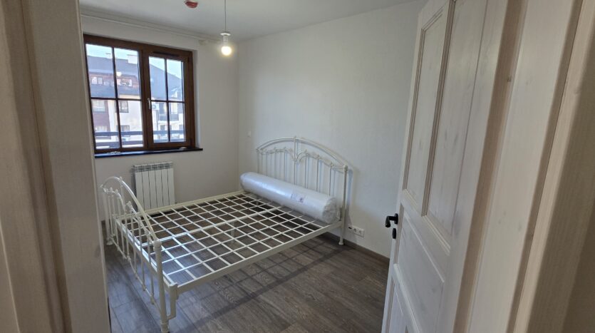 The apartment consists of an entrance hallway, living/dining room with solid wood kitchenette equipped with an oven, ceramic hob, extractor and refrigerator, a dining area in a niche and a bright sitting area with a comfortable sofa and a log fireplace. There is an access to a spacious balcony with an amazing panoramic view of Pirin mountains. The bedroom is furnished with a double bed. The bathroom is luxury equipped with a shower, sink and a toilet.