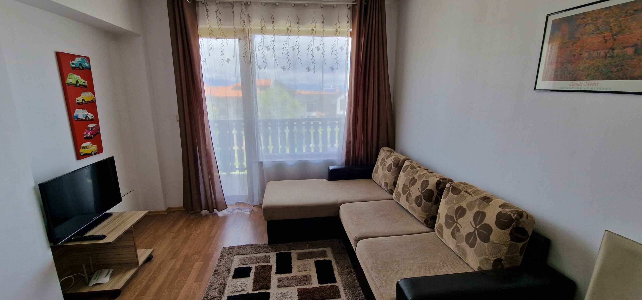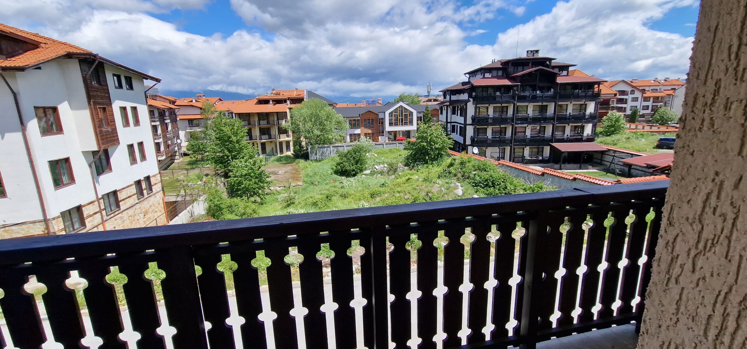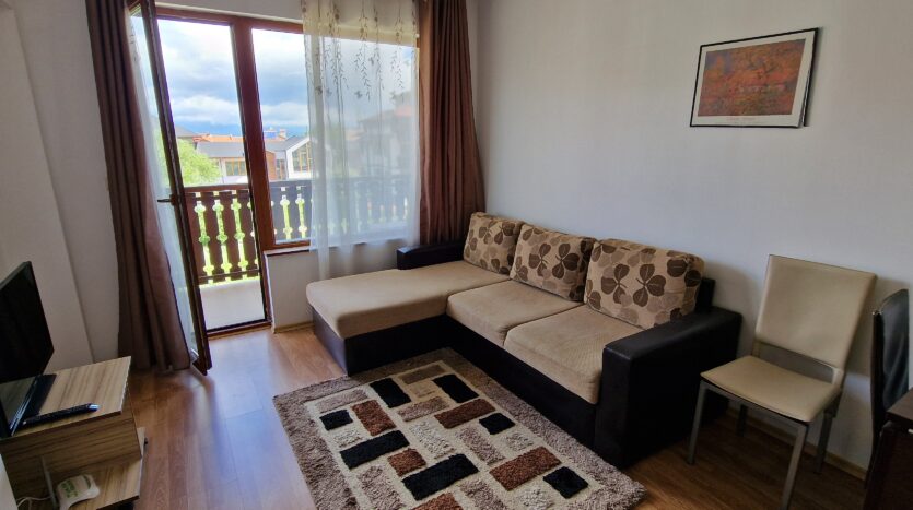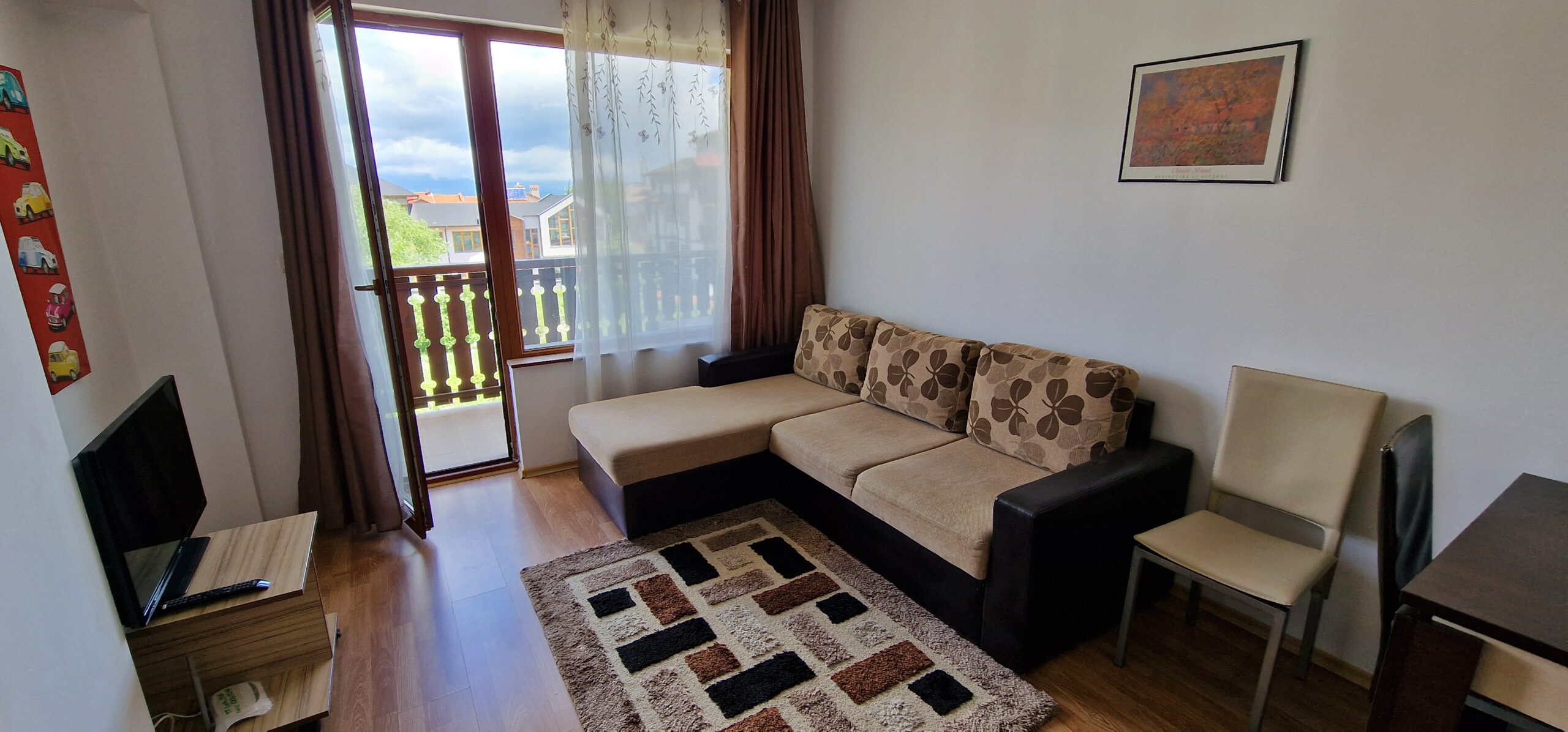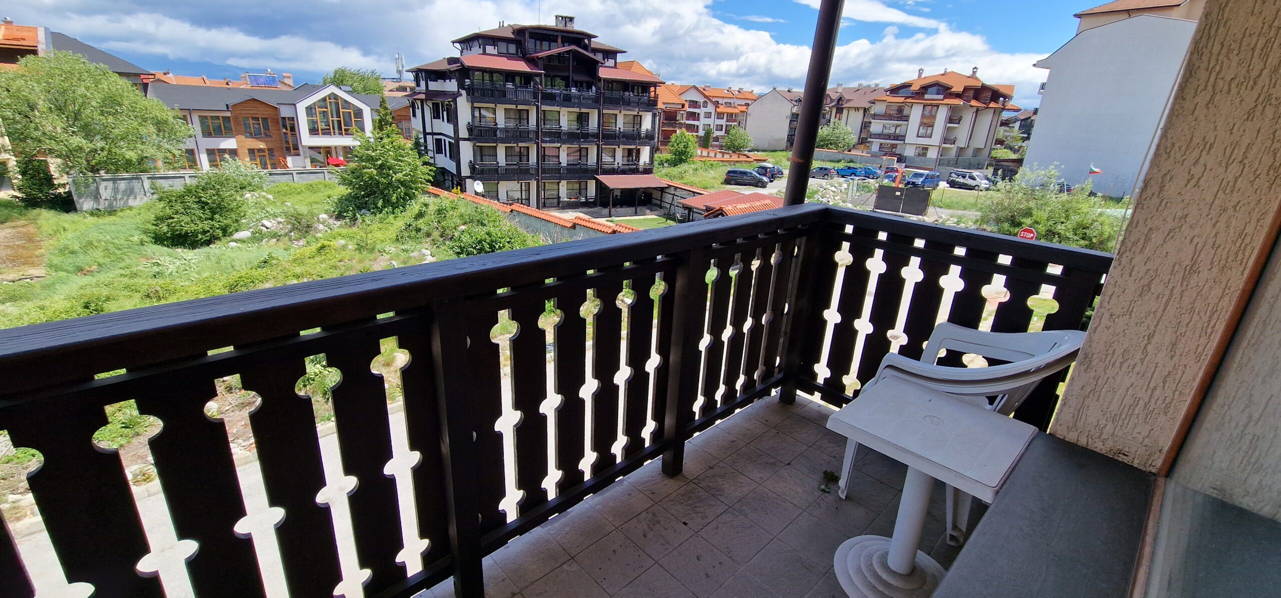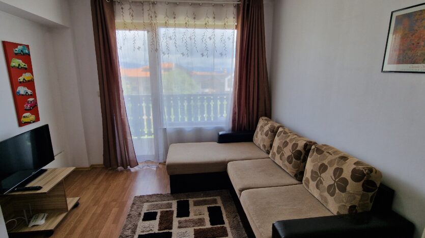 The apartment consists of a good sized hallway, an open plan living/dining room with a kitchenette equipped with an oven, ceramic hob, extractor and refrigerator, a dining table with chairs, a comfortable corner sofa bed with a coffee table and a TV unit with TV. The spacious bedroom is beautifully furnished with a double bed, bedside tables and a big wardrobe.Both rooms have access to a balcony with beautiful views of the Rila Mountain.
