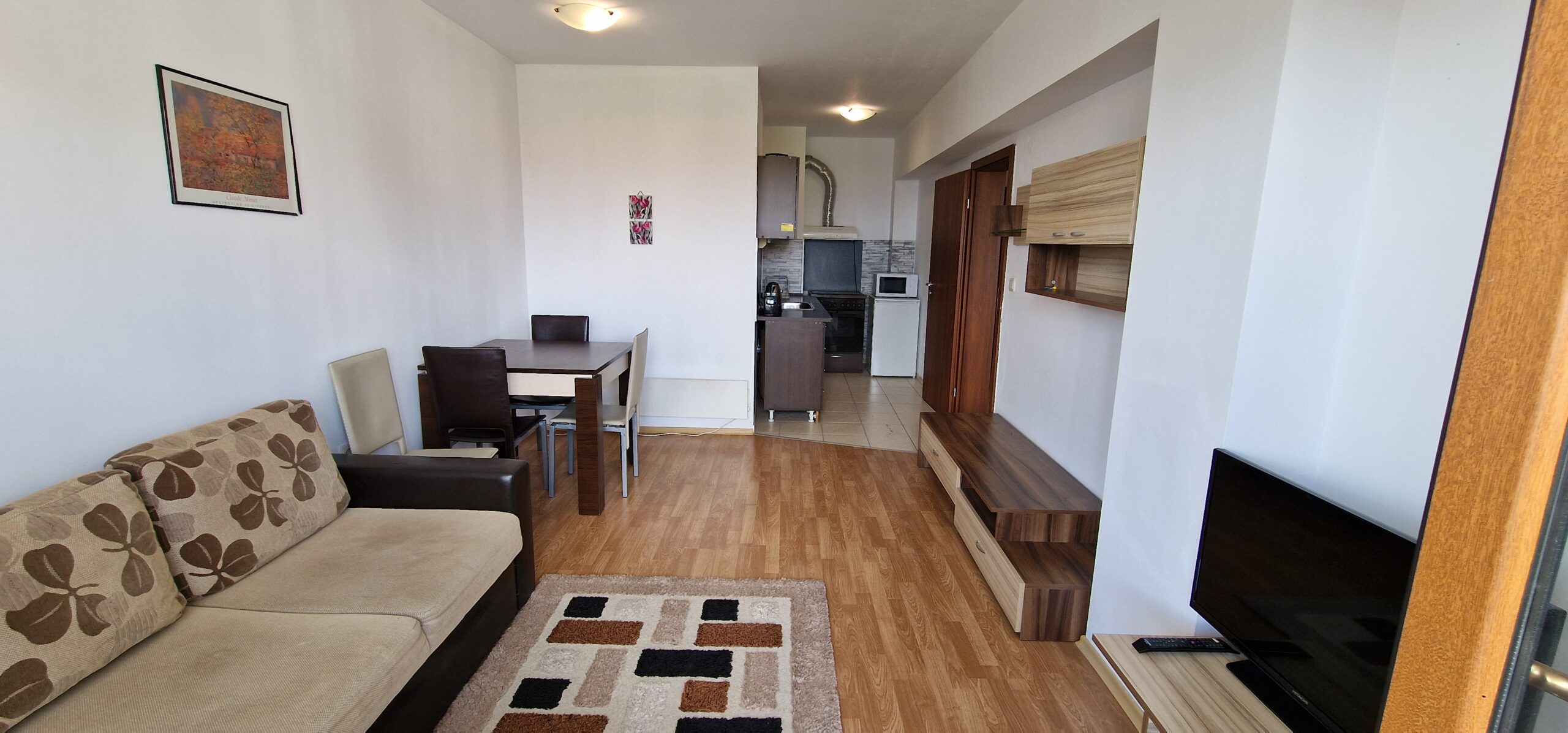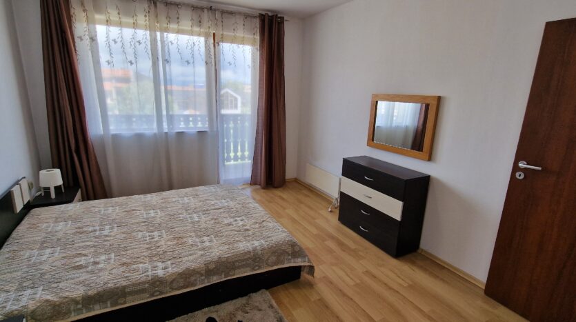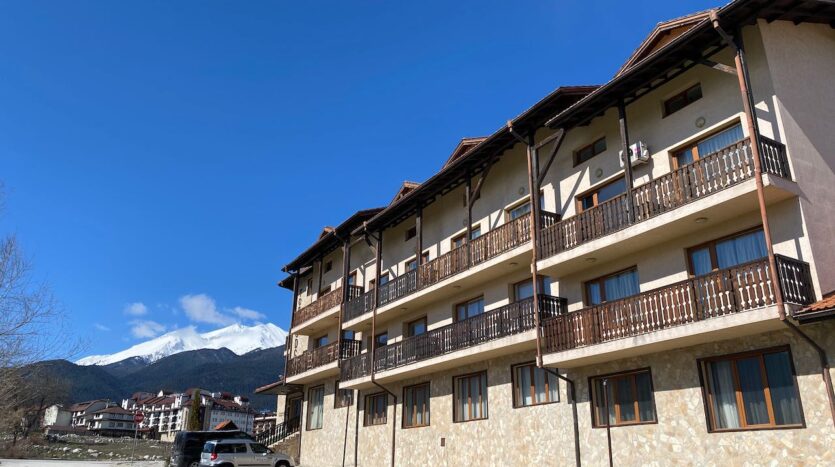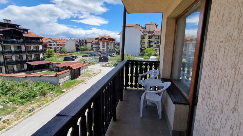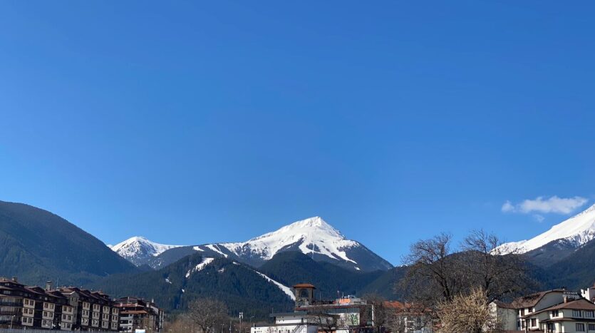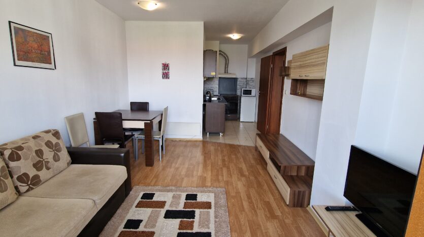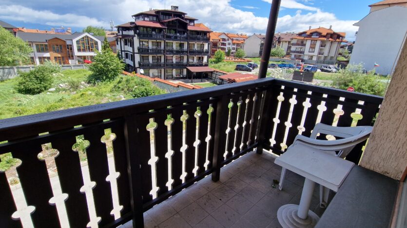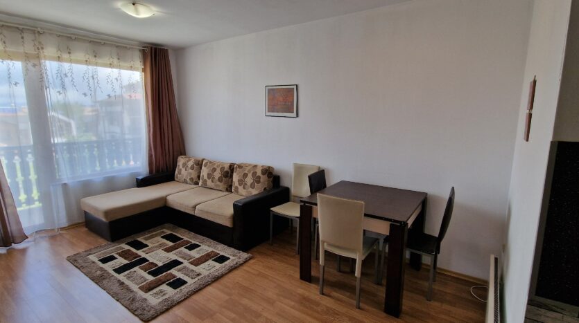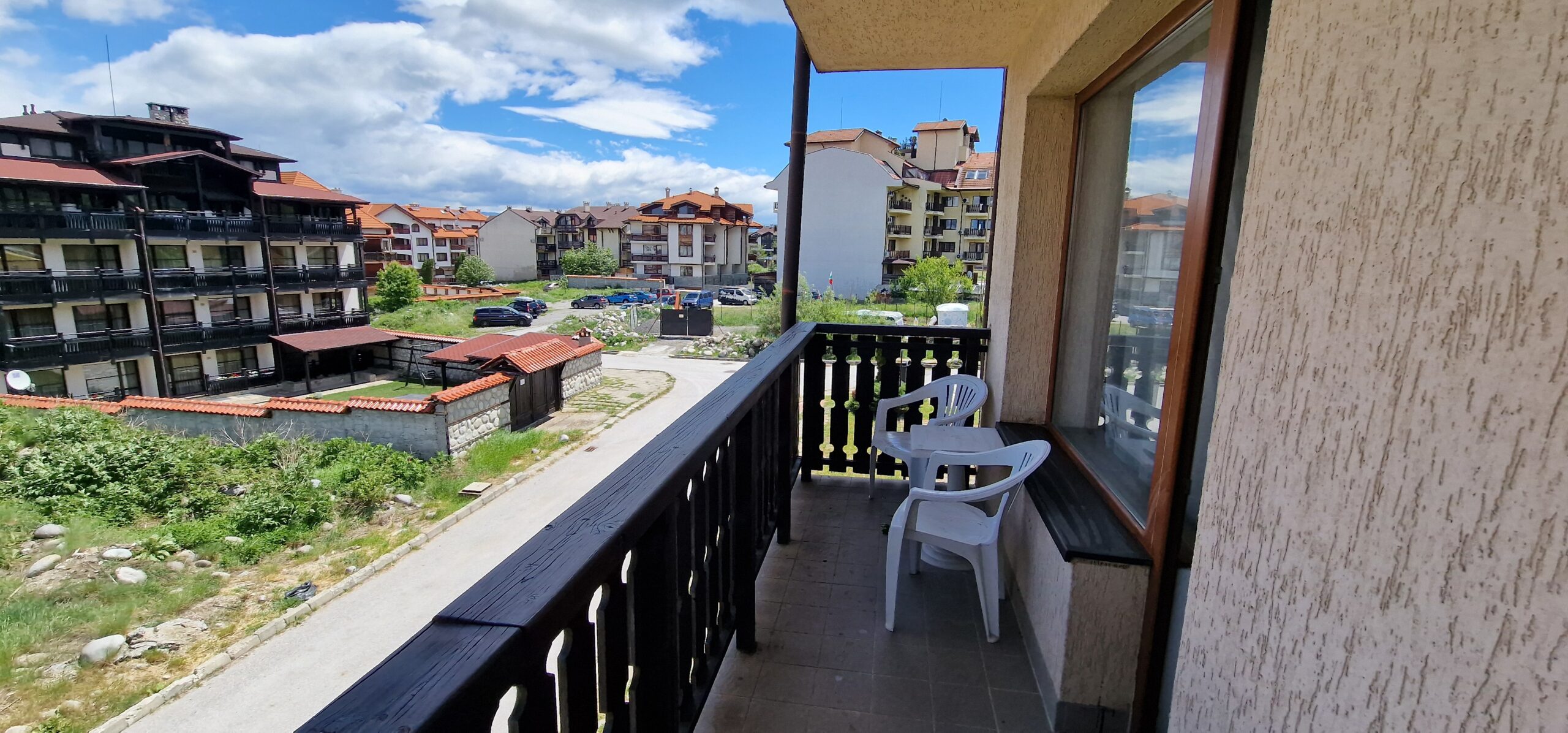 The apartment consists of a good sized hallway, an open plan living/dining room with a kitchenette equipped with an oven, ceramic hob, extractor and refrigerator, a dining table with chairs, a comfortable corner sofa bed with a coffee table and a TV unit with TV. The spacious bedroom is beautifully furnished with a double bed, bedside tables and a big wardrobe.Both rooms have access to a balcony with beautiful views of the Rila Mountain.