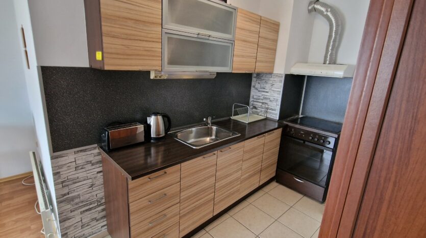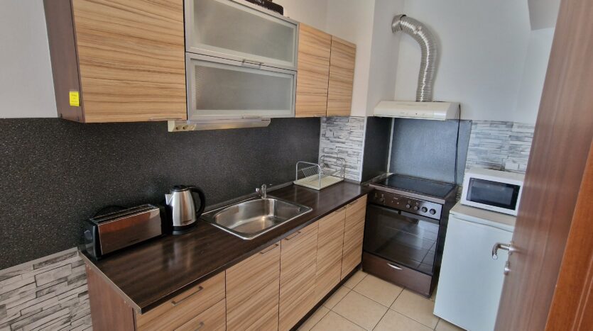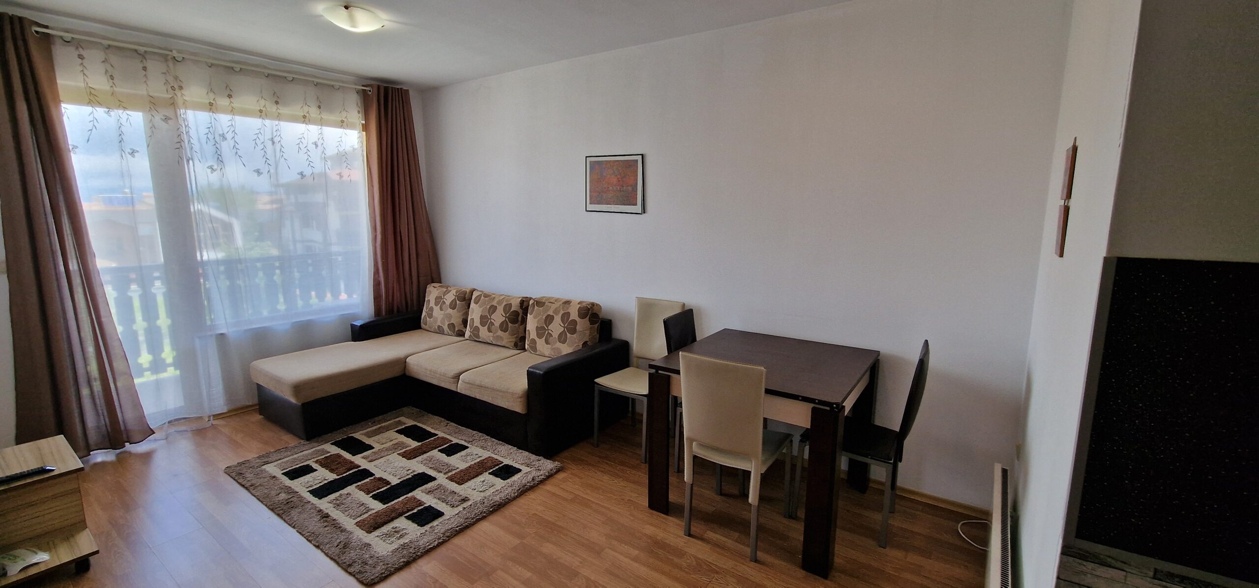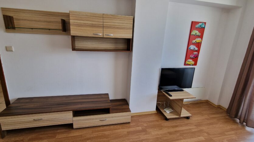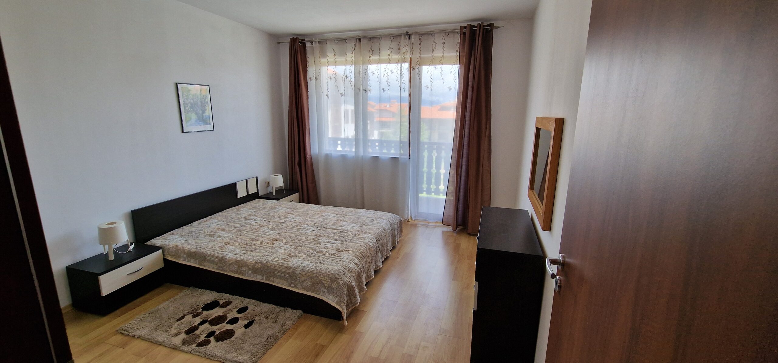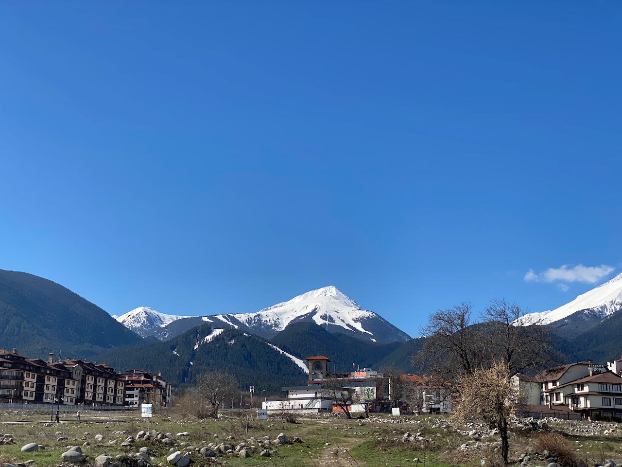 The apartment consists of a good sized hallway, an open plan living/dining room with a kitchenette equipped with an oven, ceramic hob, extractor and refrigerator, a dining table with chairs, a comfortable corner sofa bed with a coffee table and a TV unit with TV. The spacious bedroom is beautifully furnished with a double bed, bedside tables and a big wardrobe.Both rooms have access to a balcony with beautiful views of the Rila Mountain.