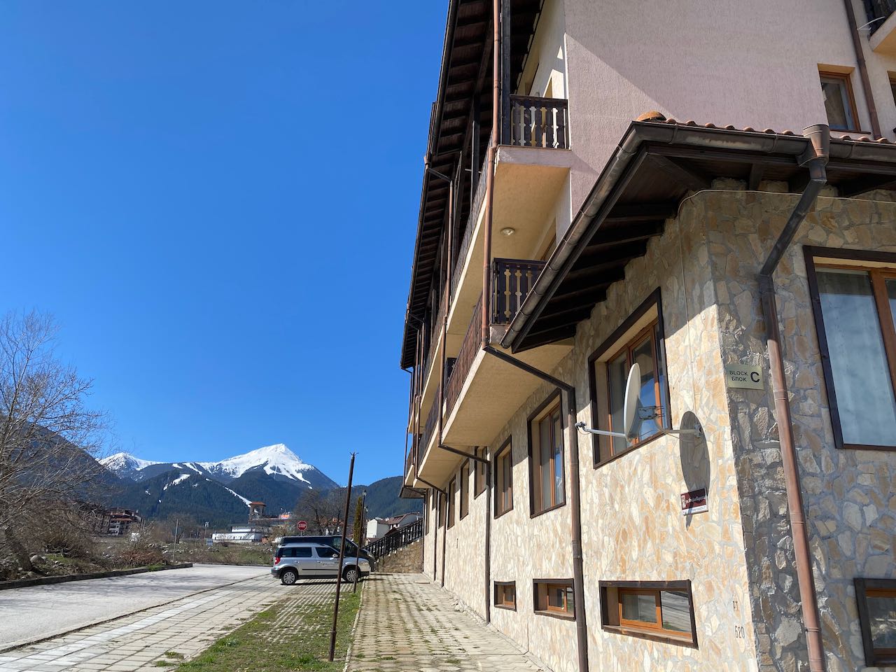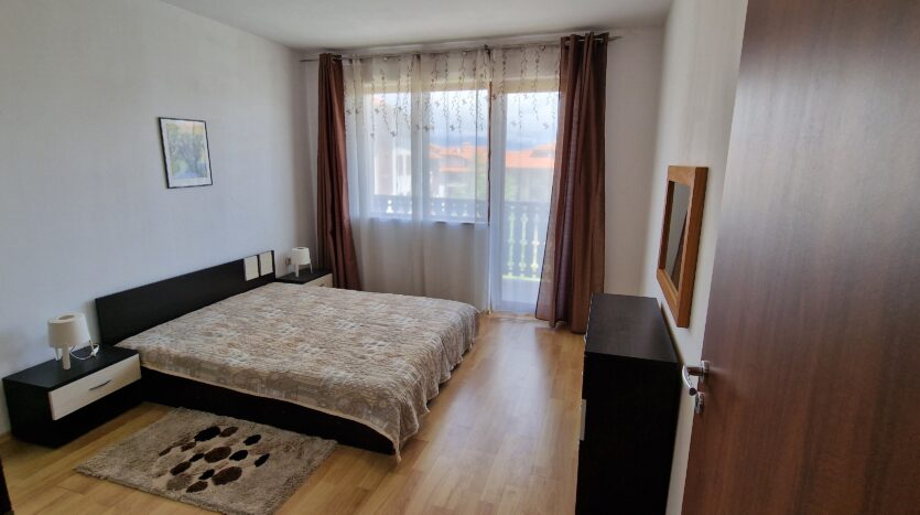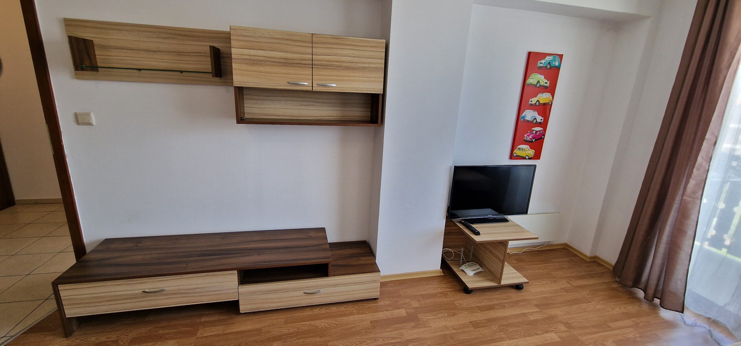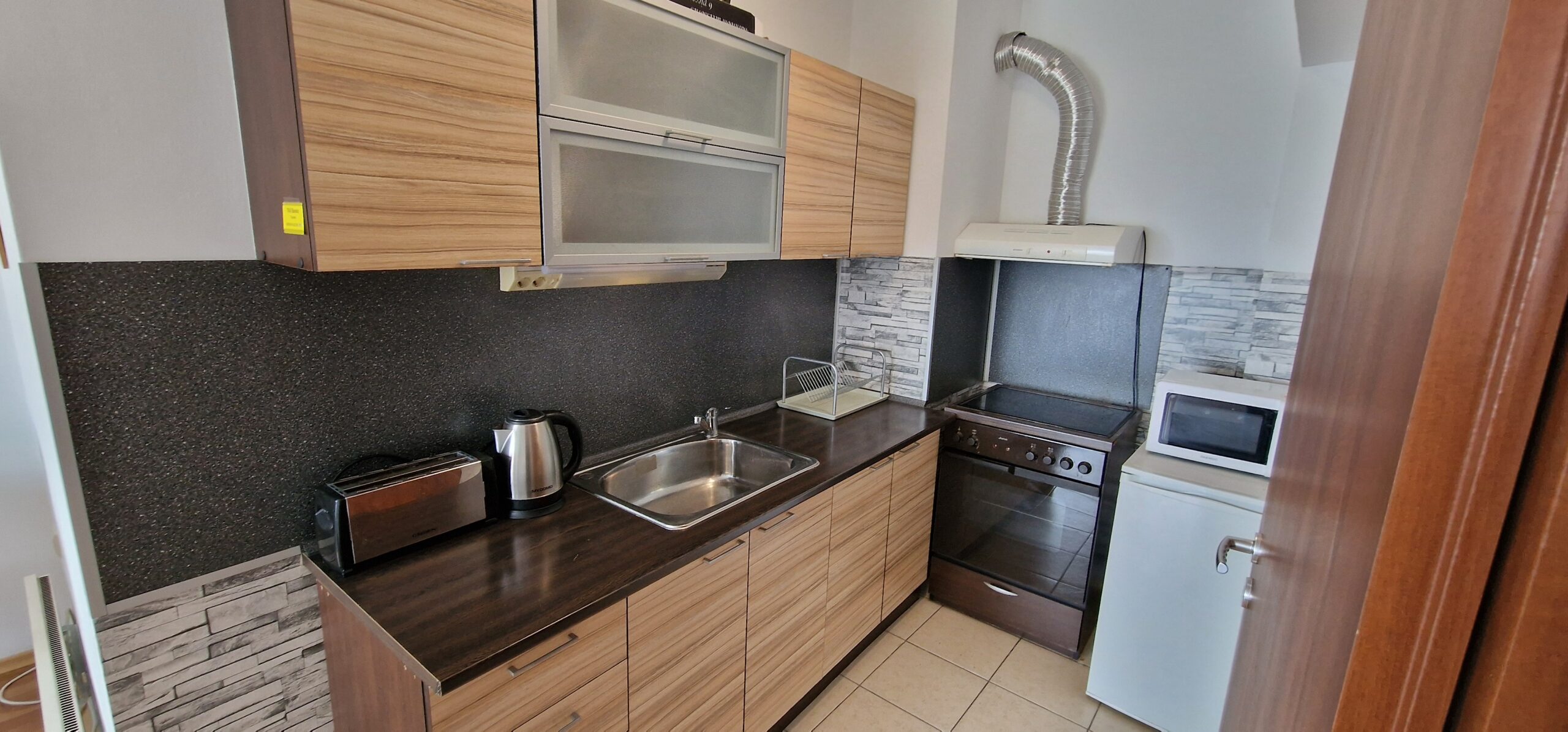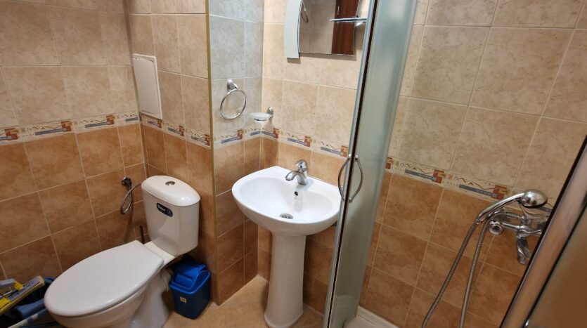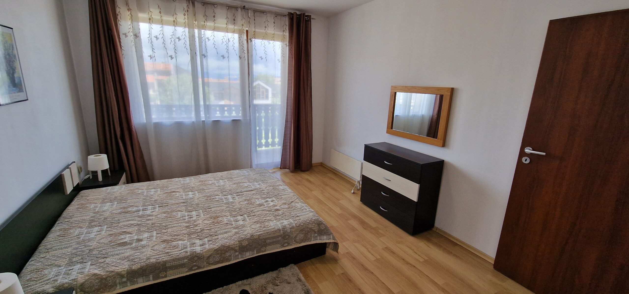 The apartment consists of a good sized hallway, an open plan living/dining room with a kitchenette equipped with an oven, ceramic hob, extractor and refrigerator, a dining table with chairs, a comfortable corner sofa bed with a coffee table and a TV unit with TV. The spacious bedroom is beautifully furnished with a double bed, bedside tables and a big wardrobe.Both rooms have access to a balcony with beautiful views of the Rila Mountain.