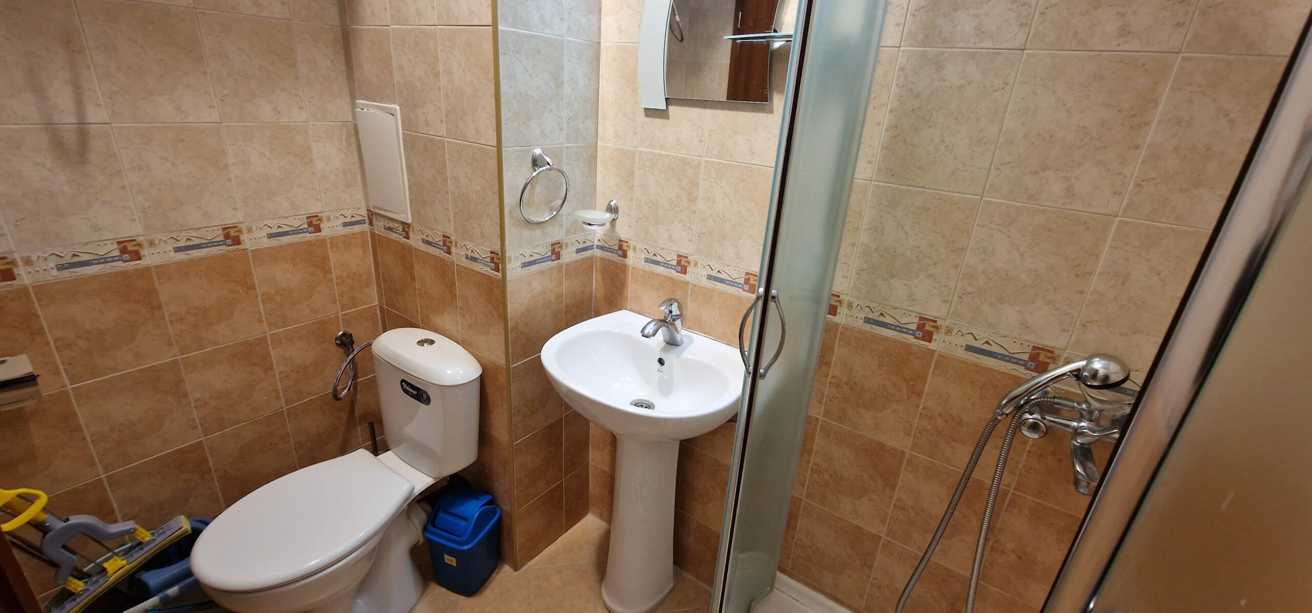 The bathroom is equipped with a sink, toilet, a shower cabin and a hot water boiler.