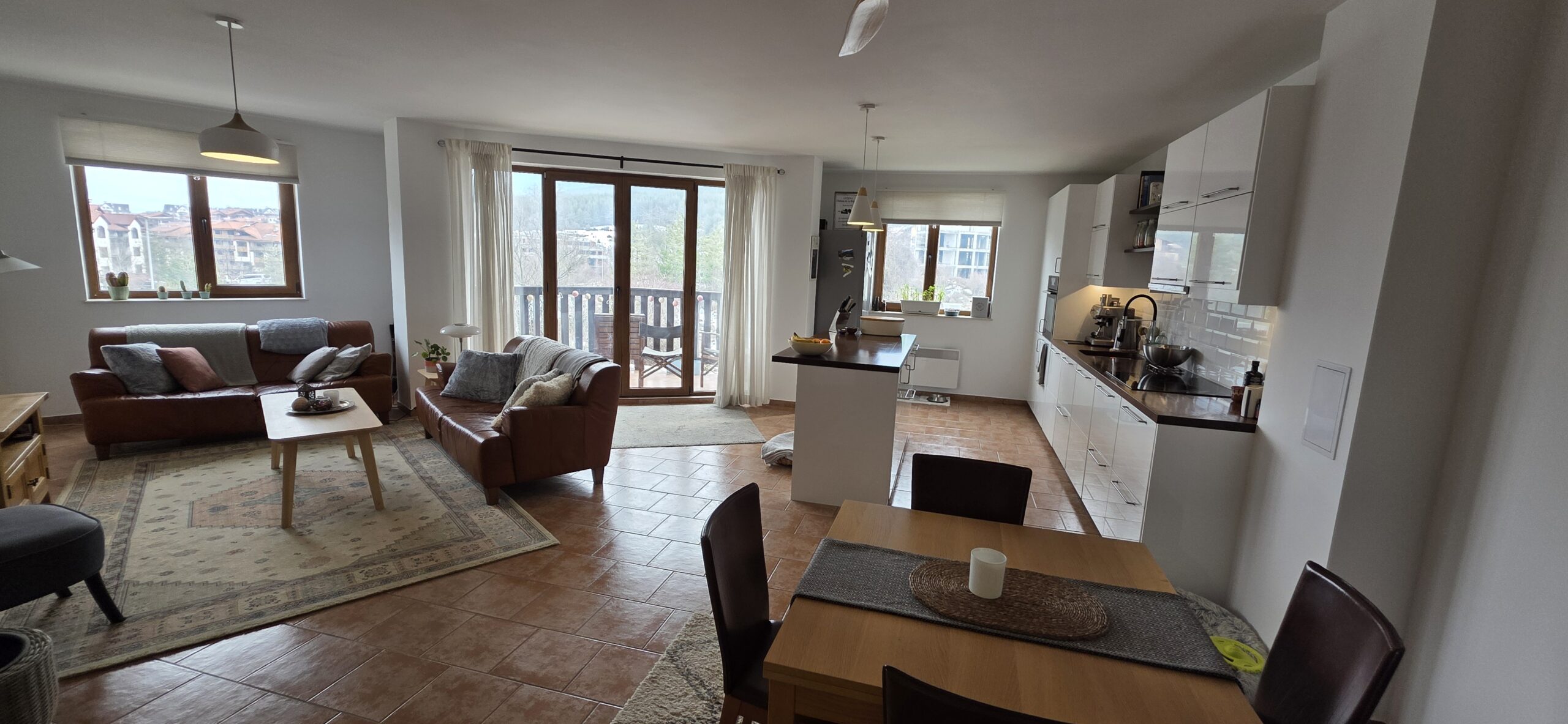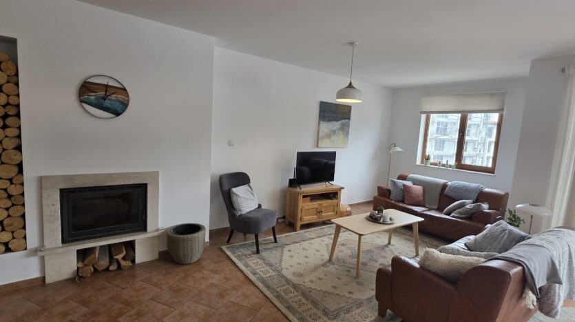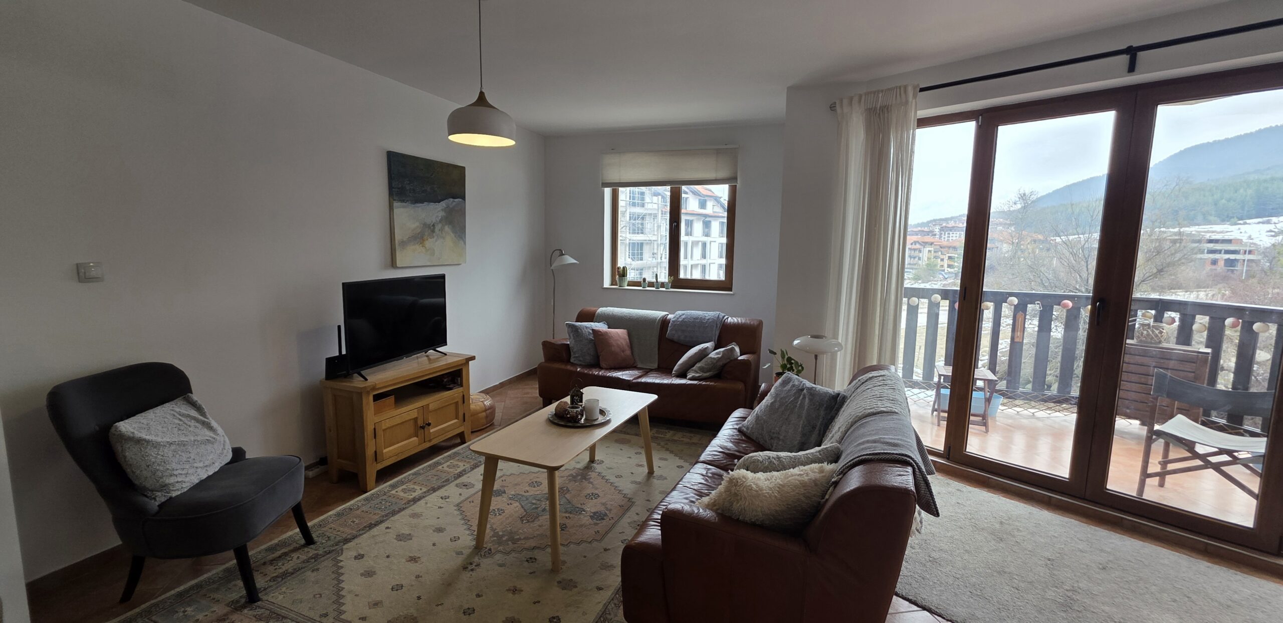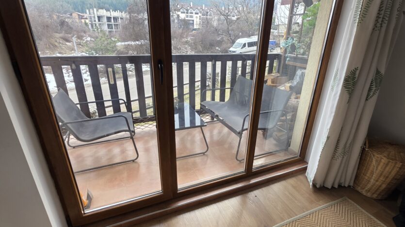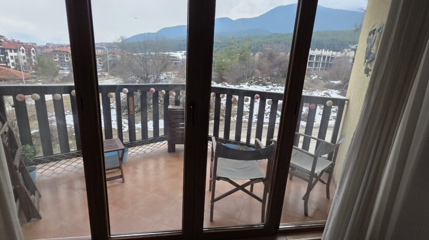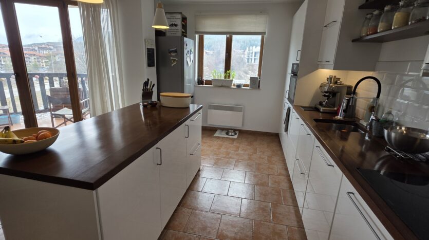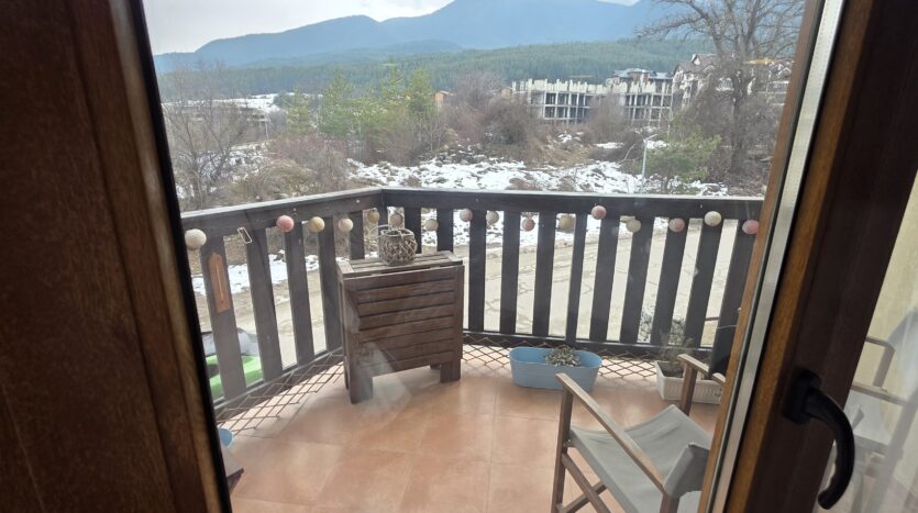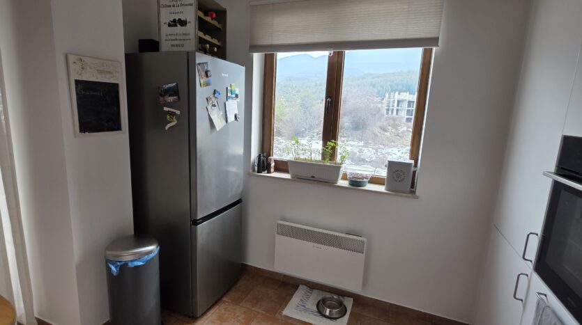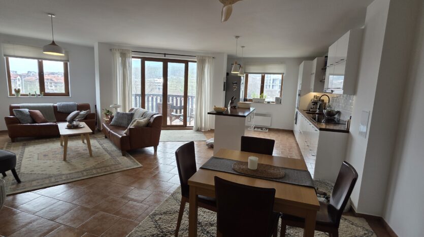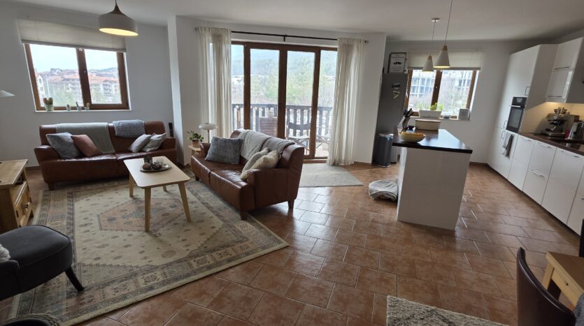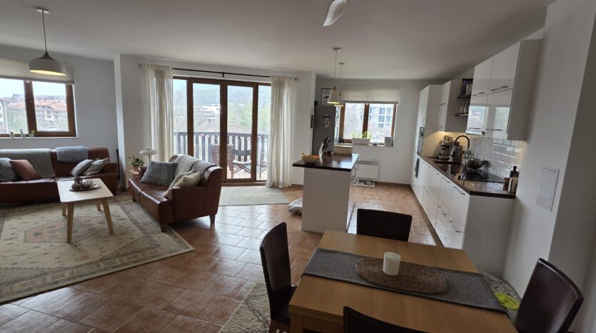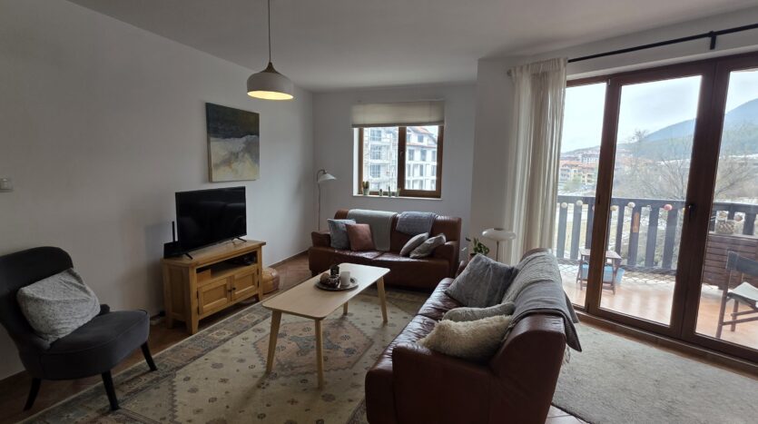 This high-end property consists of an entrance hallway, which leads to a very spacious living/dining room with a modern fully equipped custom-made kitchen, with quality appliances: an oven, ceramic hob, extractor, microwave, dishwasher, washing machine and a full size refrigerator. The lounge area has a log fireplace and is cozy furnished with two leather sofas with a coffee table and TV. There is access to a South-facing balcony with beautiful views of Pirin mountains.
