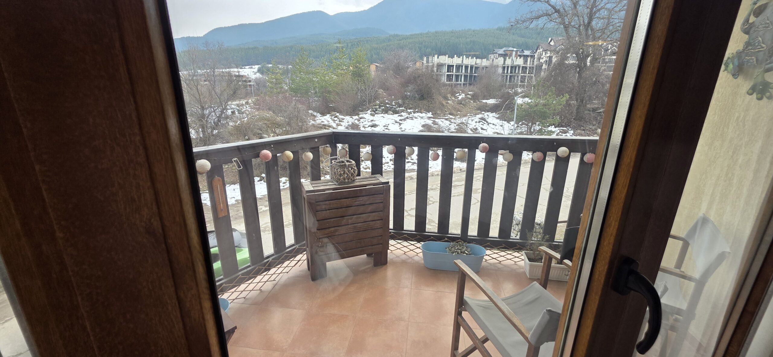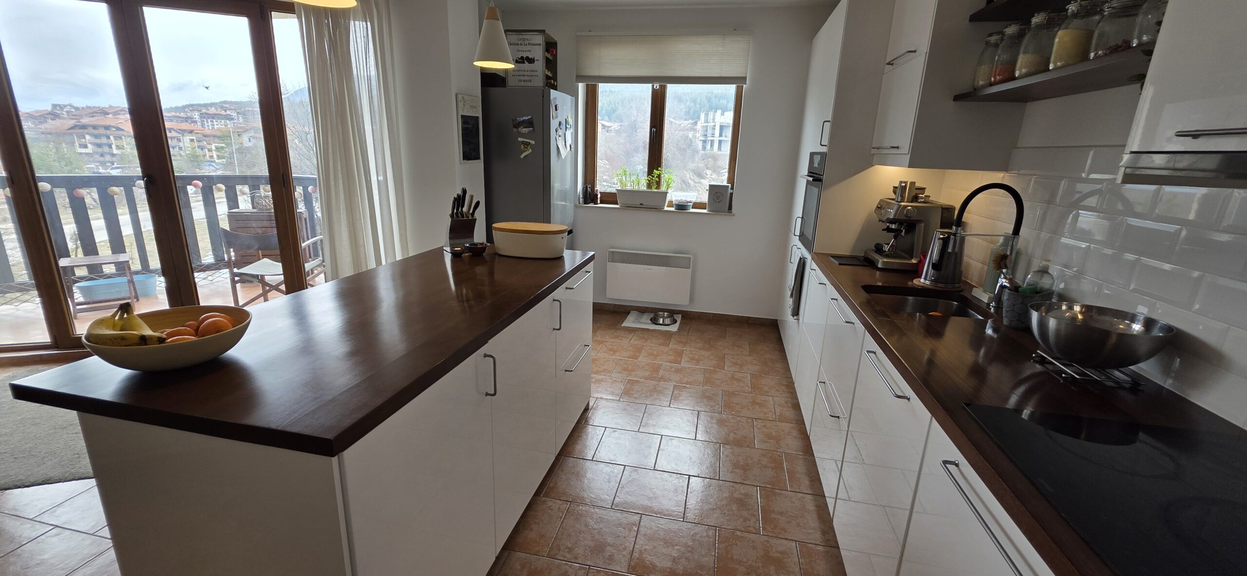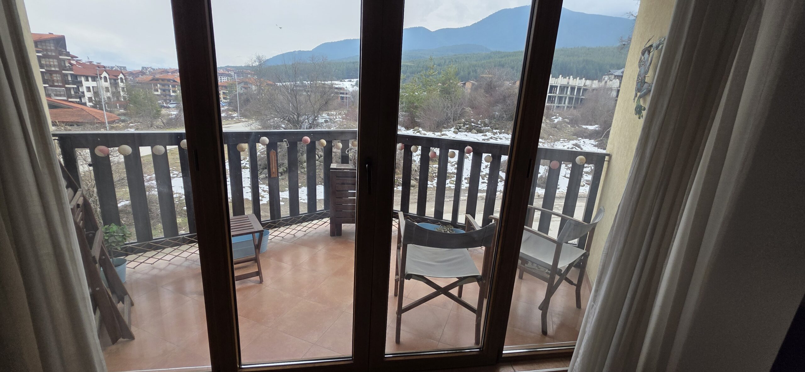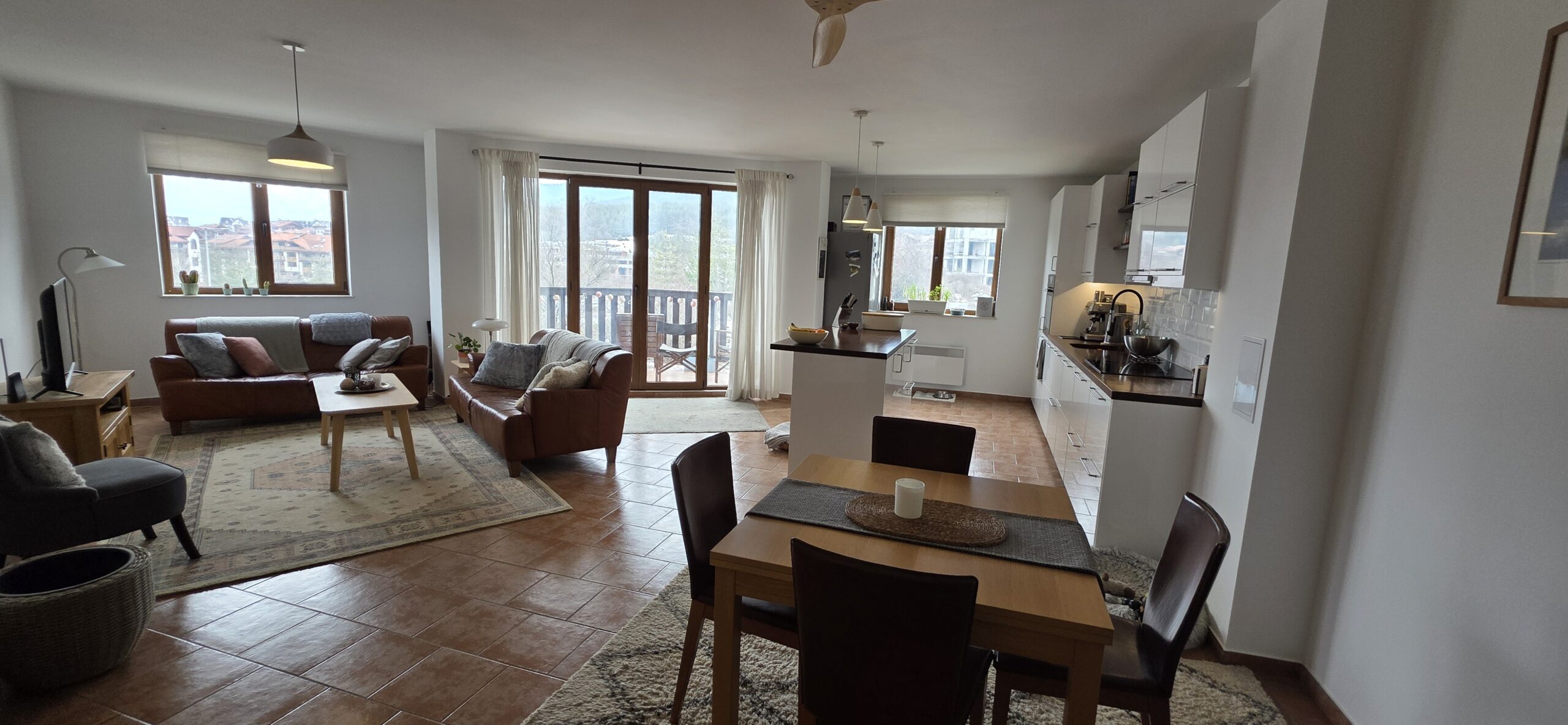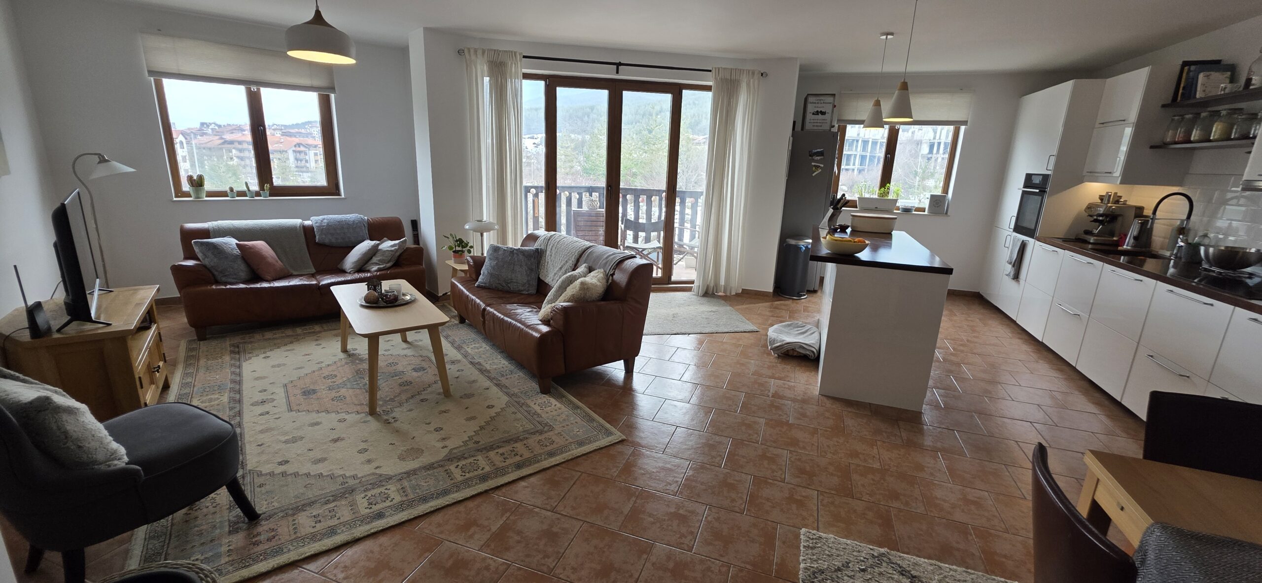 This high-end property consists of an entrance hallway, which leads to a very spacious living/dining room with a modern fully equipped custom-made kitchen, with quality appliances: an oven, ceramic hob, extractor, microwave, dishwasher, washing machine and a full size refrigerator. The lounge area has a log fireplace and is cozy furnished with two leather sofas with a coffee table and TV. There is access to a South-facing balcony with beautiful views of Pirin mountains.
