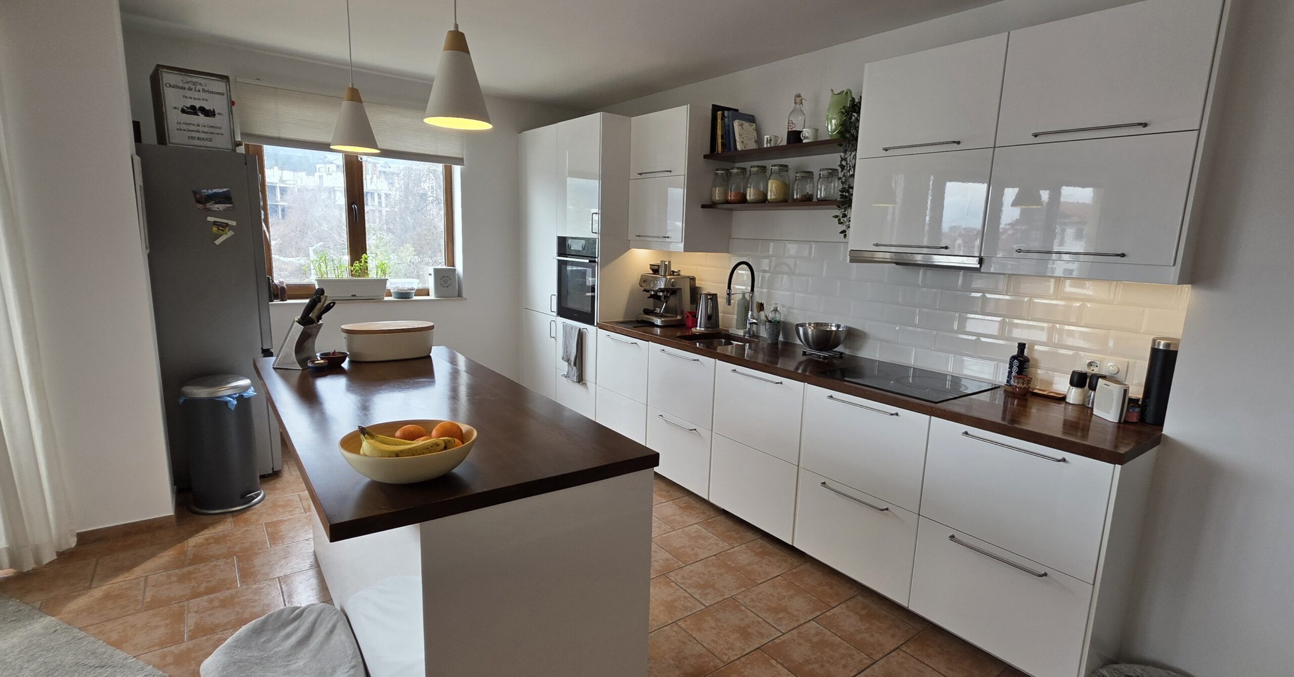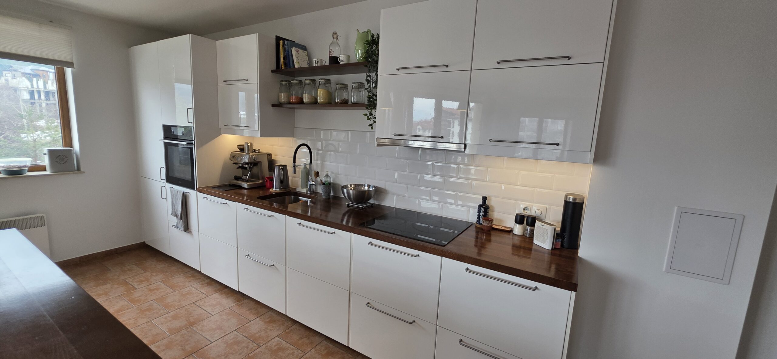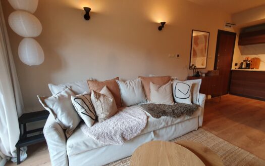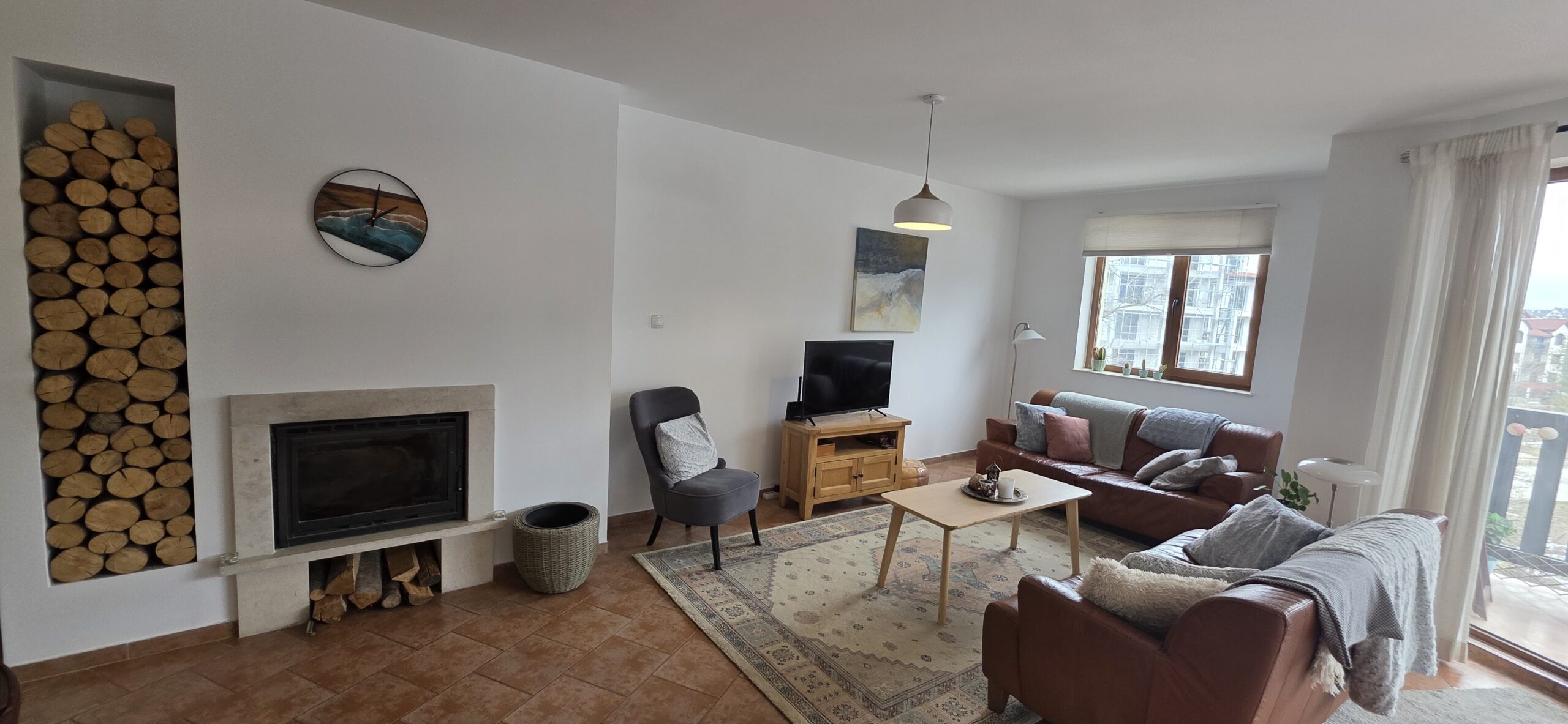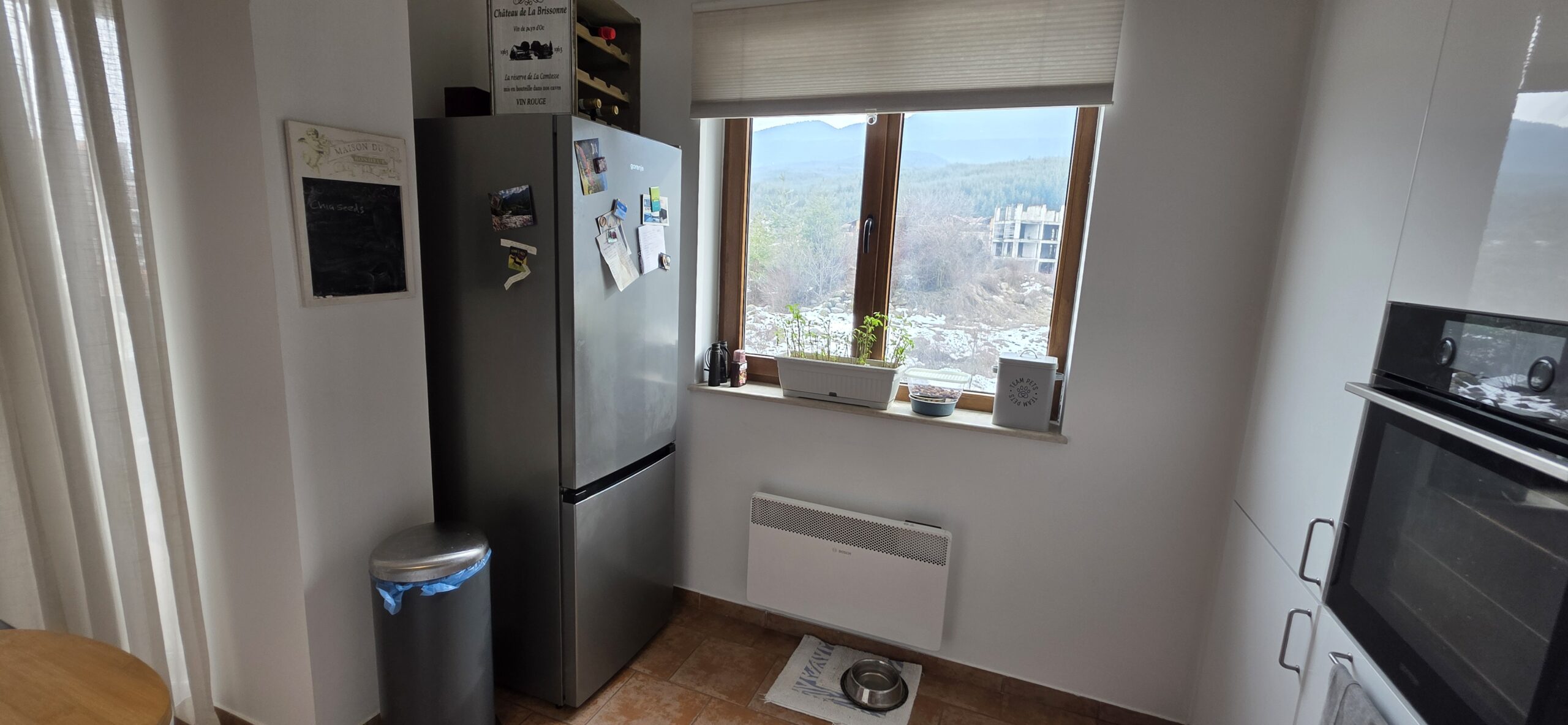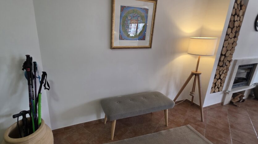 This high-end property consists of an entrance hallway, which leads to a very spacious living/dining room with a modern fully equipped custom-made kitchen, with quality appliances: an oven, ceramic hob, extractor, microwave, dishwasher, washing machine and a full size refrigerator. The lounge area has a log fireplace and is cozy furnished with two leather sofas with a coffee table and TV. There is access to a South-facing balcony with beautiful views of Pirin mountains.