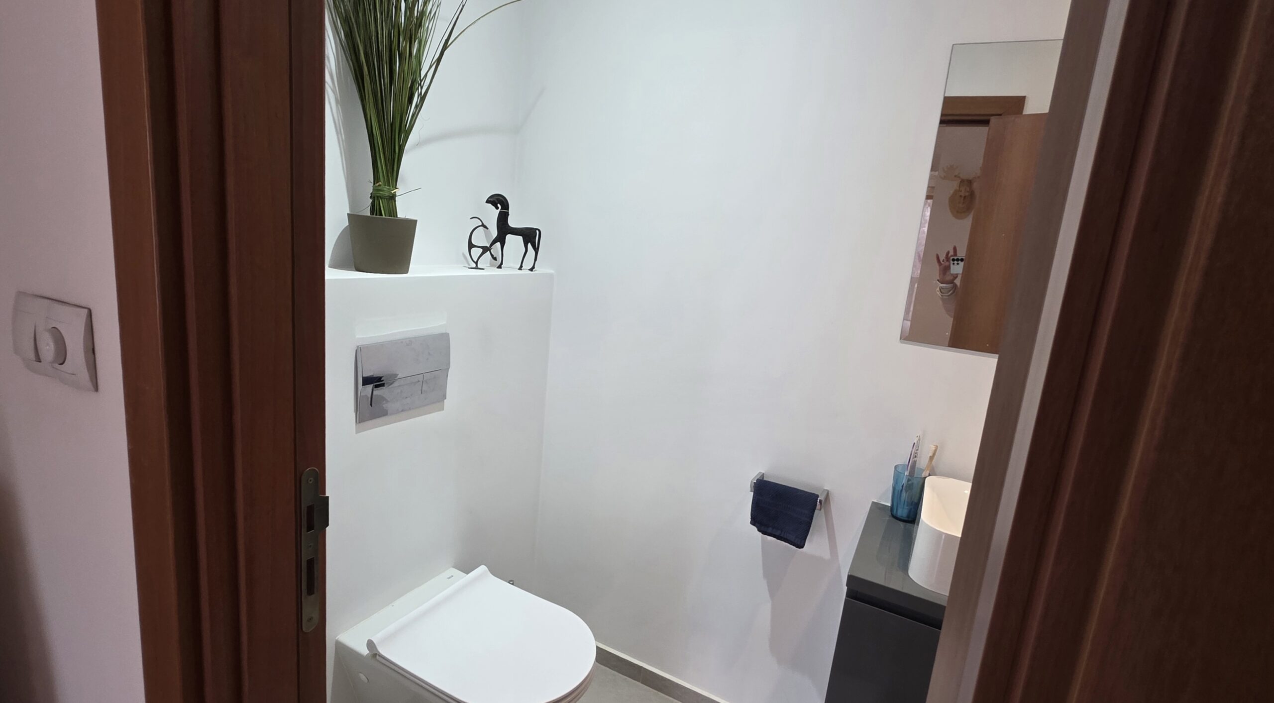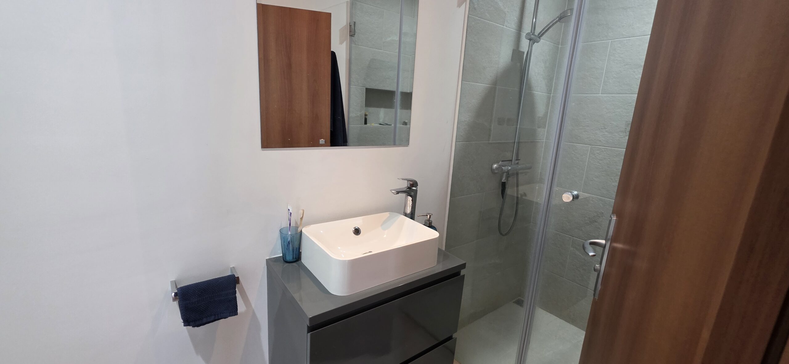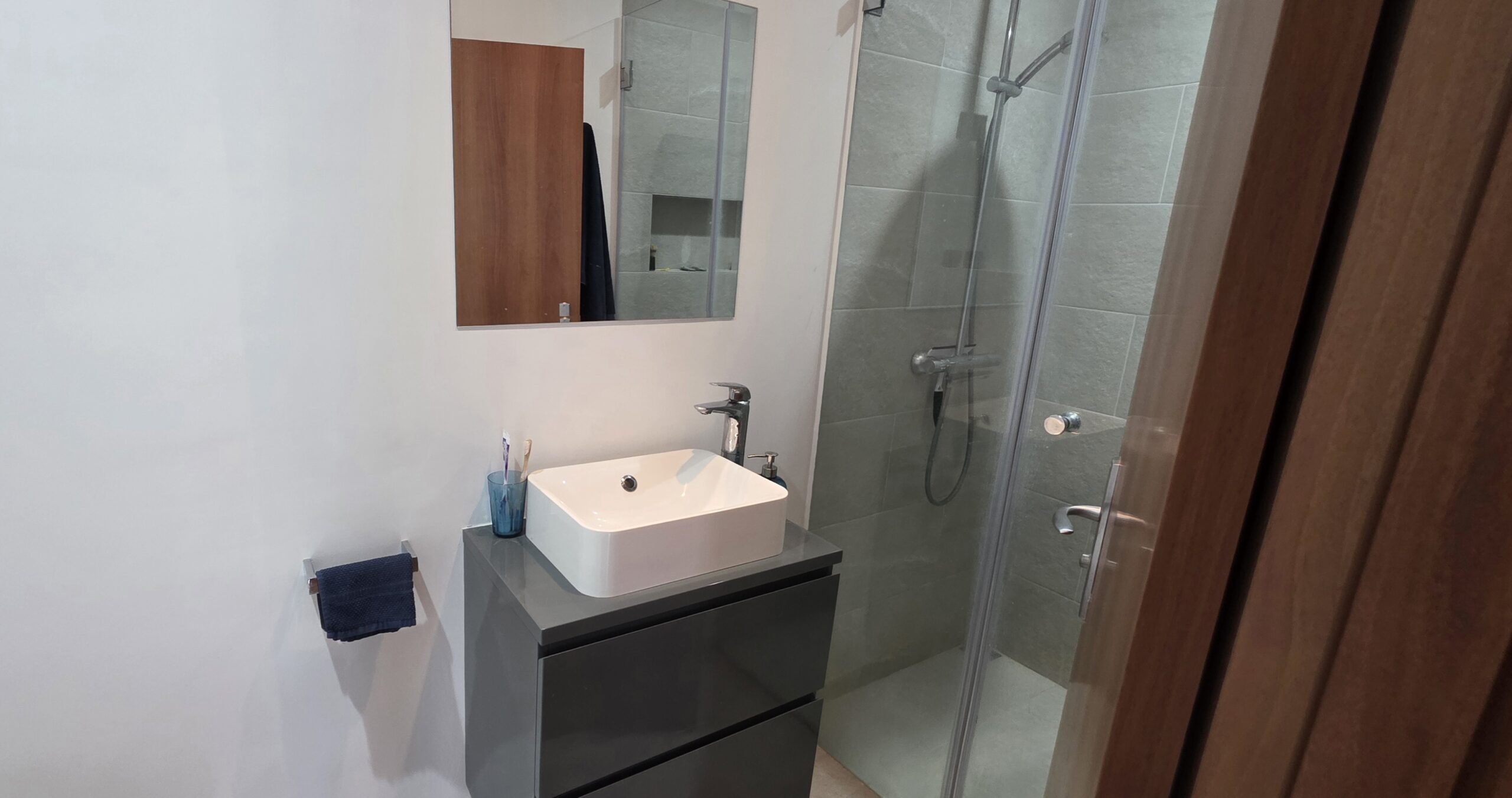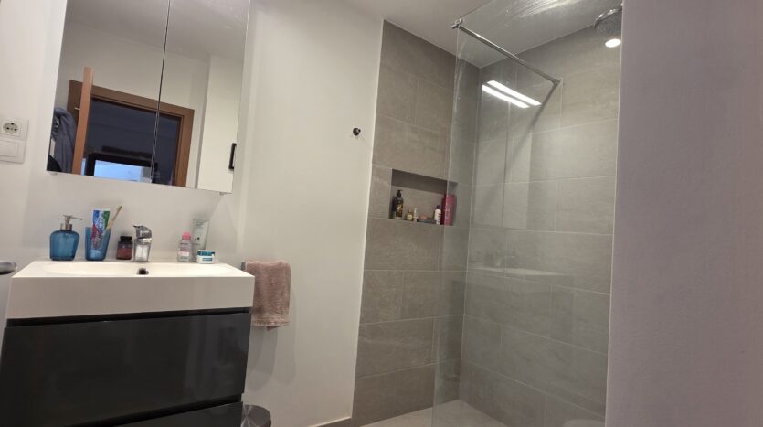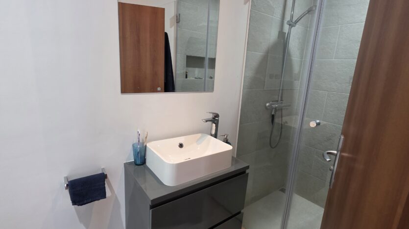 Both bathrooms are renovated and modernly equipped with shower cabins, sinks and toilets.