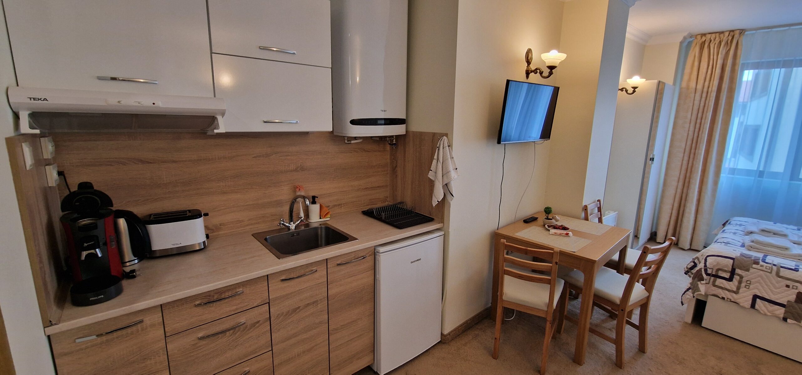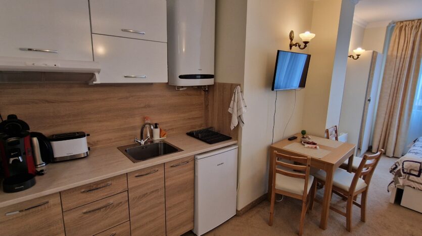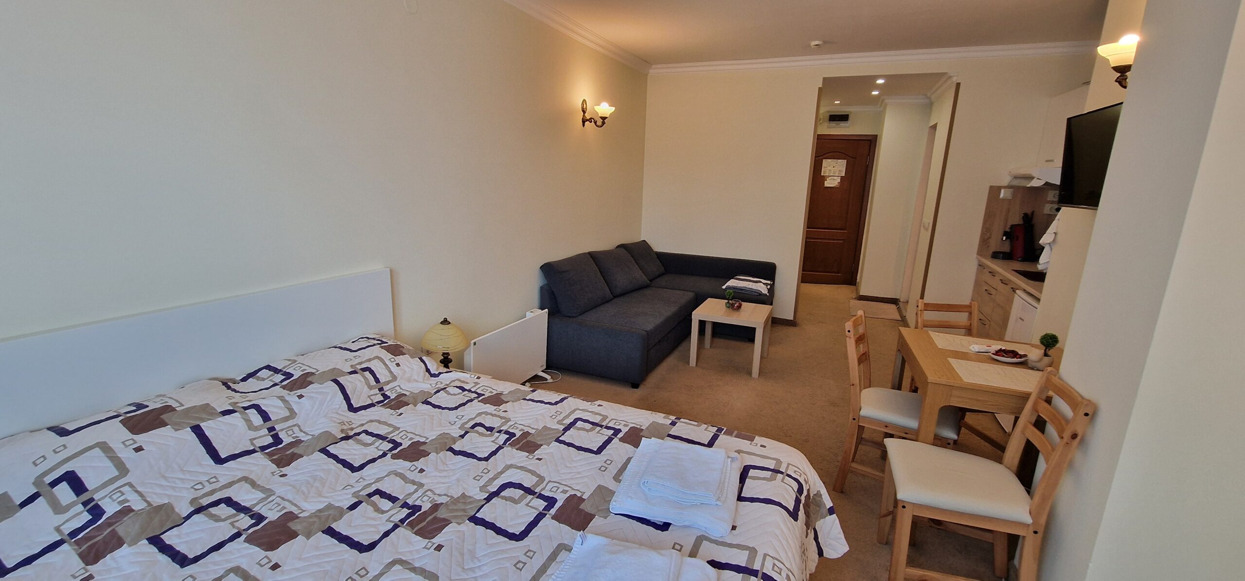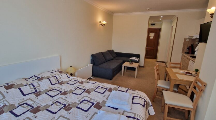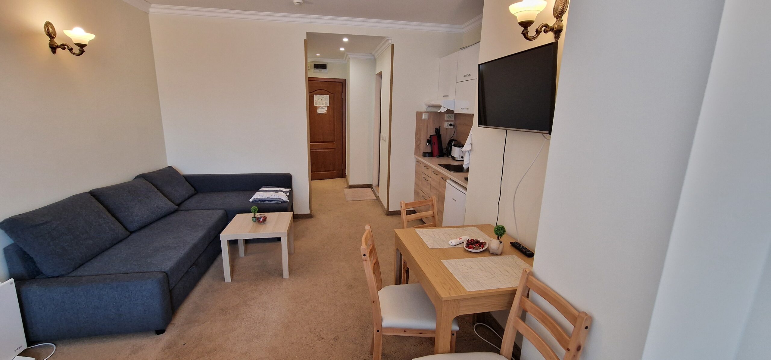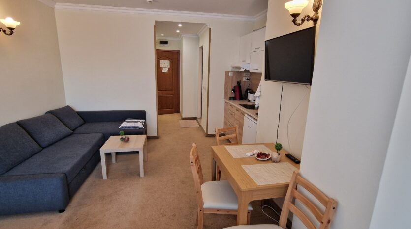 The apartment consits of an entrance hallway with a wardrobe and a living/dining room with a kitchenette equipped with an extractor, hot water boiler and a refrigerator, a dining table with chairs, a sofa bed, TV, a double bed with bedside tables and a wardrobe. The bathroom is luxury equipped with a sink, toilet and a bath tub.