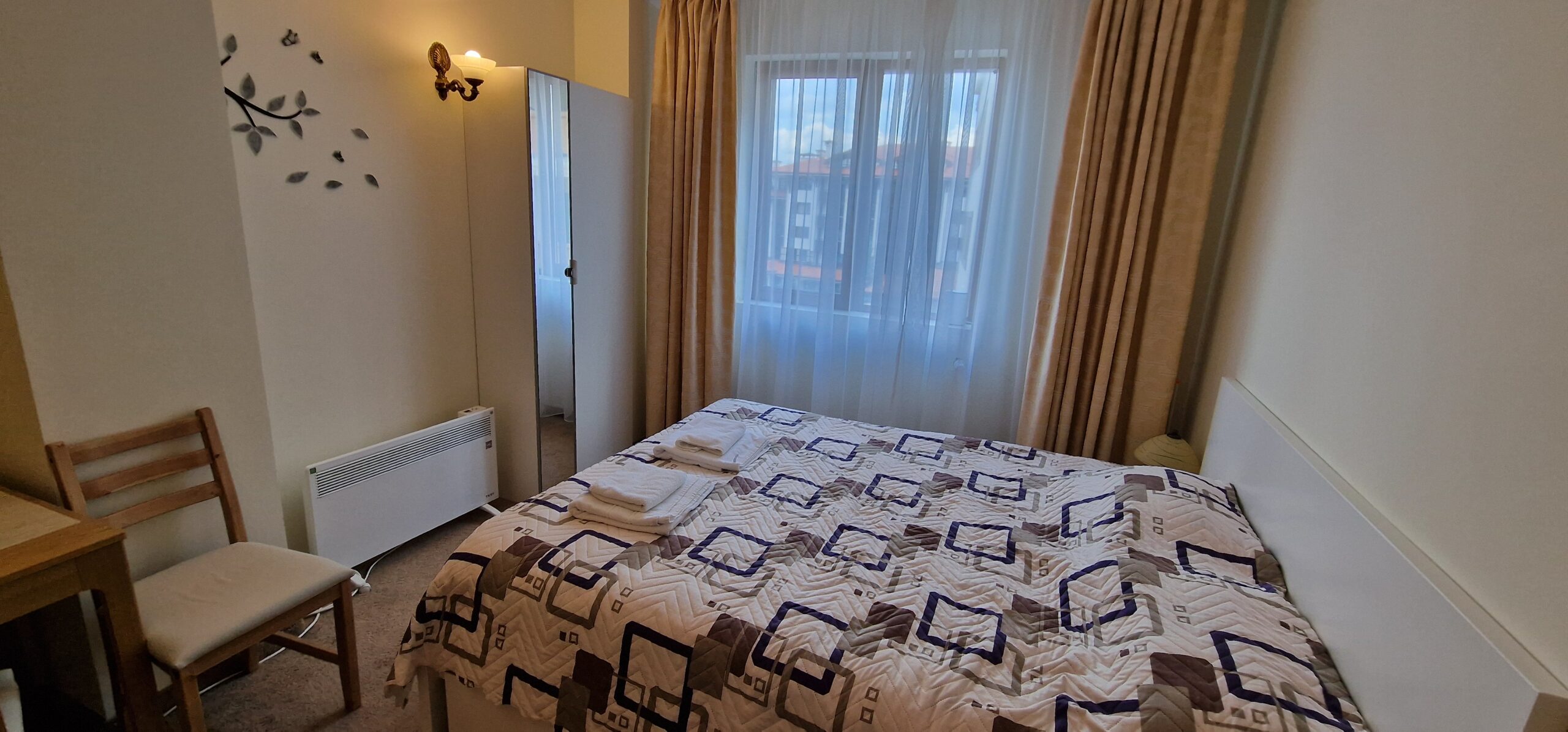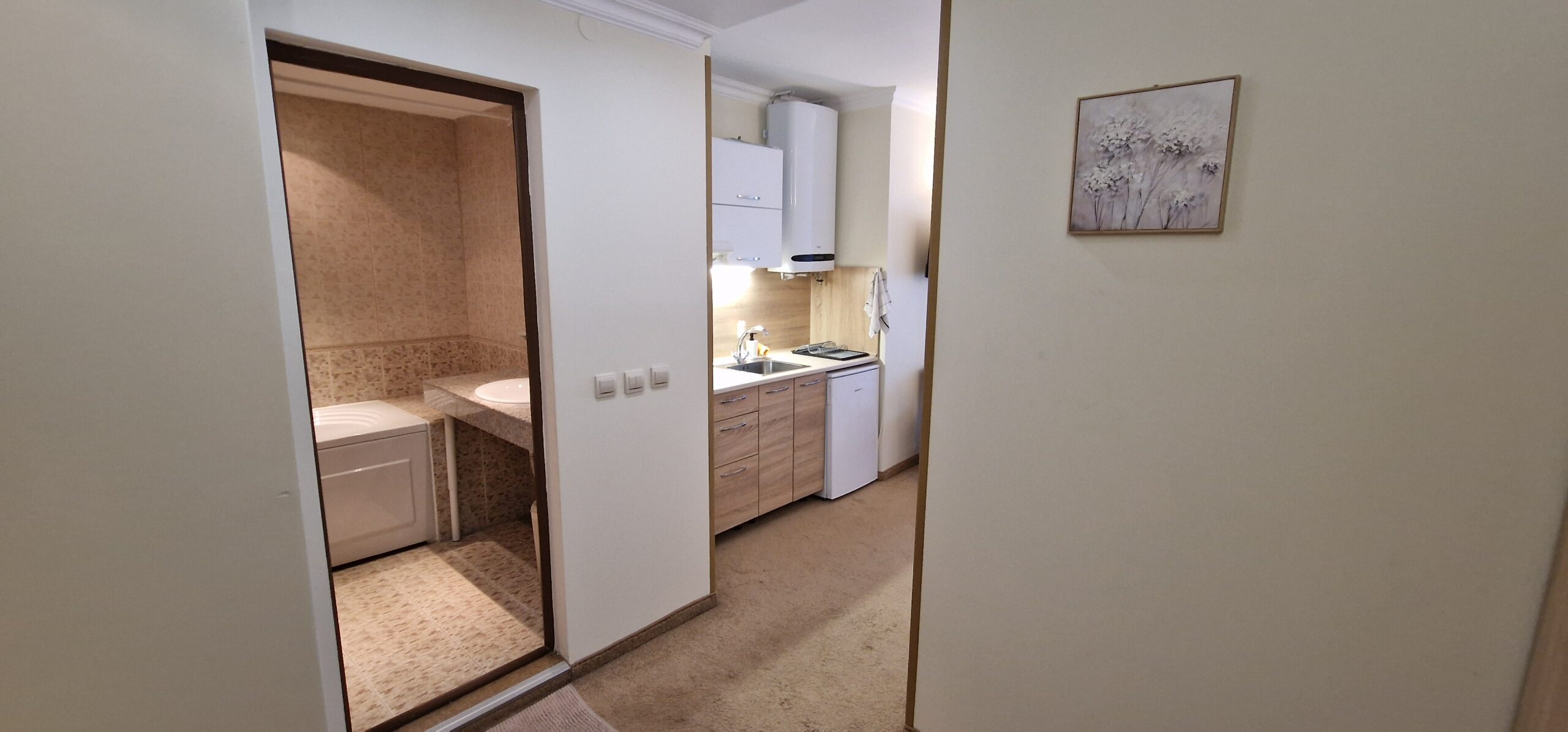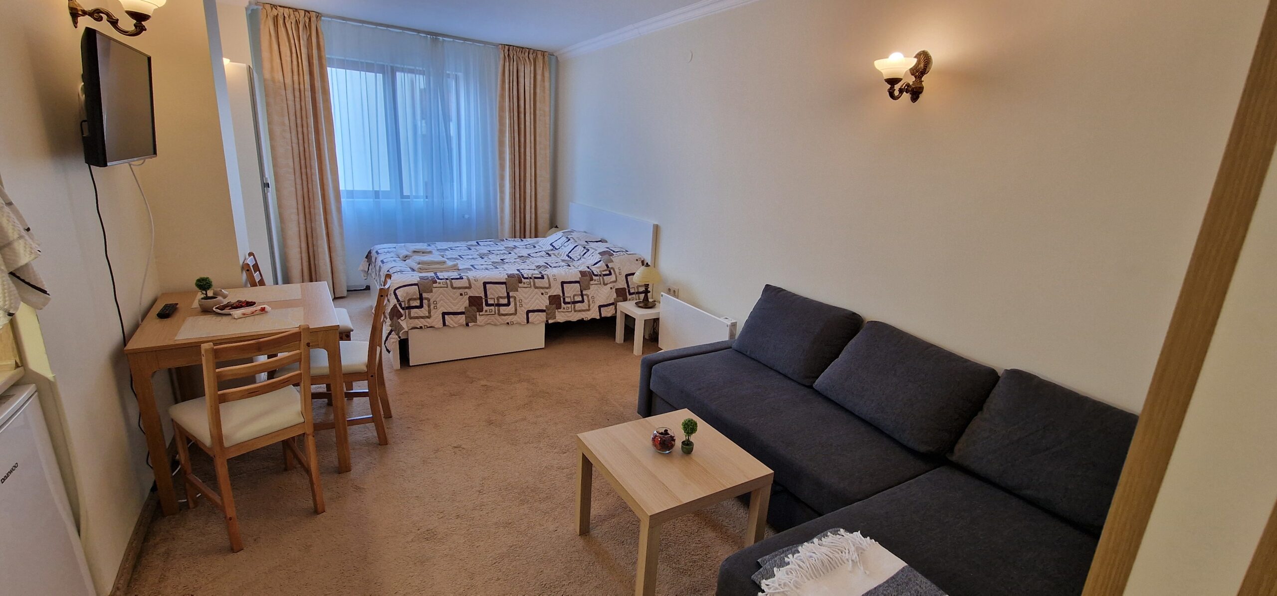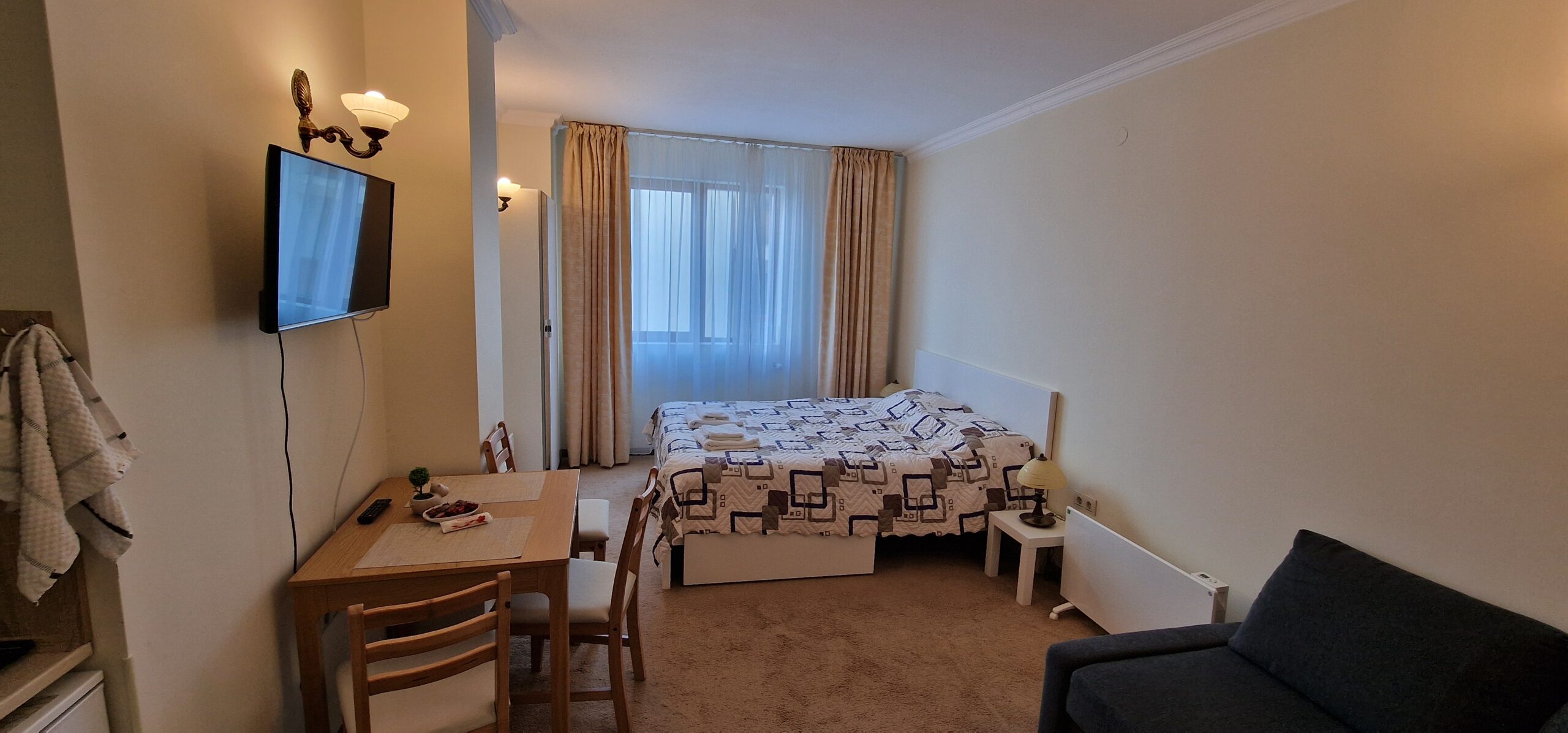 The apartment consits of an entrance hallway with a wardrobe and a living/dining room with a kitchenette equipped with an extractor, hot water boiler and a refrigerator, a dining table with chairs, a sofa bed, TV, a double bed with bedside tables and a wardrobe. The bathroom is luxury equipped with a sink, toilet and a bath tub.