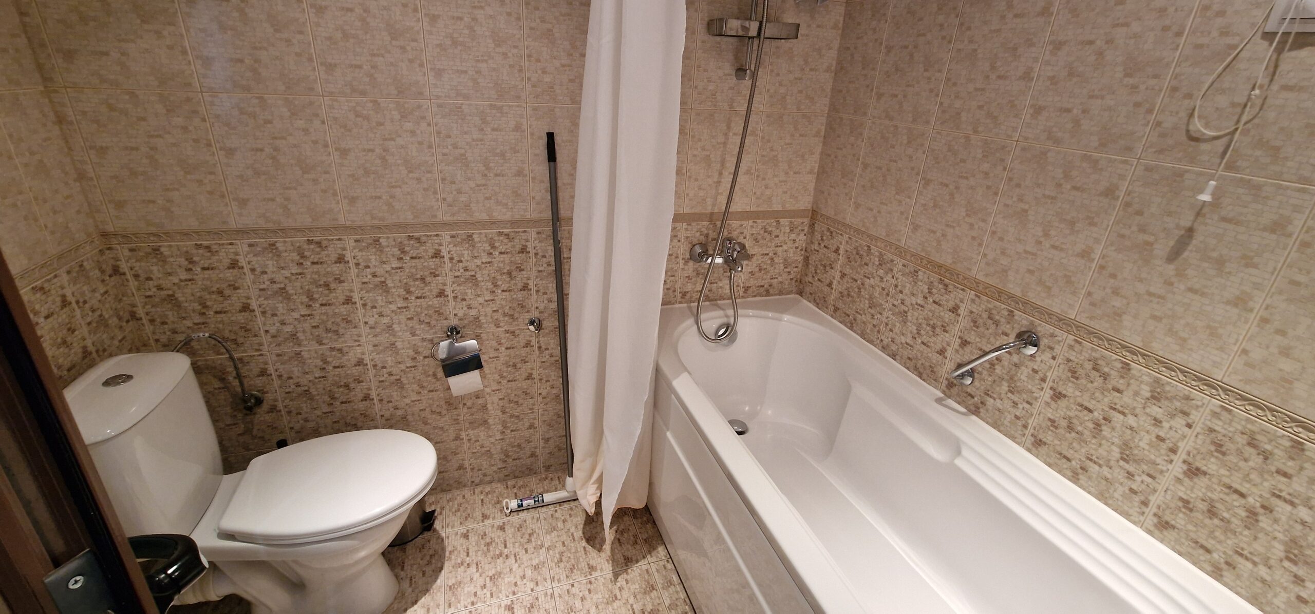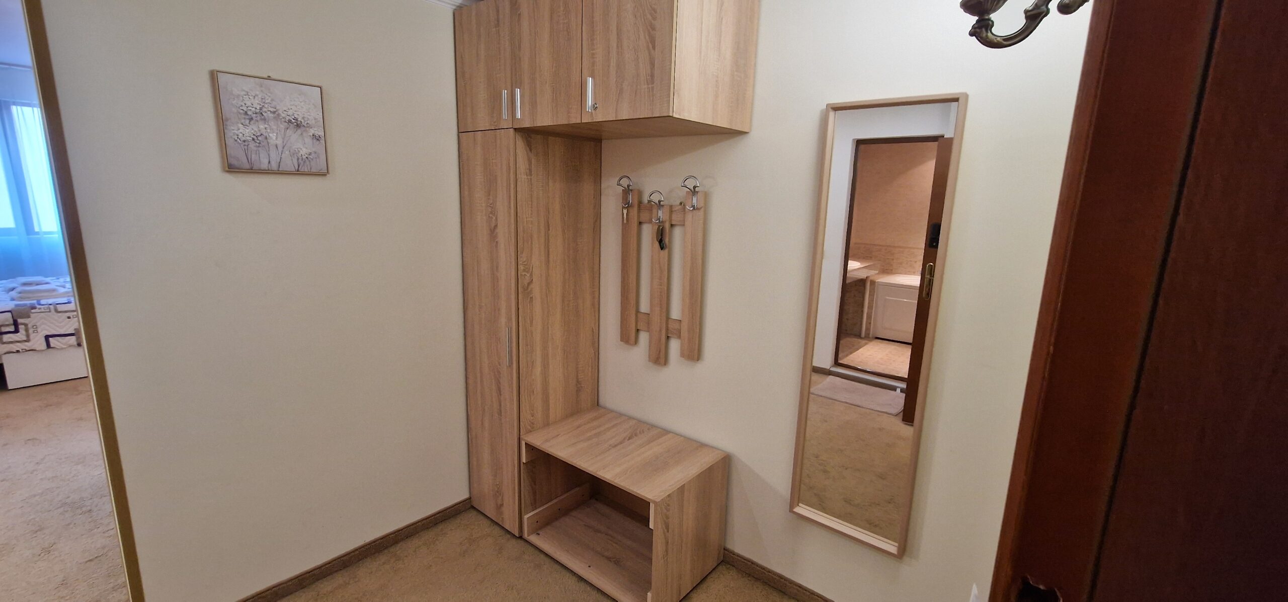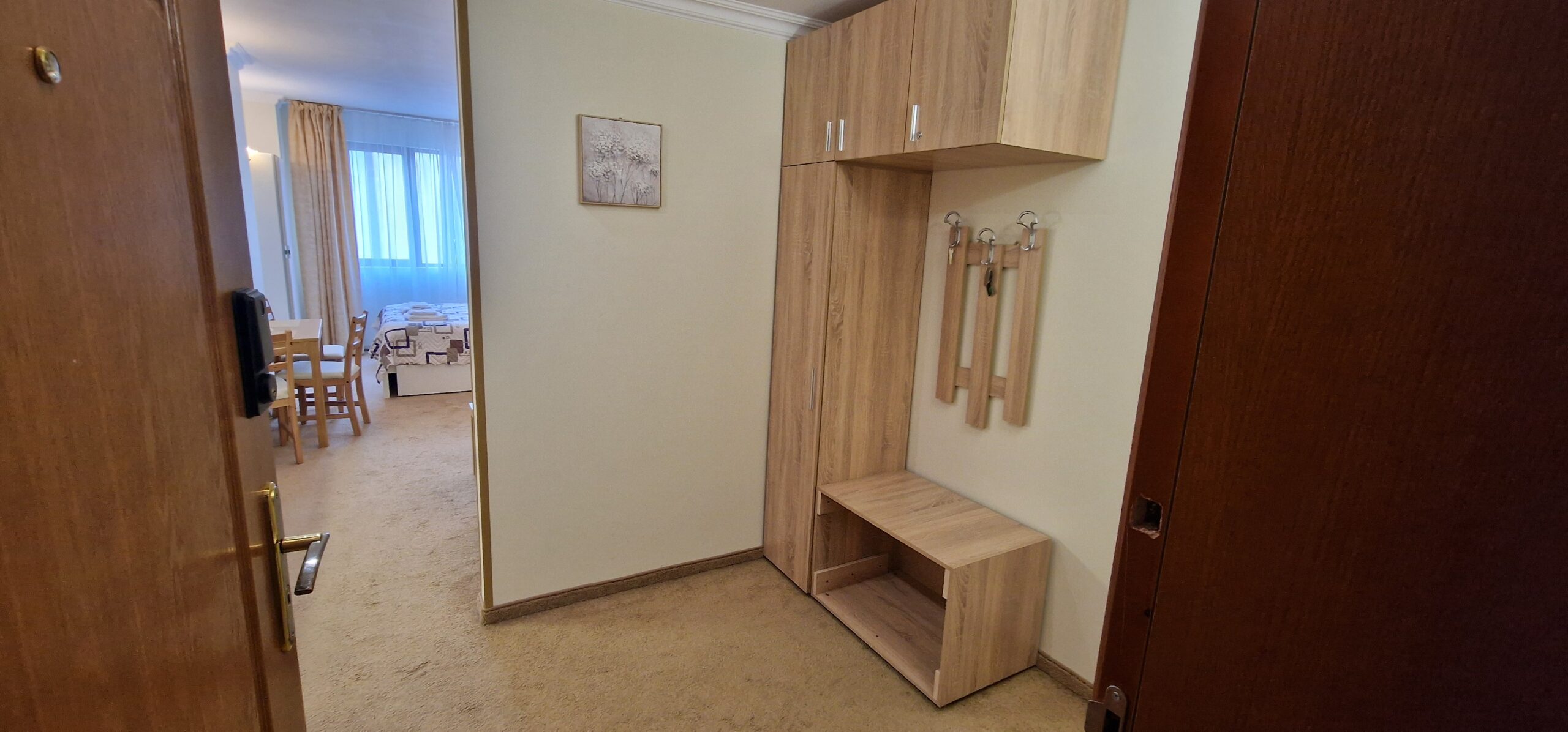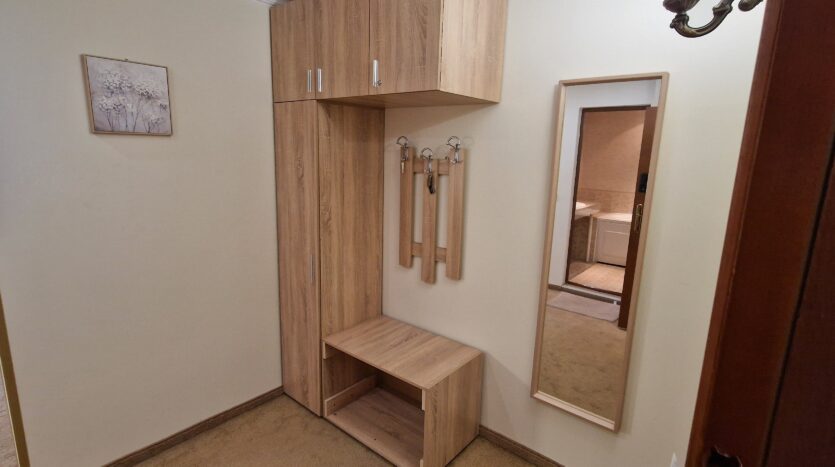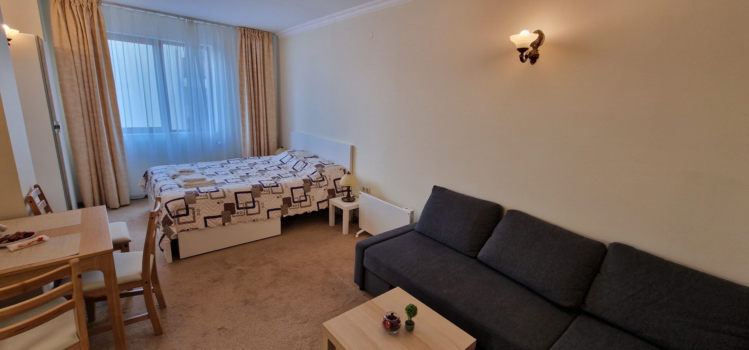 The apartment consits of an entrance hallway with a wardrobe and a living/dining room with a kitchenette equipped with an extractor, hot water boiler and a refrigerator, a dining table with chairs, a sofa bed, TV, a double bed with bedside tables and a wardrobe. The bathroom is luxury equipped with a sink, toilet and a bath tub.