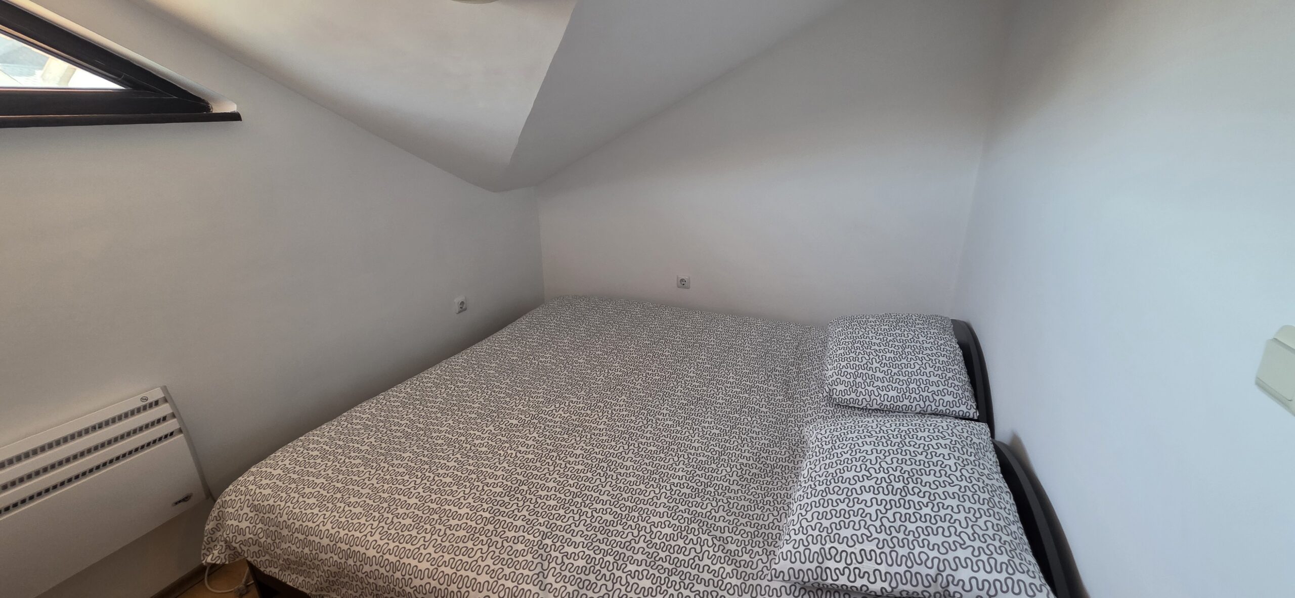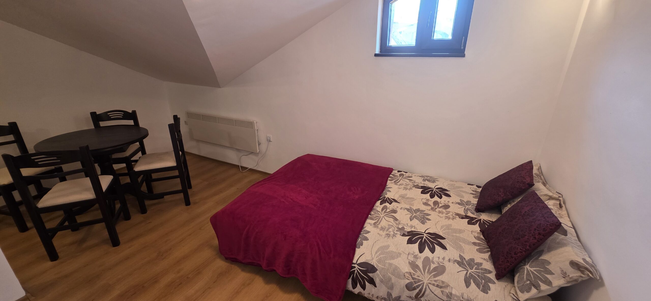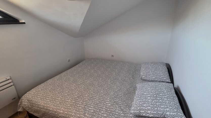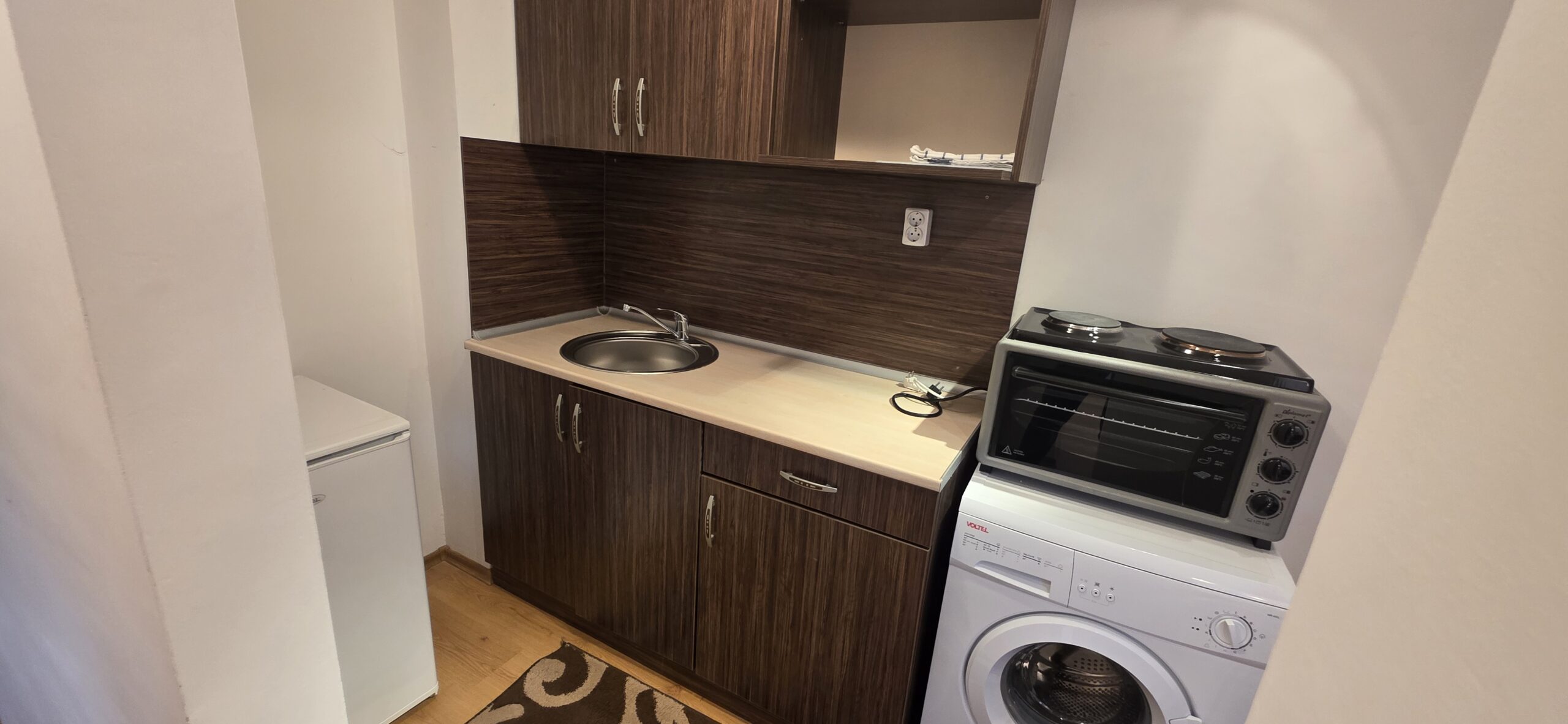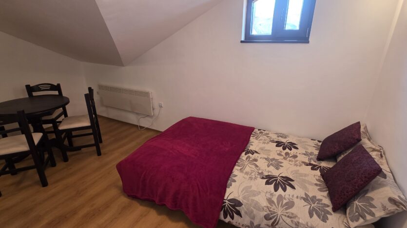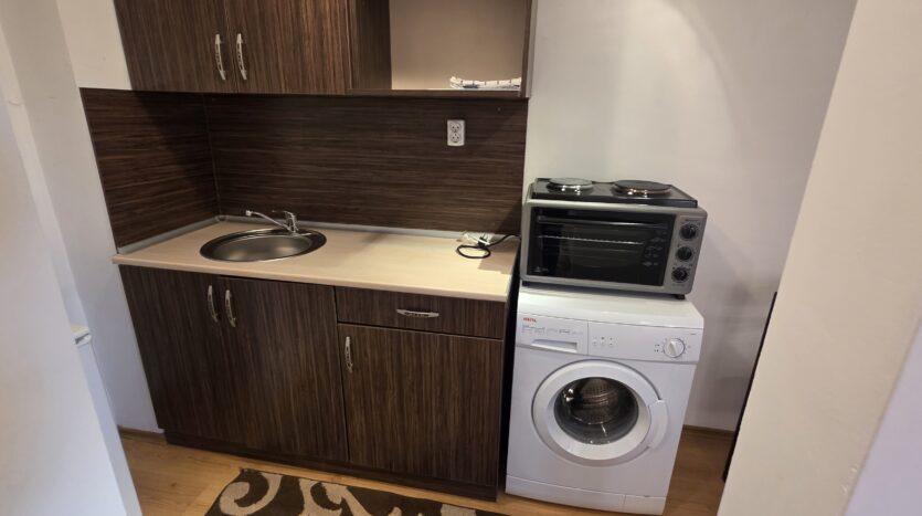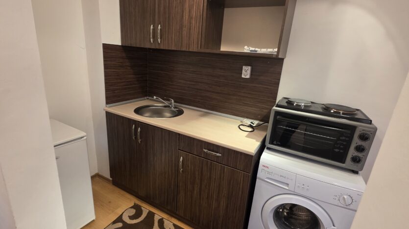 The apartment consists of a small entrance hallway with a wardrobe, a living room with a kitchenette equipped with an oven , refrigerator and a washing machine, a dining table with chairs and a sofa bed.The bedroom is furnished with a double bed and a chest of drawers.The bathroom is equipped with a shower, toilet, sink and hot water boiler.