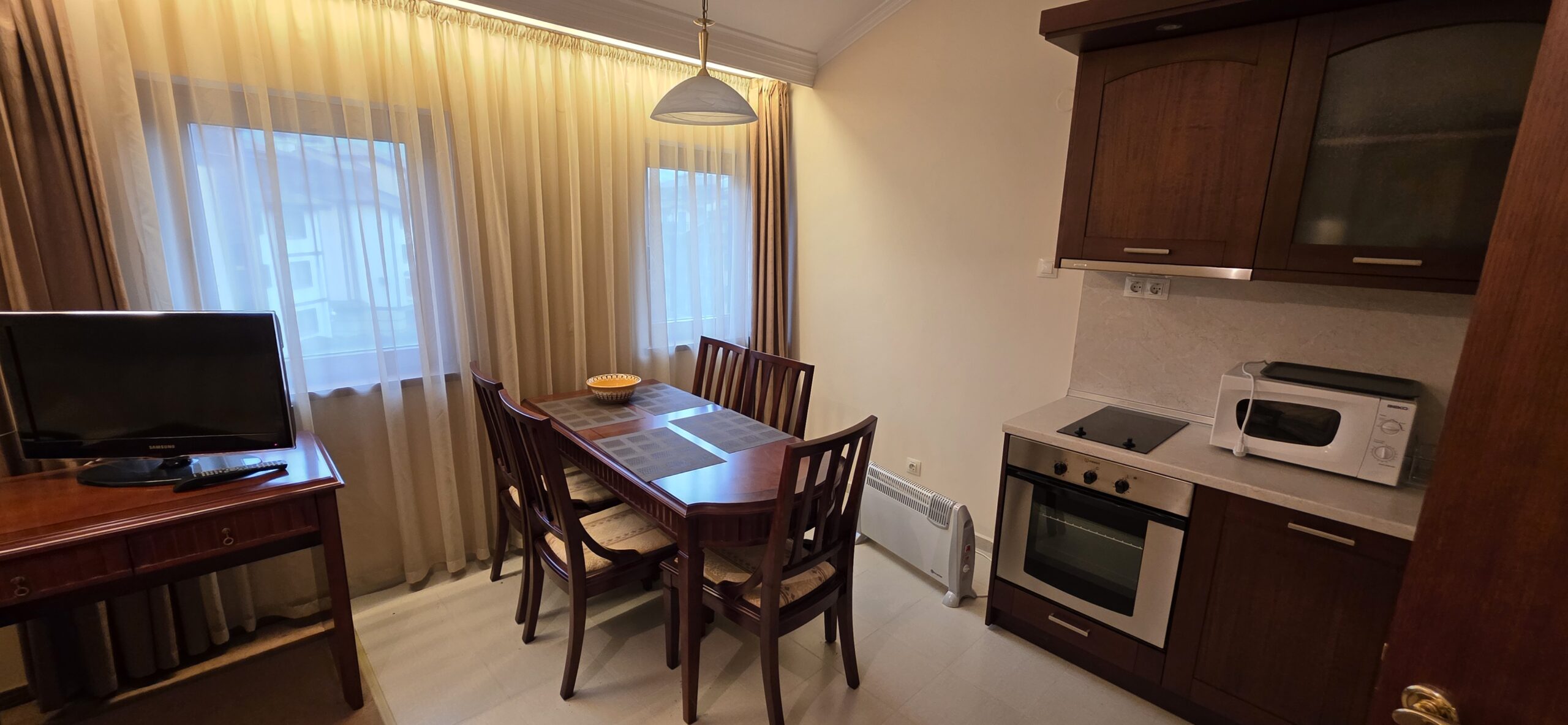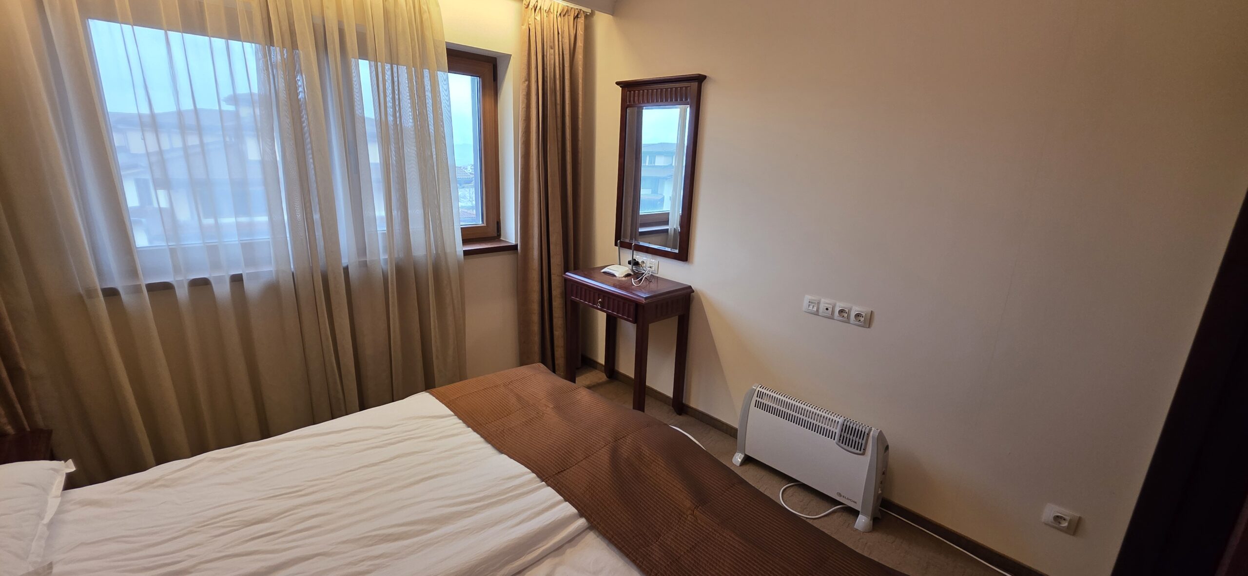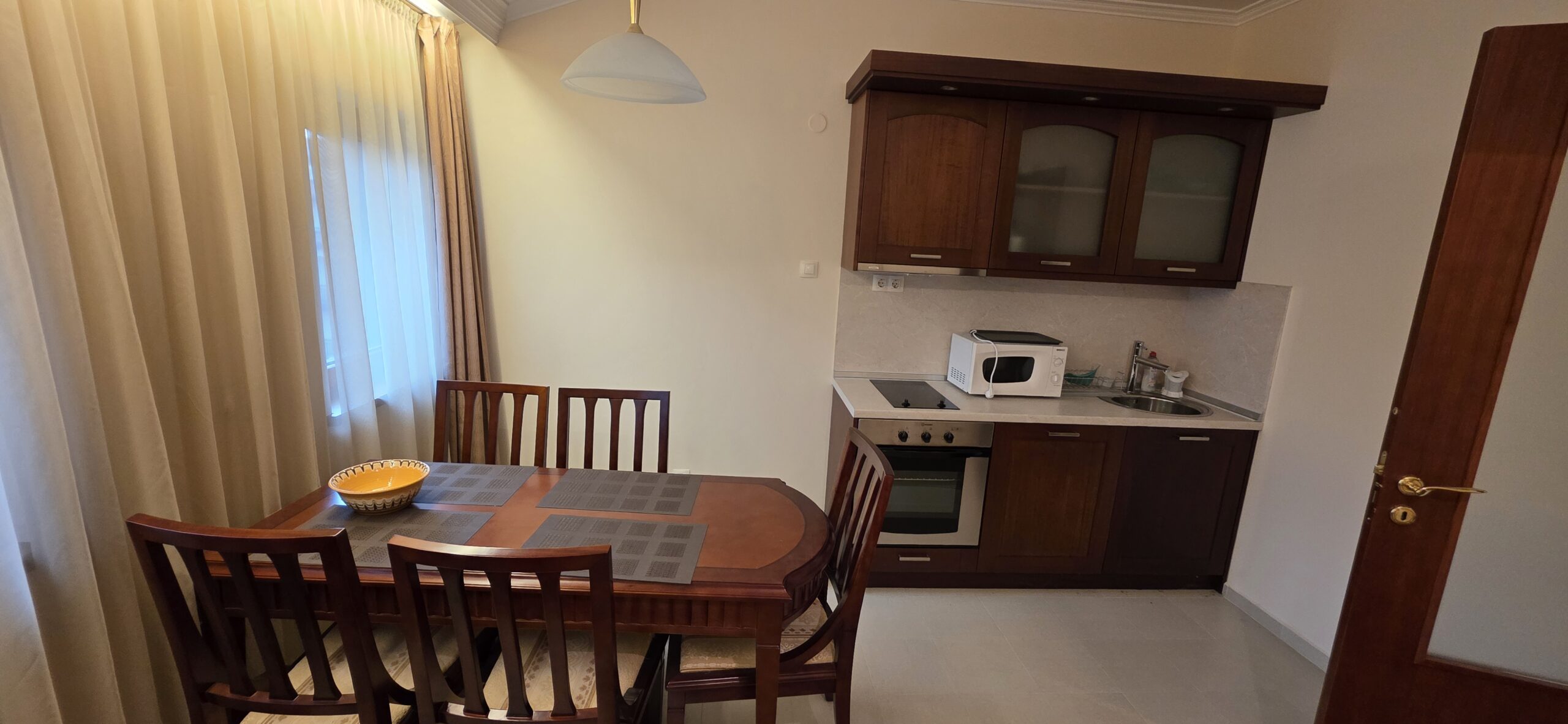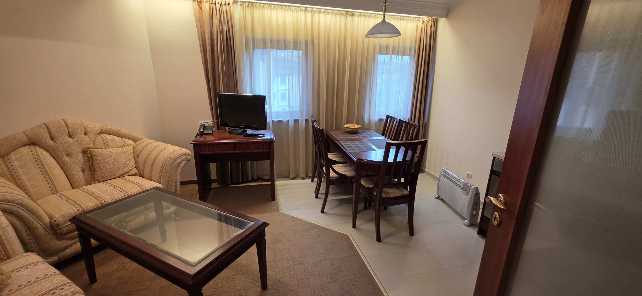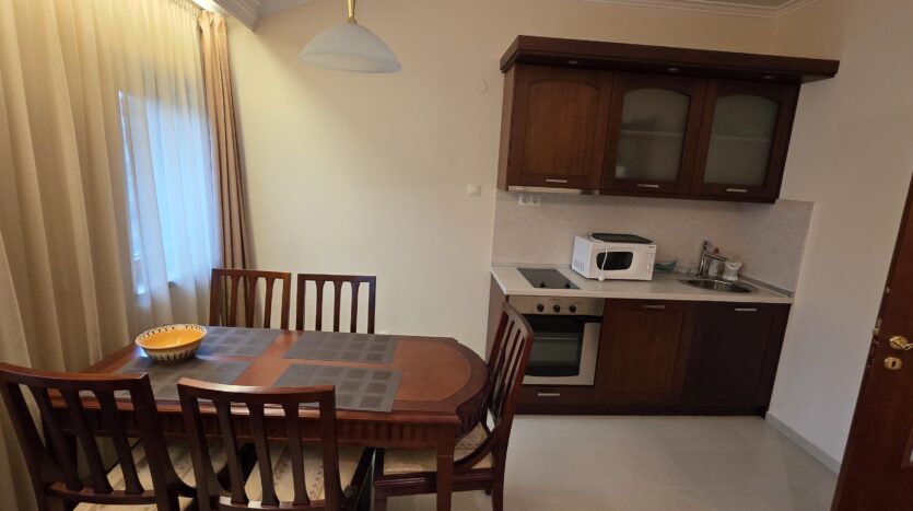 This beautifully furnished apartment consists of an entrance hallway with a mirror , a cozy living/dining room with a kitchenette equipped with an oven, ceramic hob, extractor, microwave and a refrigerator, dining table with chairs, a sofa bed with an armchair, coffee table and a TV. The living room is with South exposure and there is a nice view to the garden of the complex and Pirin mountain. The bedroom is elegant furnished with a double bed, bedside tables, mirror and а wardrobe and has North-East exposure.The bathroom is luxury equipped with a bathtub, sink , toilet and hot water boiler.