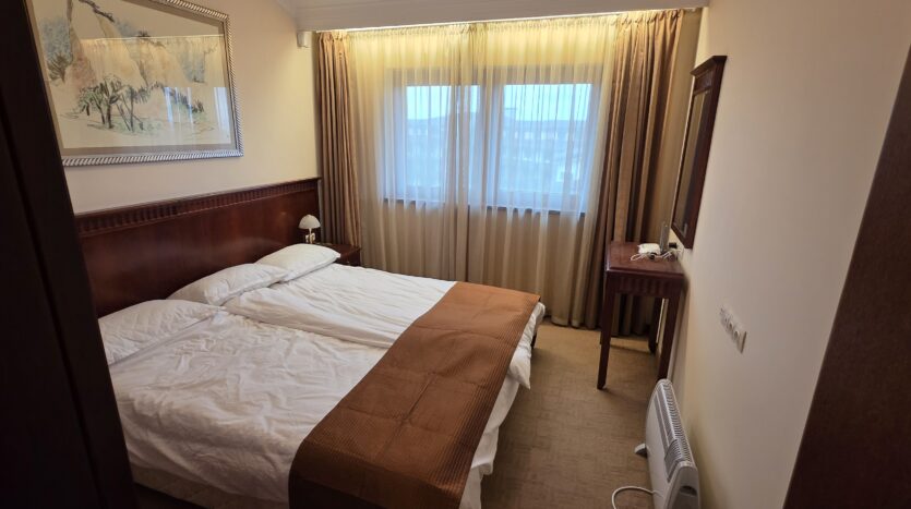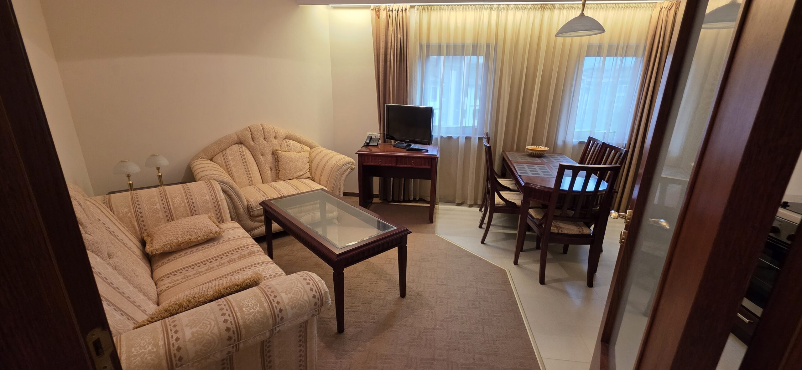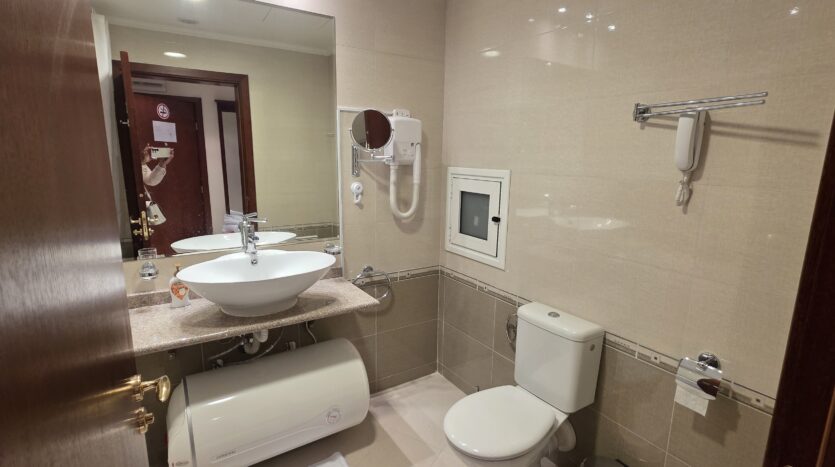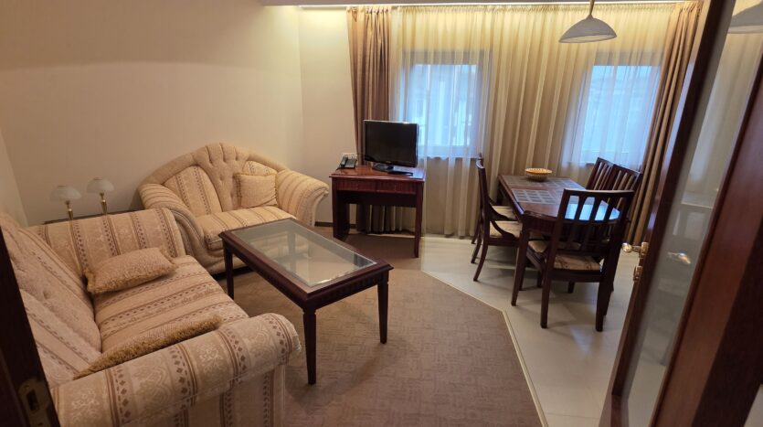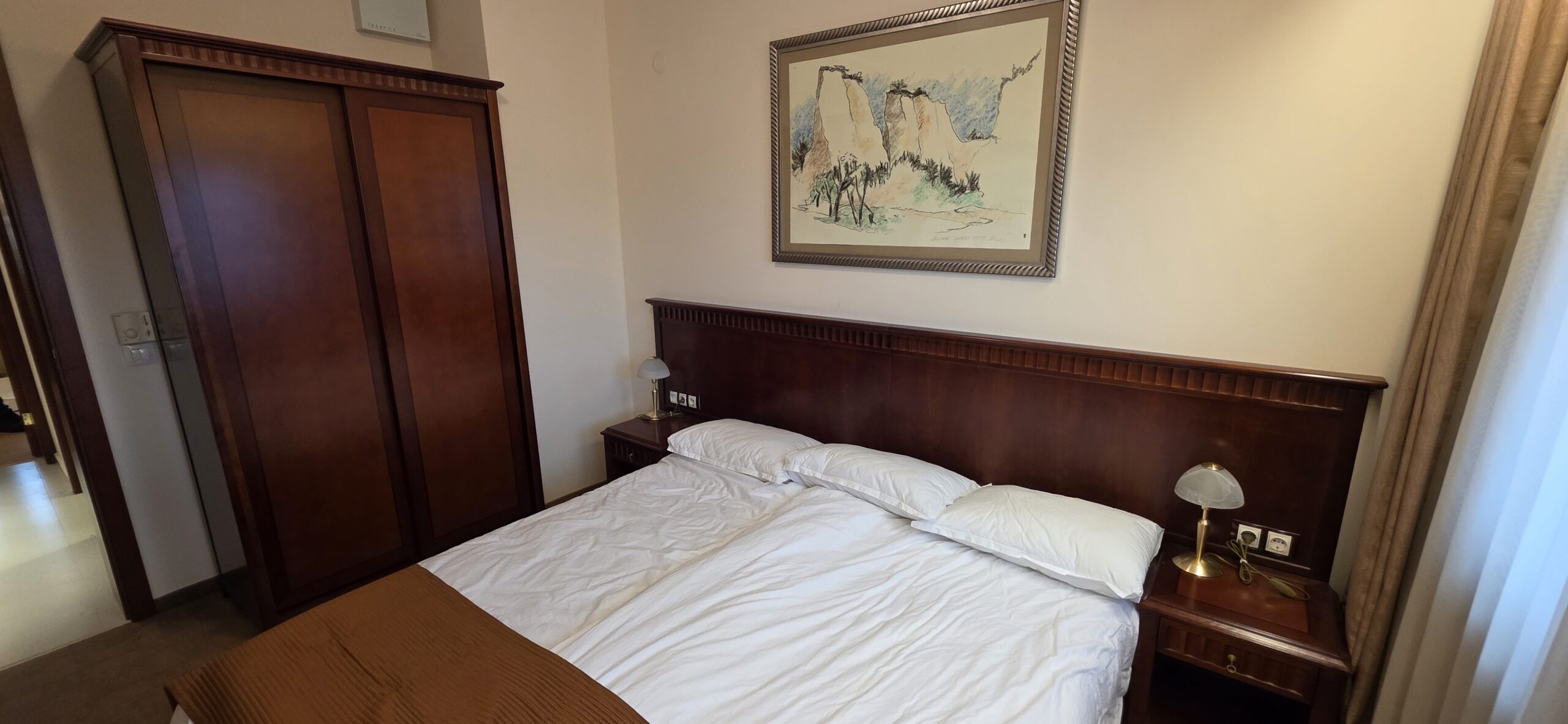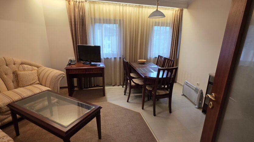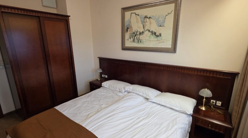 This beautifully furnished apartment consists of an entrance hallway with a mirror , a cozy living/dining room with a kitchenette equipped with an oven, ceramic hob, extractor, microwave and a refrigerator, dining table with chairs, a sofa bed with an armchair, coffee table and a TV. The living room is with South exposure and there is a nice view to the garden of the complex and Pirin mountain. The bedroom is elegant furnished with a double bed, bedside tables, mirror and а wardrobe and has North-East exposure.The bathroom is luxury equipped with a bathtub, sink , toilet and hot water boiler.