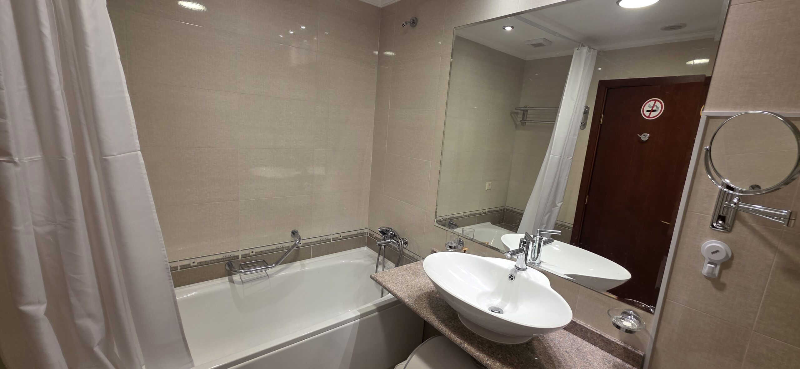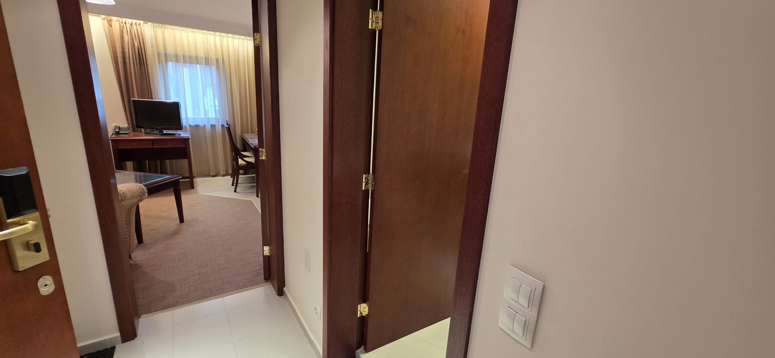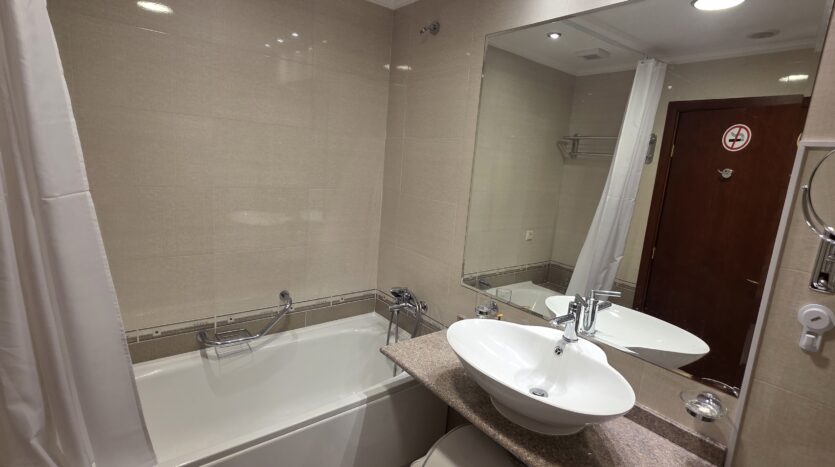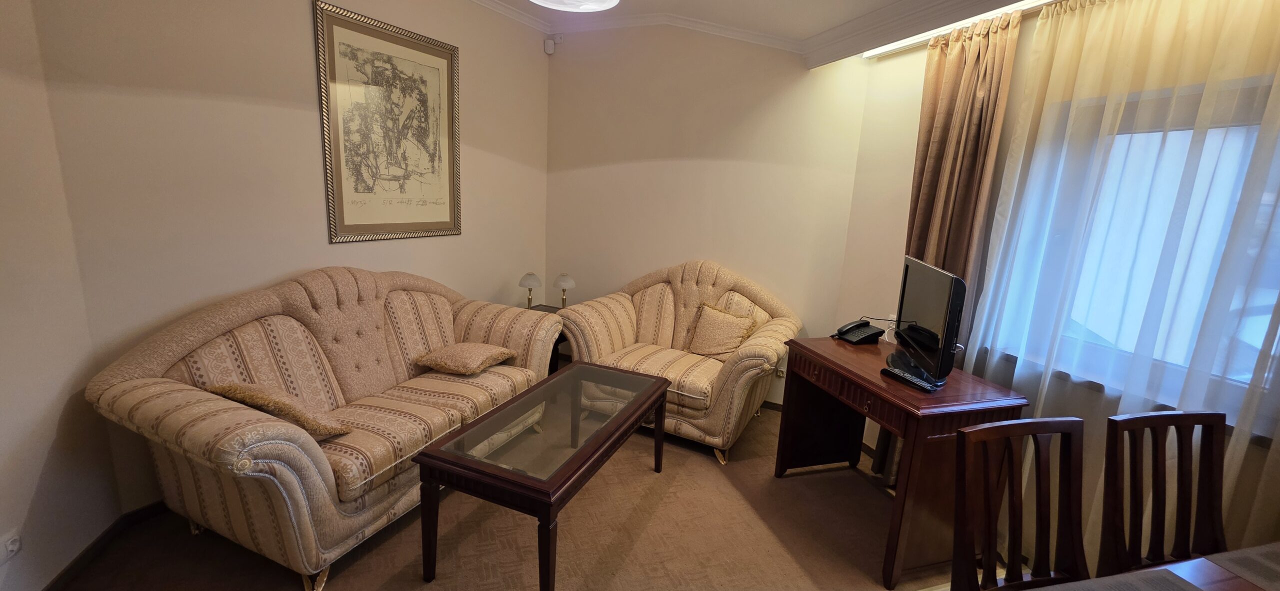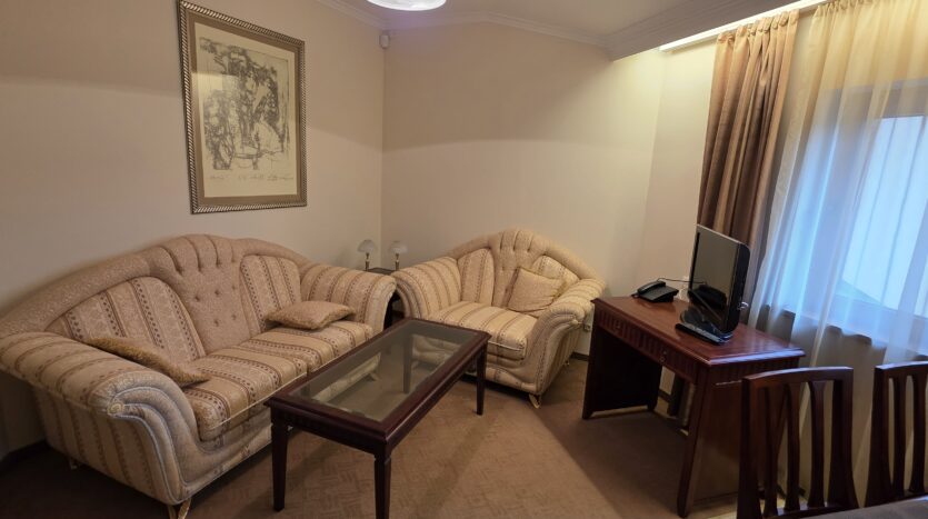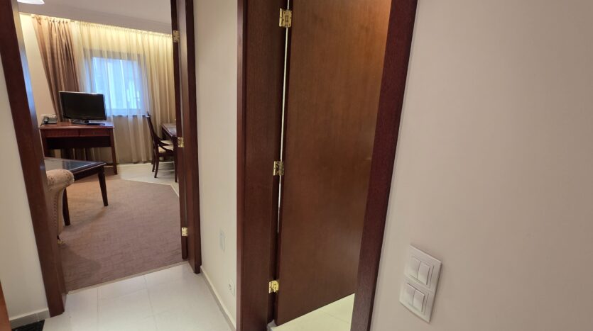 This beautifully furnished apartment consists of an entrance hallway with a mirror , a cozy living/dining room with a kitchenette equipped with an oven, ceramic hob, extractor, microwave and a refrigerator, dining table with chairs, a sofa bed with an armchair, coffee table and a TV. The living room is with South exposure and there is a nice view to the garden of the complex and Pirin mountain. The bedroom is elegant furnished with a double bed, bedside tables, mirror and а wardrobe and has North-East exposure.The bathroom is luxury equipped with a bathtub, sink , toilet and hot water boiler.