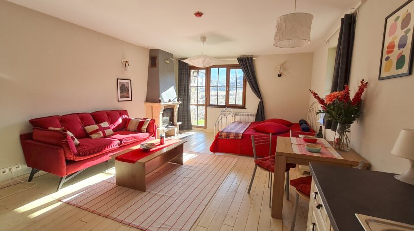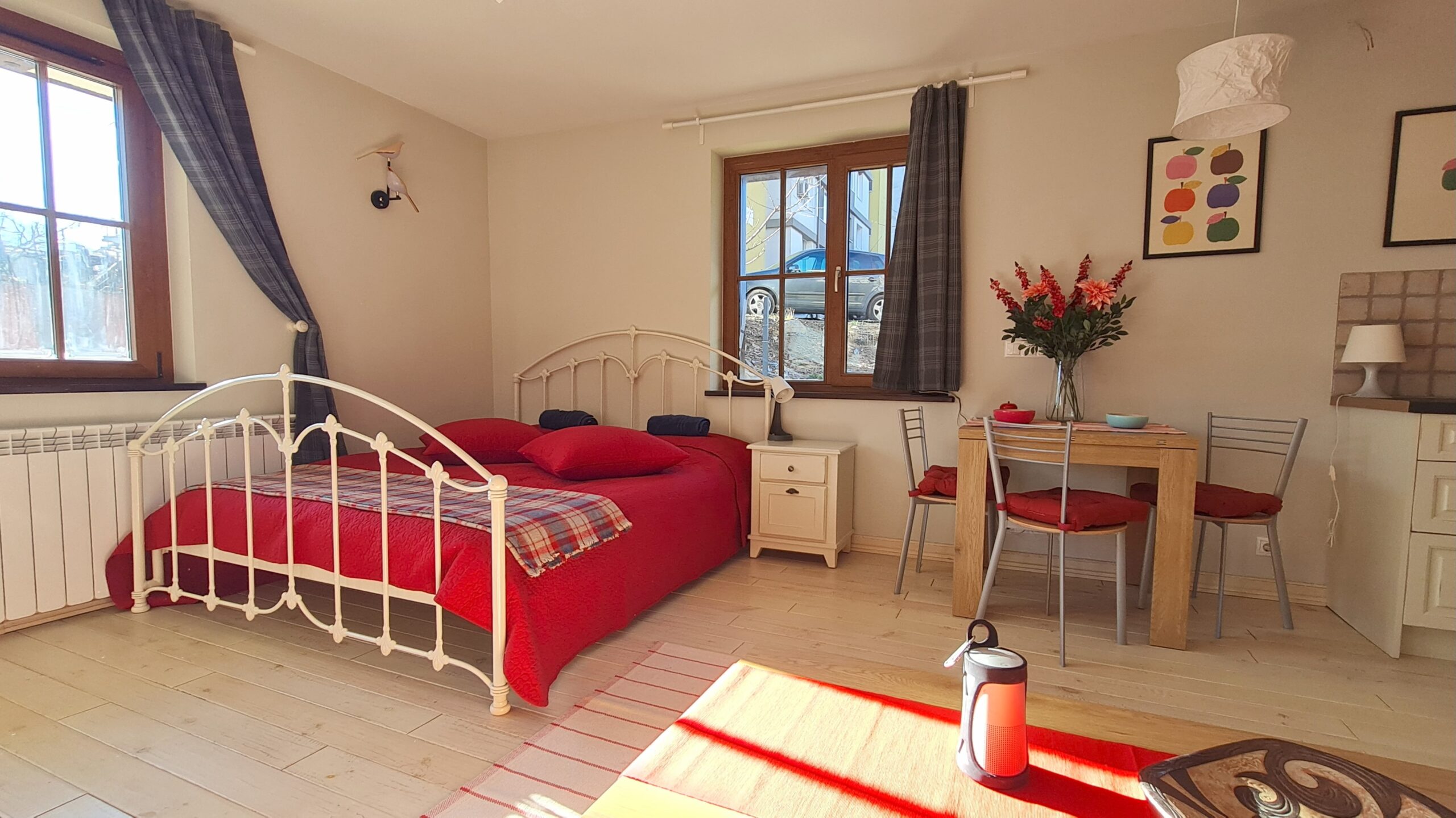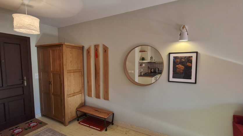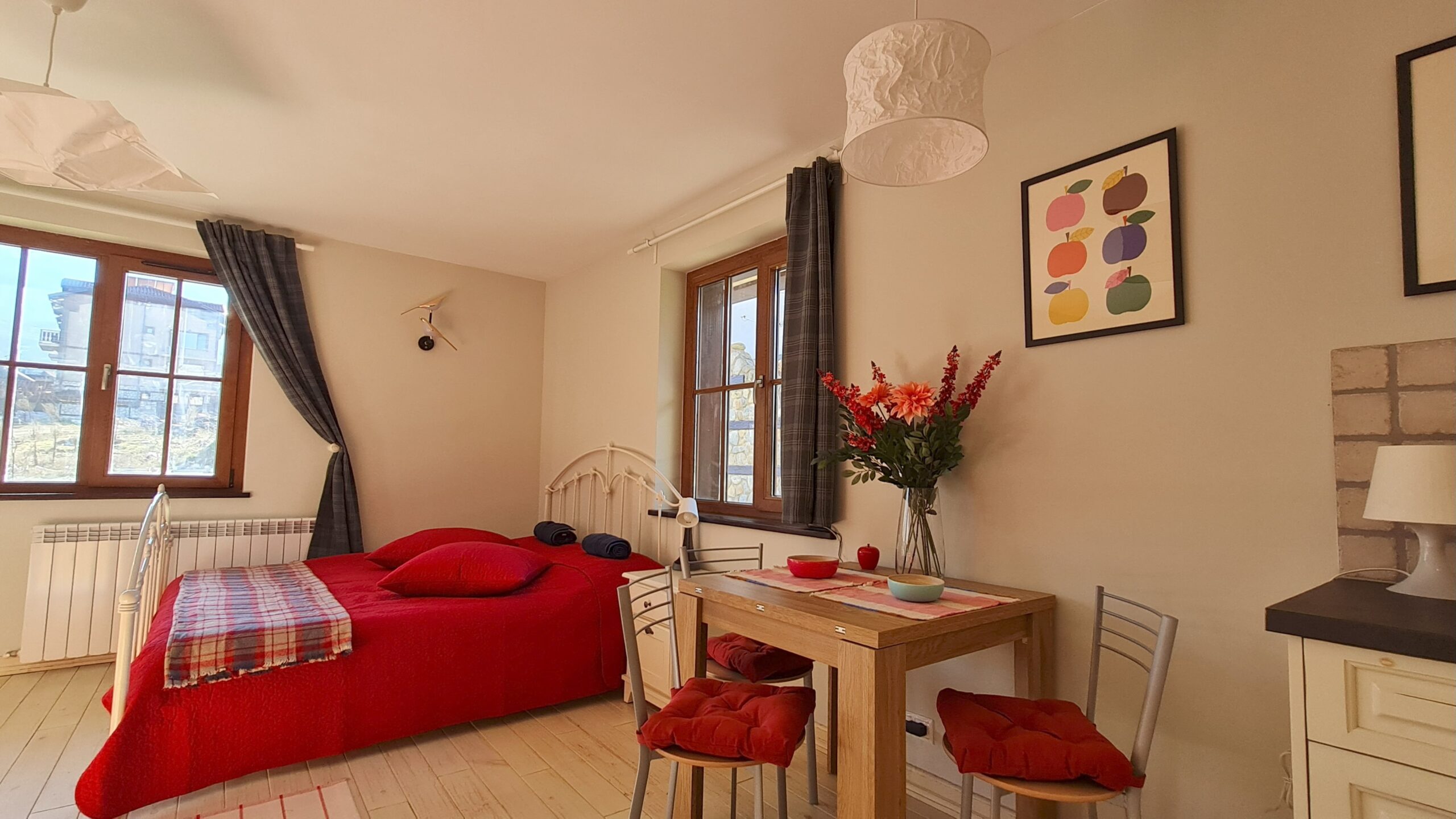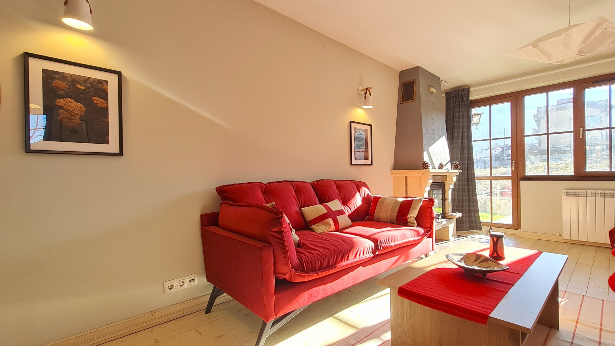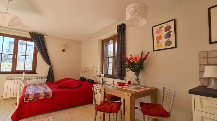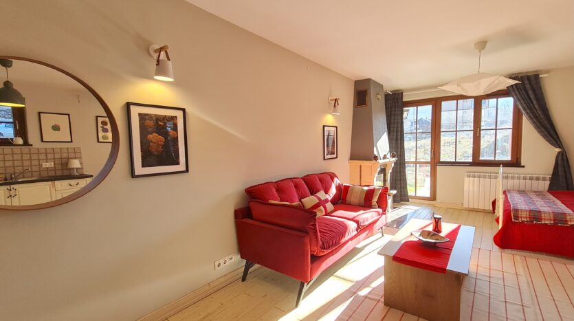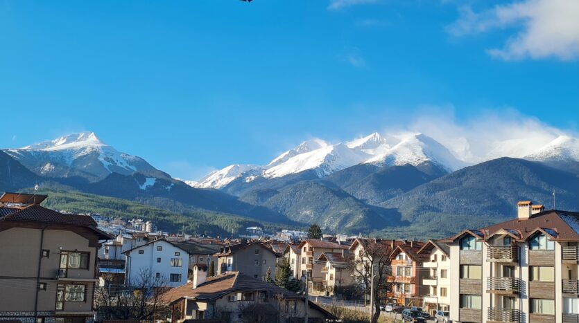 The apartment consists of an entrance hallway, solid wood kitchenette equipped with an oven, extractor and refrigerator, a dining area, a comfortable sofa with coffee table, a double bed with bedside tables and a wardrobe. There is an access to a patio with nice view of Pirin mountains. The bathroom is luxury equipped with a shower, sink and a toilet.