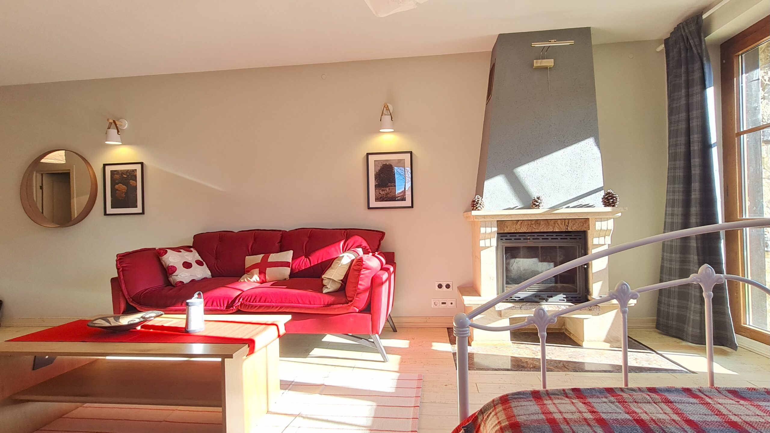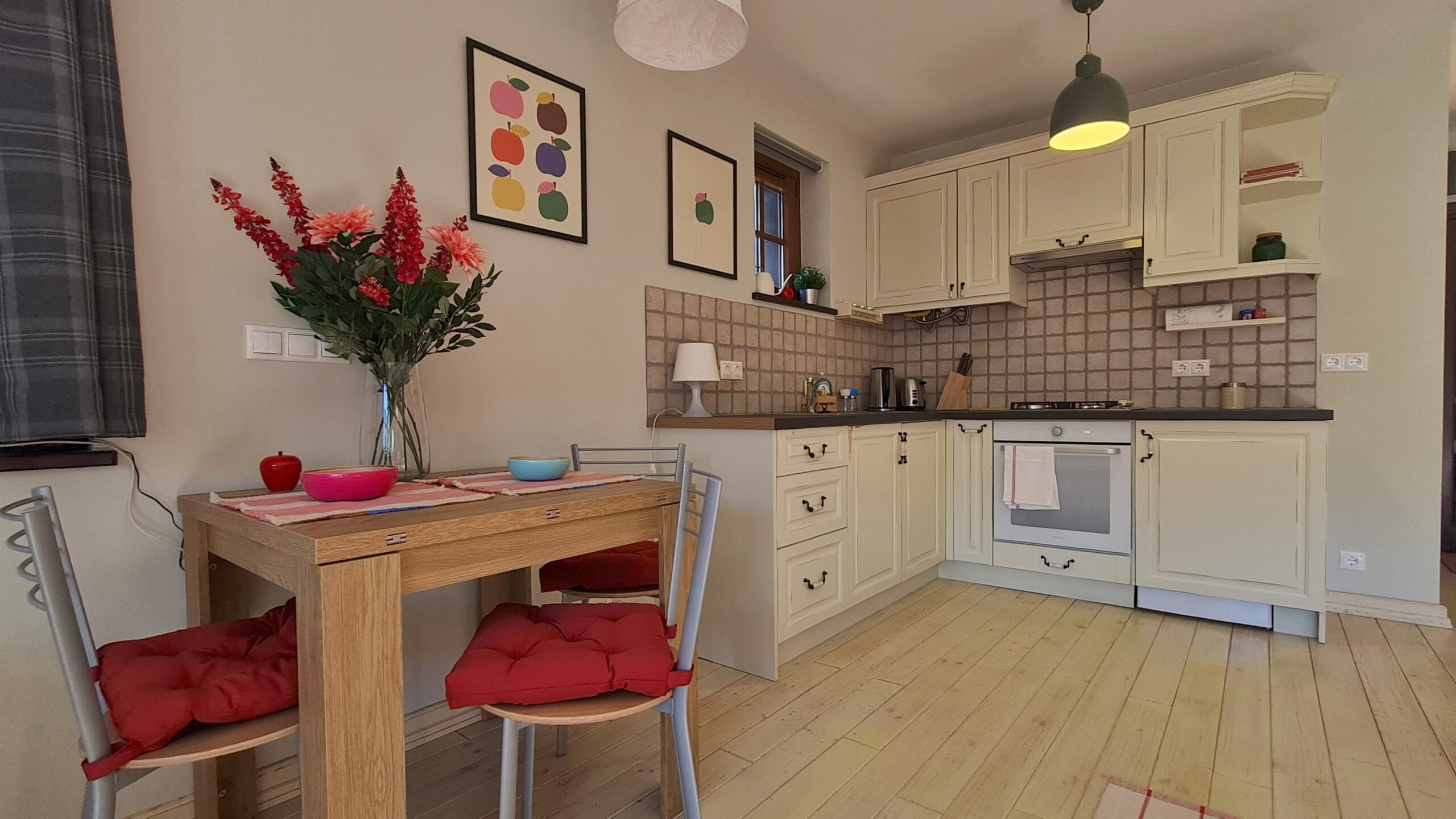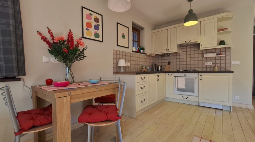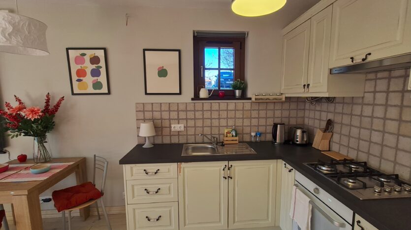 The property is finished with high quality materials: solid wood floors , luxuriosly finished bathroom with stone tiles, custom-made, solid wood kitchen with quality appliances and beautiful log fireplace.